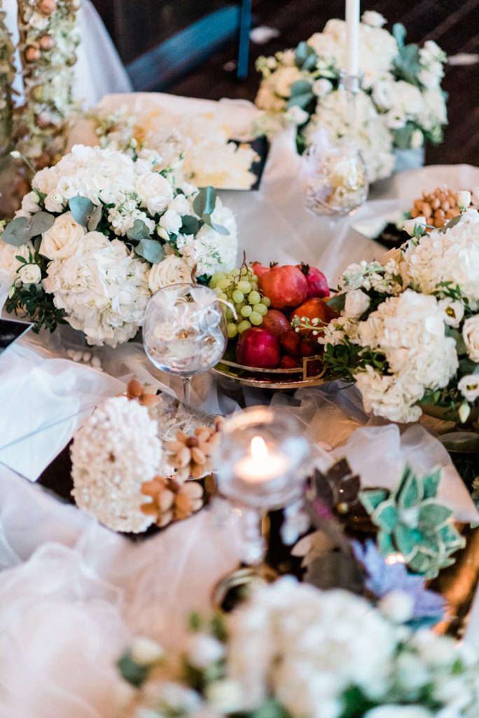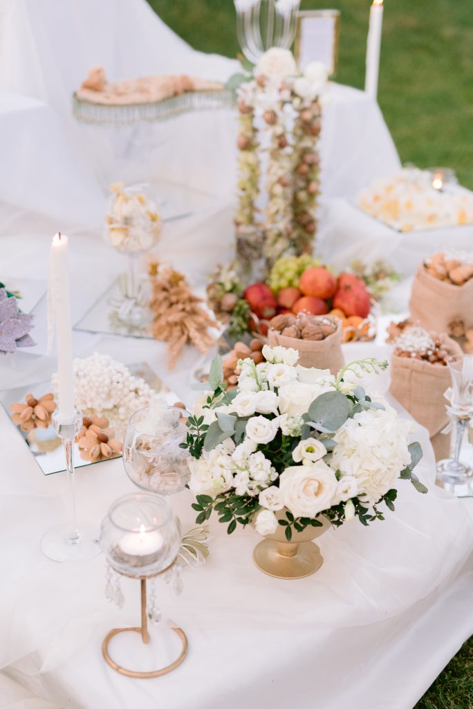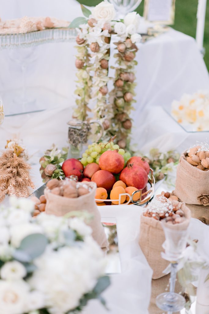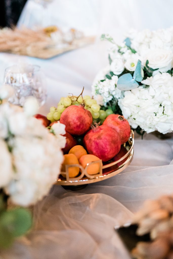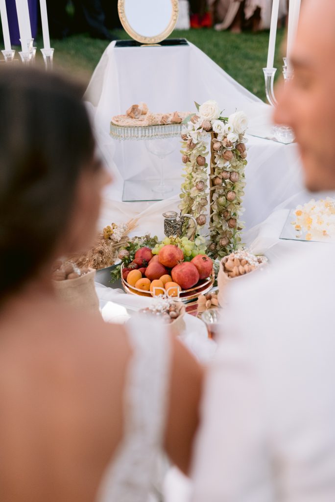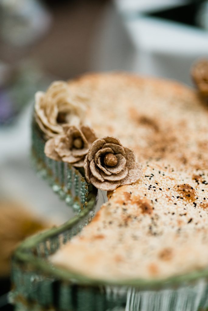 A decorative display of flatbread “noon-eh-sangak” symbolizes prosperity for the feasts and couple’s life together. It can be accompanied with feta cheese “noon-o-panir” and fresh herbs.