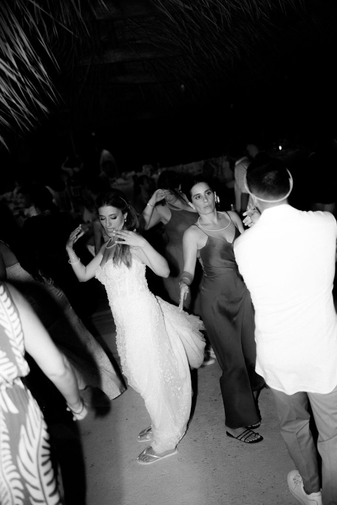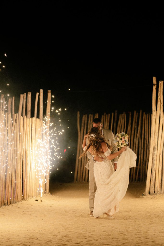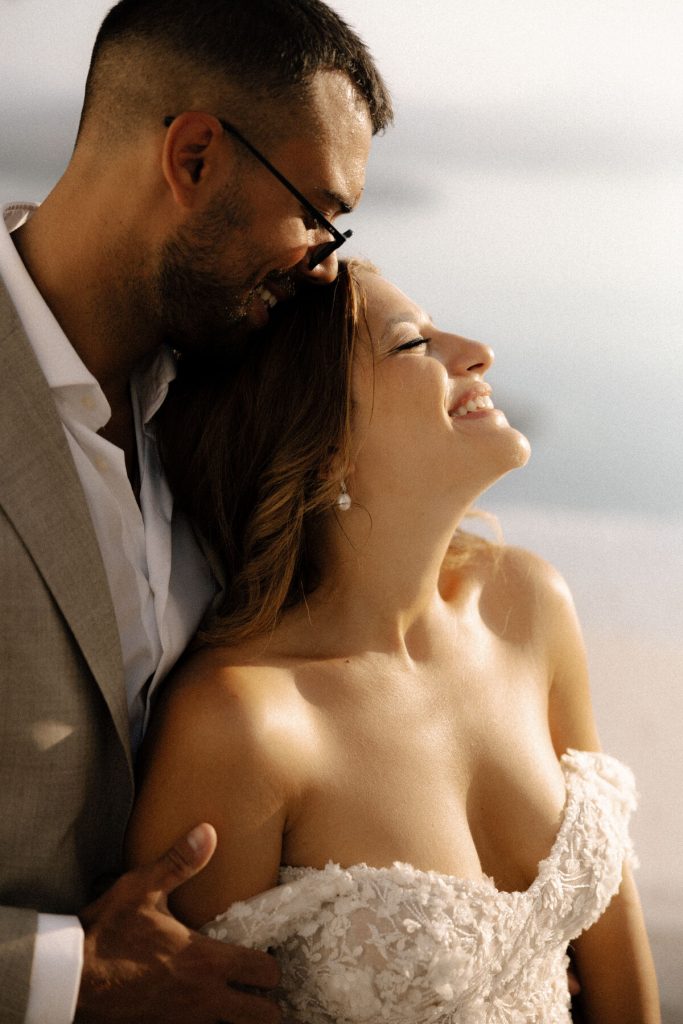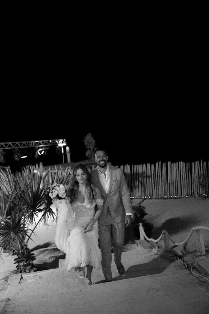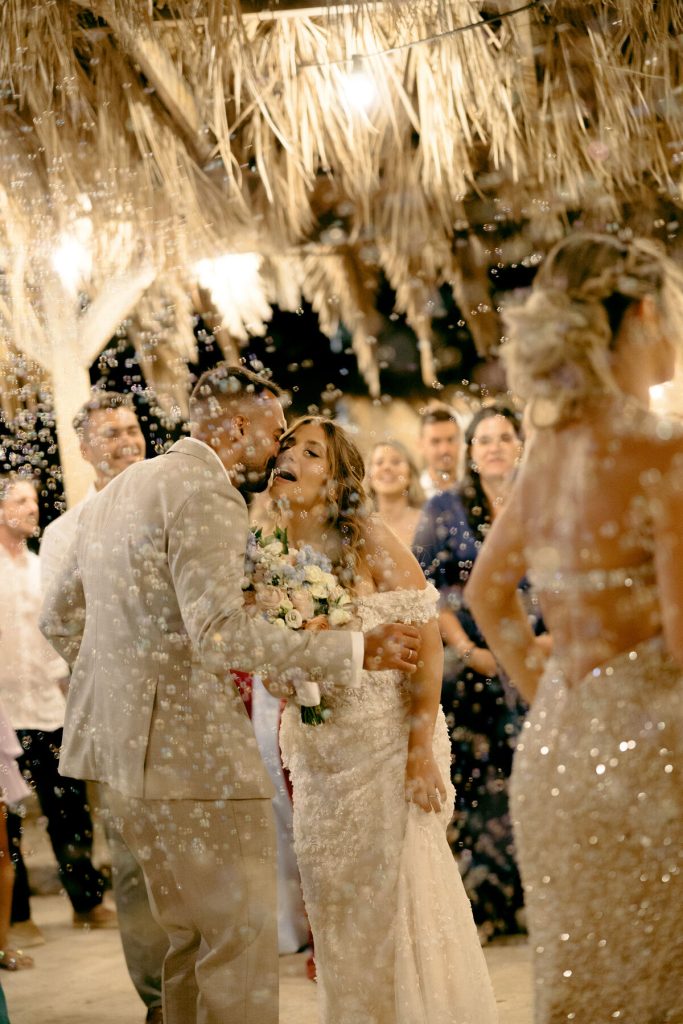 Following the heartfelt ceremony, the celebration continued at a beach bar, where the transition from tradition to party was effortless. As soon as the first toast was raised, the venue transformed into the ultimate summer wedding celebration. Signature cocktails, a delicious Mediterranean feast, and party props set the tone for a night to remember. Friends and family danced barefoot in the sand, laughter echoed under the starlit sky, and the couple radiated happiness.