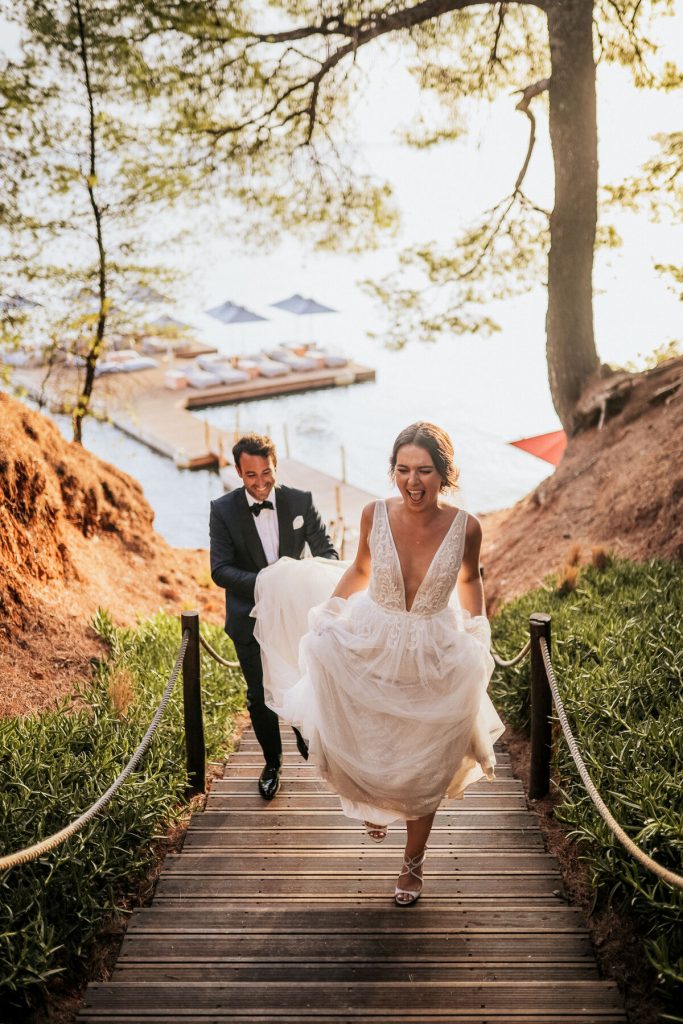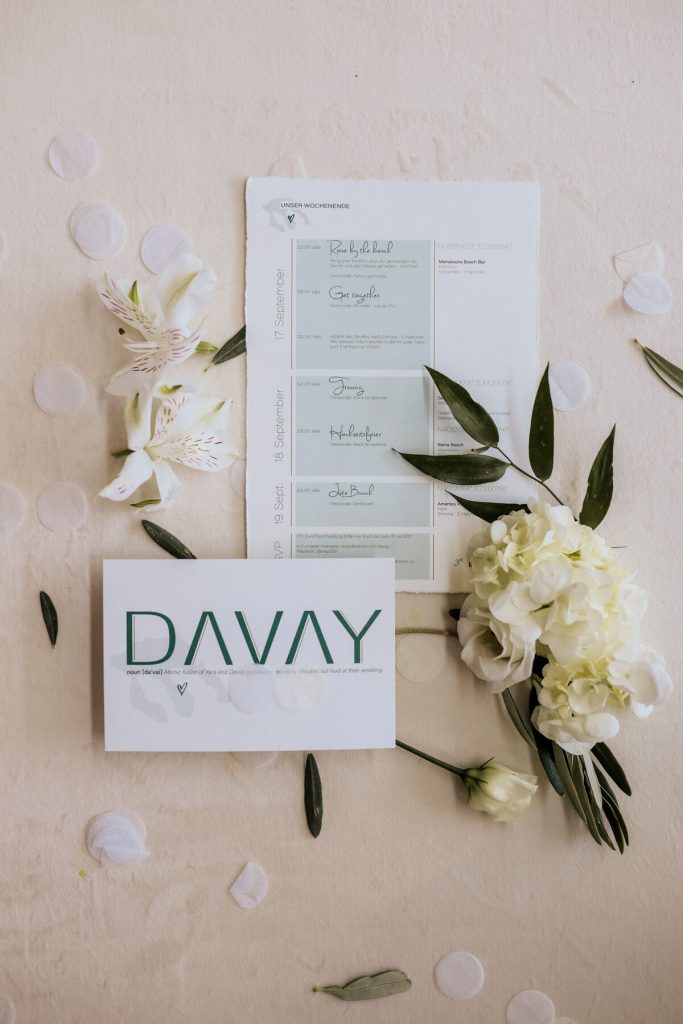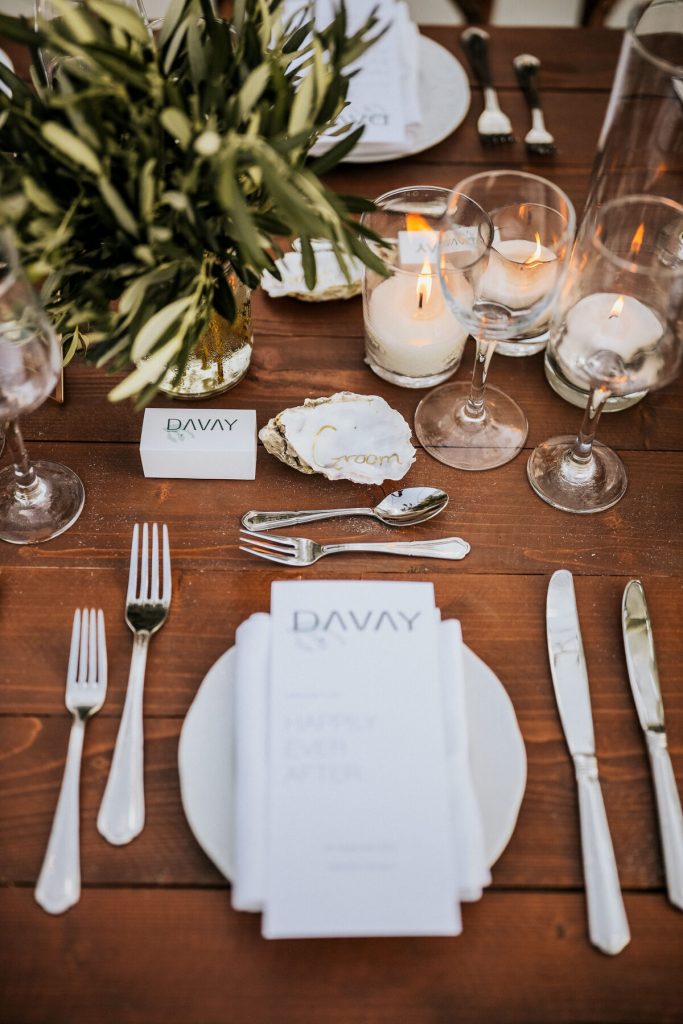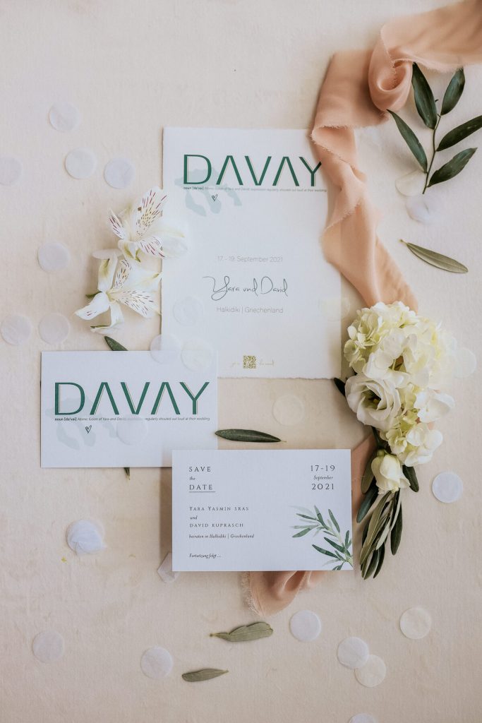 CHALKIDIKI was the region that first came into mind as the couple spend almost every year some summer days. Flying their loved ones from all across Greece and abroad the two sweethearts asked us to create a slew of experiences from trips, to tasting, to a pre-wedding all-white party up in a beach bar, to an unforgettable wedding party! Moto of the wedding was the couple’s logo and hashtag “DAVAY”.