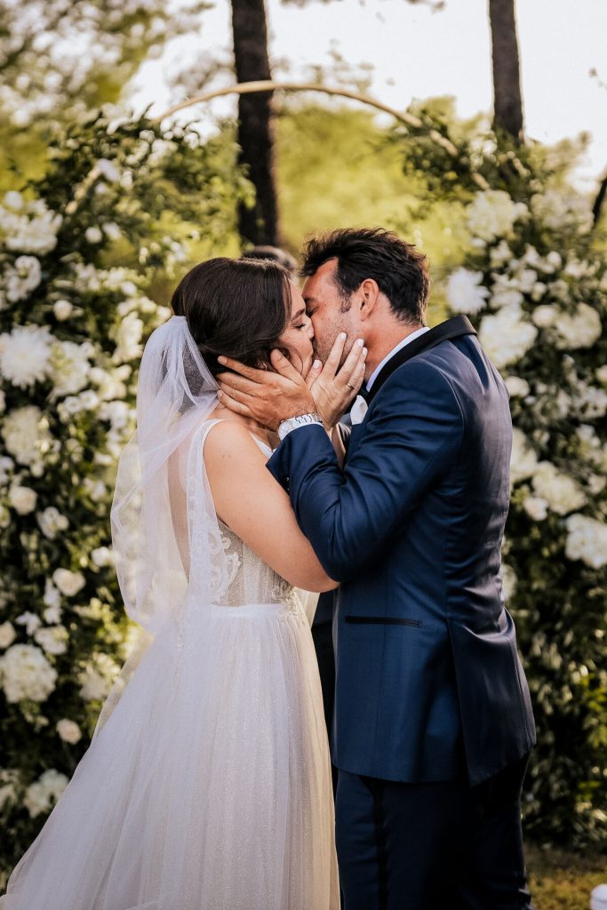 The beautiful couple had an outdoor ceremony at Amantes Villas accompanied by a jazz band and a crowd of friends and relatives. An unexpected rain delayed the ceremony, but everybody enjoyed a glass of wine, and nothing seemed to ruin their mood! After the ceremony, the couple enjoyed some champagne with the guests snapping portraits.