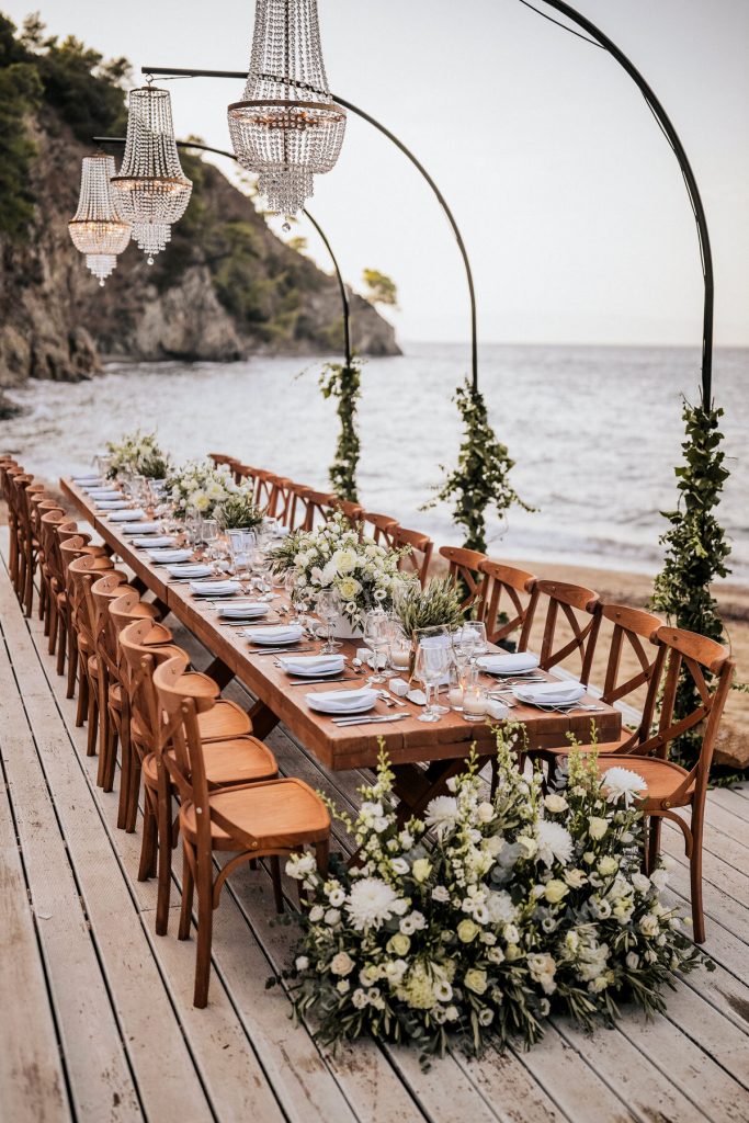 Bahia advertises itself as a modern and fresh restaurant by the sea, but they are modest about their excellent services and unique location. We set the scene on Bahia's wooden decks with long, rustic, family-style dinner tables and brought on the romance with white and greenery arrangements and stand-hook chandeliers trimmed with greenery.