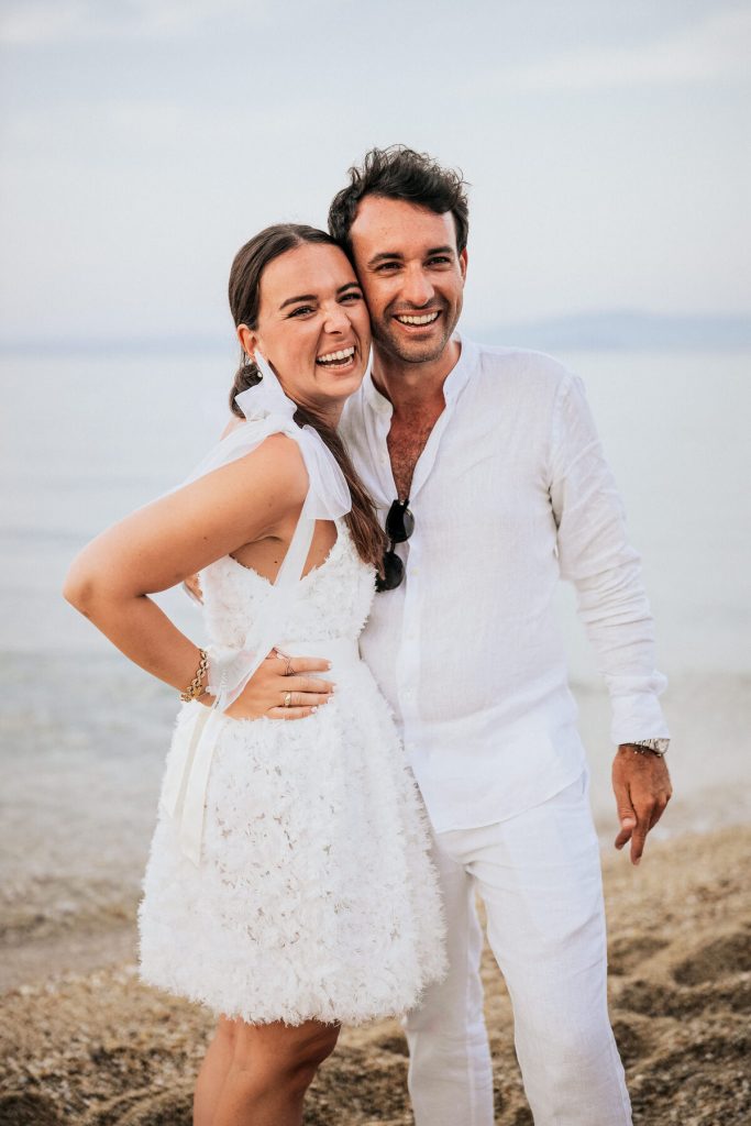 Their pre-wedding all-white party took place at Mamalouka Beach Bar, a hospitable environment by the beach with unique neutral decoration. It was a great opportunity for the couple to meet their guests, have fun and offer them a relaxed experience before the BIG DAY! The couple offered to their quests a custom beach towel with the wedding logo embroidered.
