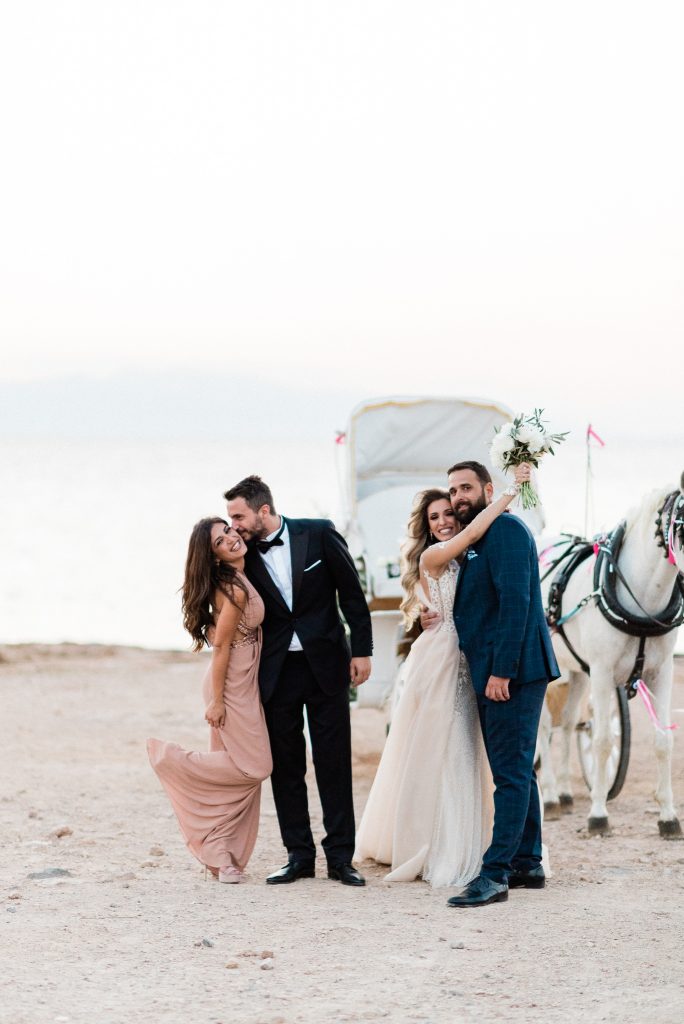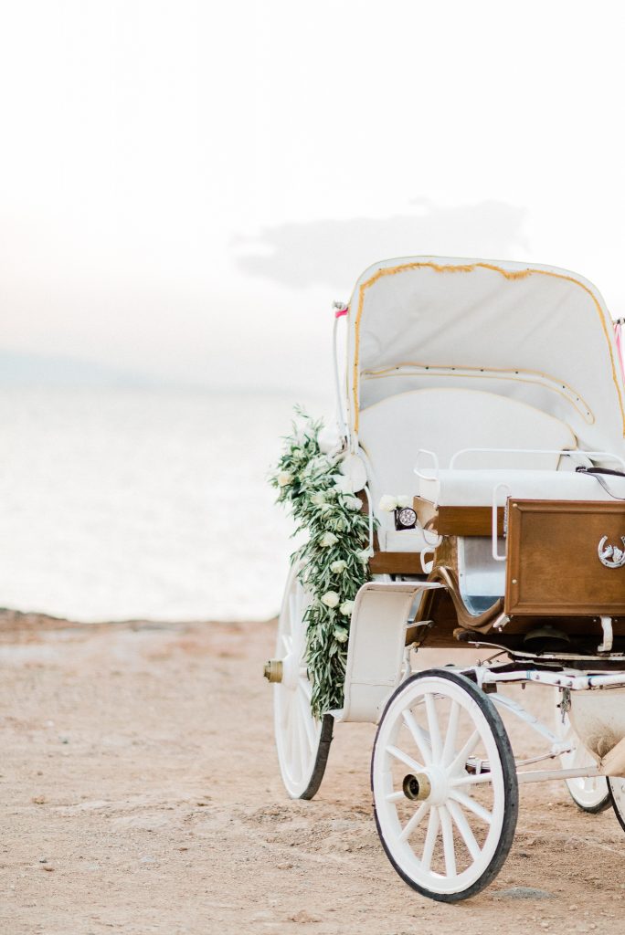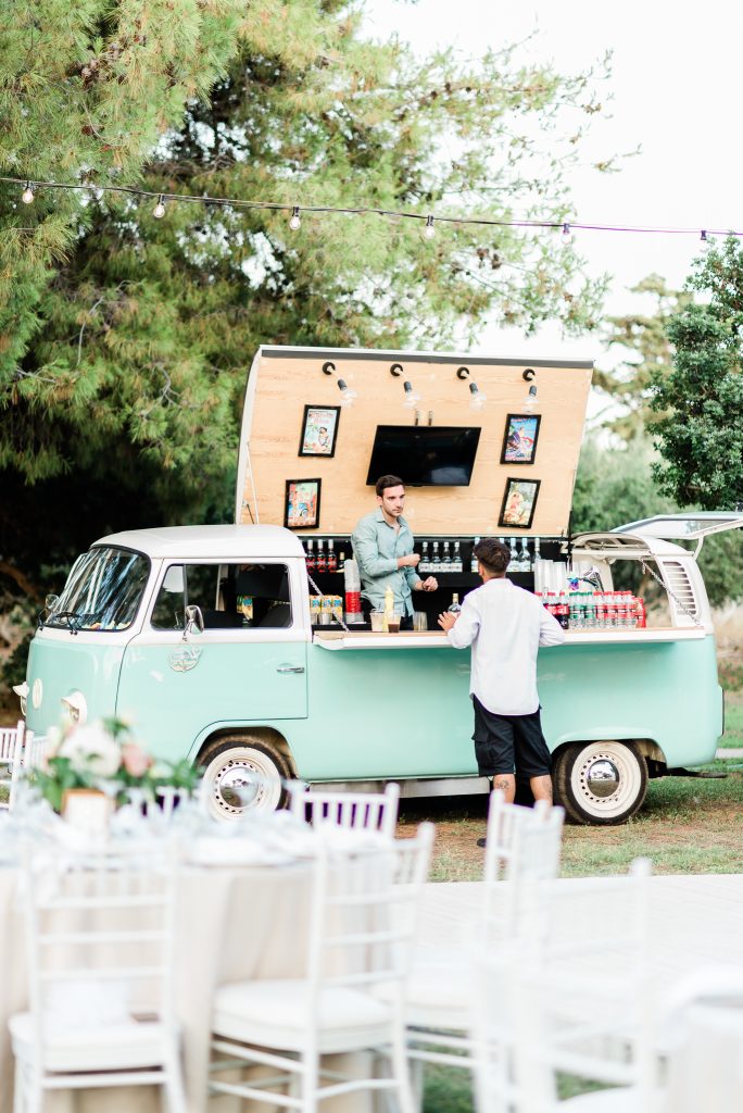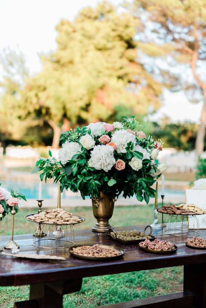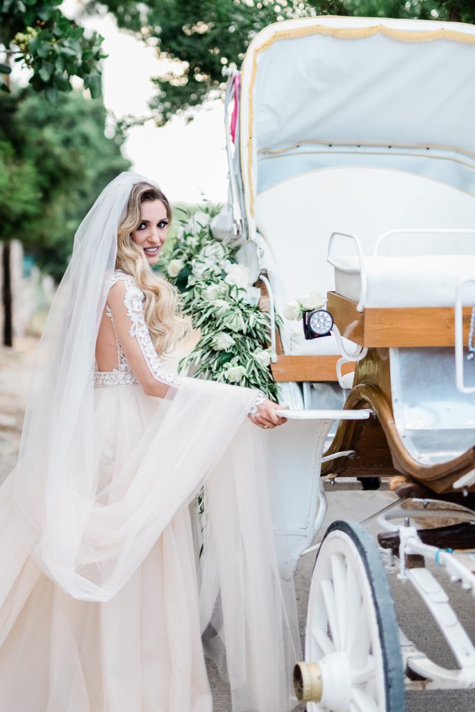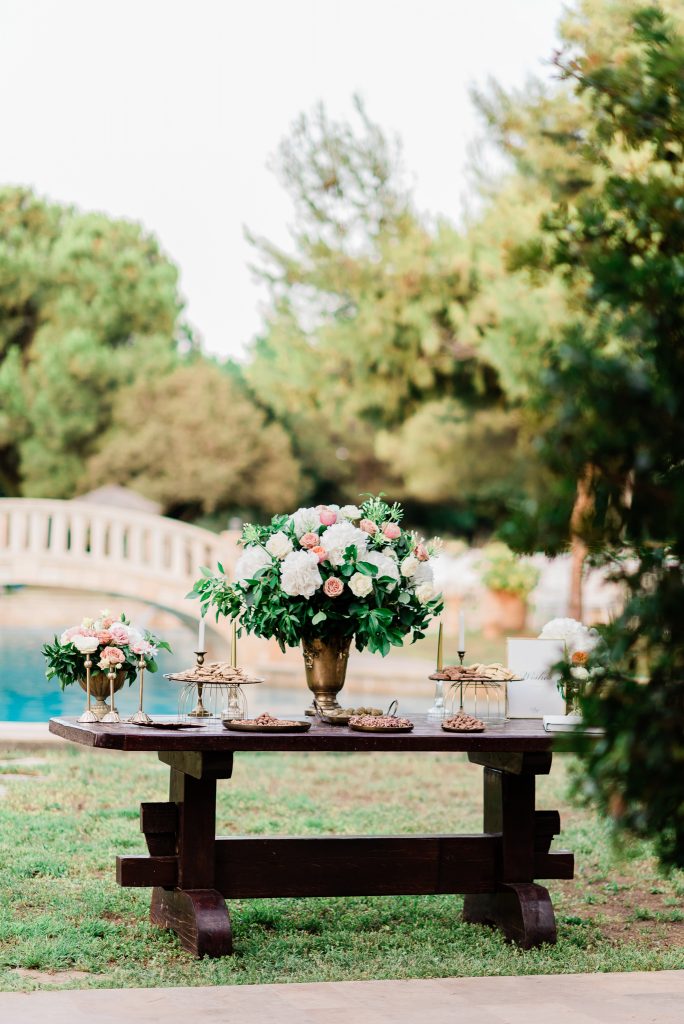 We choose a little church on the beach for the religious outdoor ceremony and for the reception Tower of Rallis was the perfect scenery for their party! And when the wedding is taking place in a Greek island then a traditional horse carriage is exactly what you should have! Inspired by the Island of Aegina Manousenia designed a clean, all white invitation perfectly matched with blush details. Keep it simple but yet elegant... Simple doesn't mean boring. With a clean look we created a unique style in a more subtle way with white hydrangeas, peonies, juliet david austin roses, cappuccino roses, lisianthus, olive brunches. To welcome the quests we used local products made of pistachio. A Cocktail Van Bar took it's place in front of the dance floor and it never stopped serving the most inspiring signature cocktails! Last but not least, Romeo, their dog, stole our hearts!