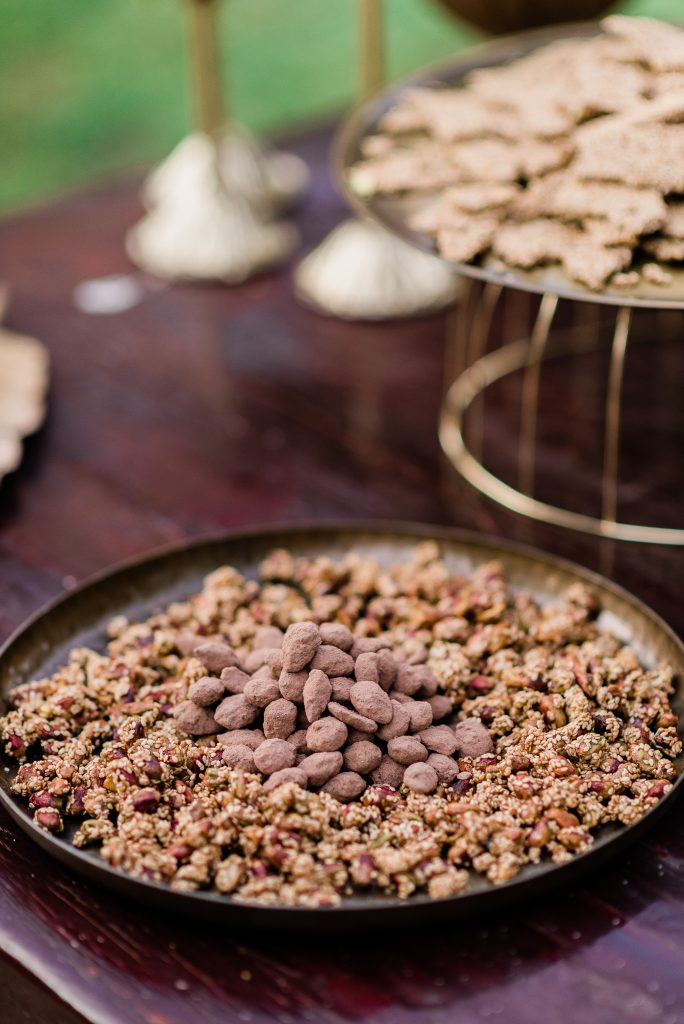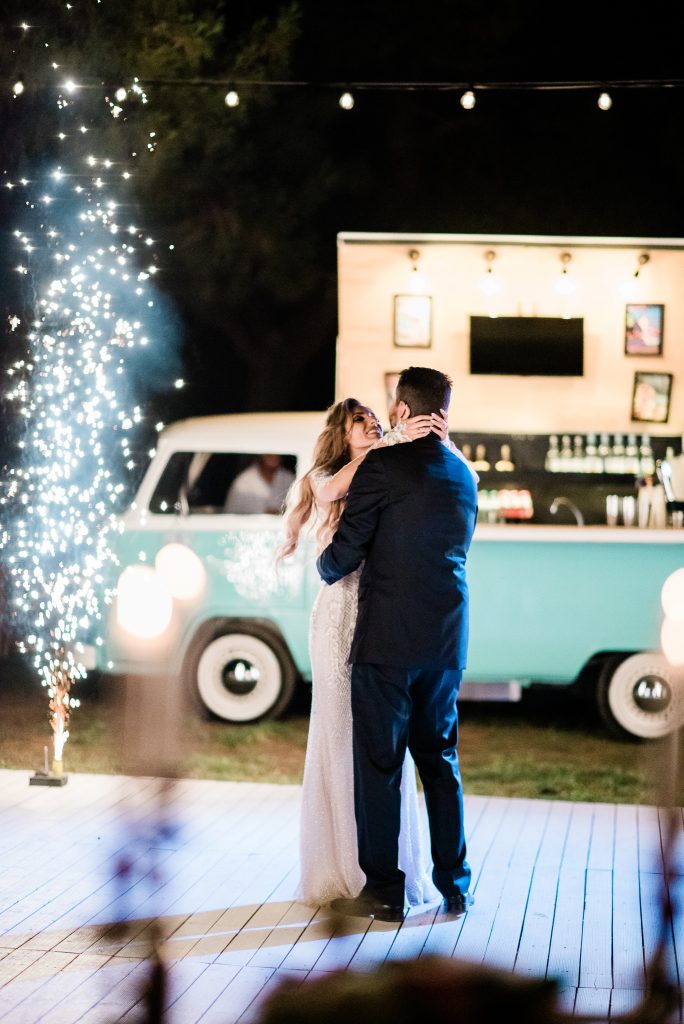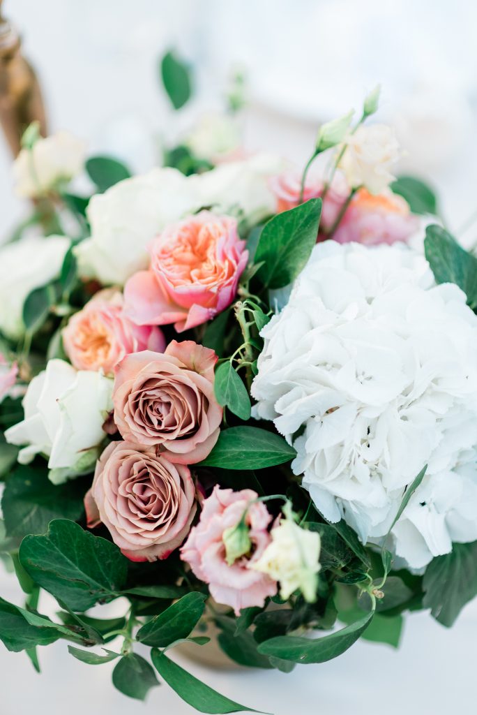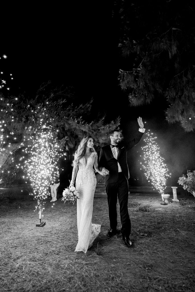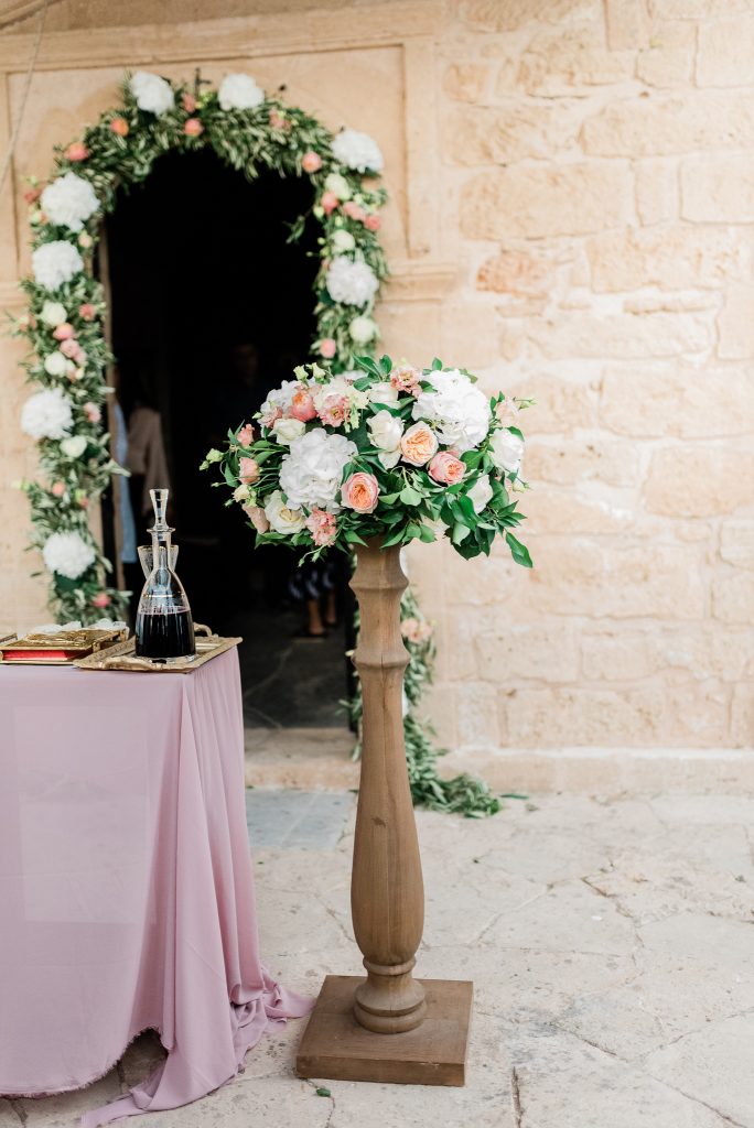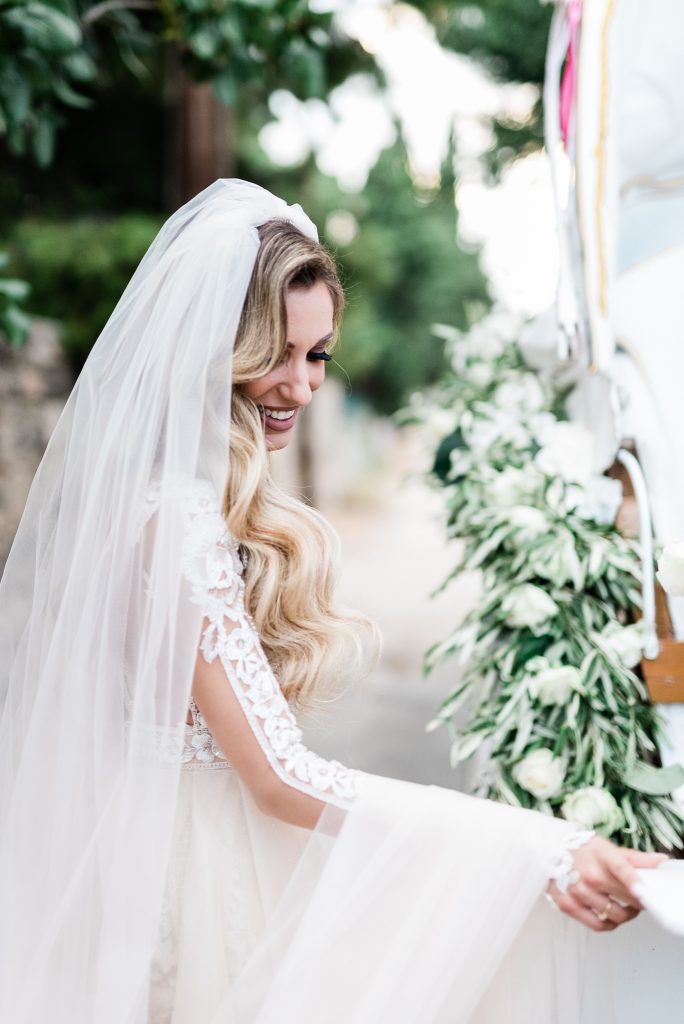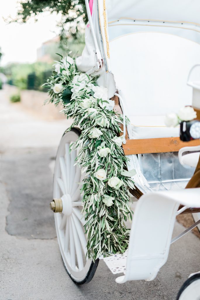 We choose a little church on the beach for the religious outdoor ceremony and for the reception Tower of Rallis was the perfect scenery for their party! And when the wedding is taking place in a Greek island then a traditional horse carriage is exactly what you should have! Inspired by the Island of Aegina Manousenia designed a clean, all white invitation perfectly matched with blush details. Keep it simple but yet elegant... Simple doesn't mean boring. With a clean look we created a unique style in a more subtle way with white hydrangeas, peonies, juliet david austin roses, cappuccino roses, lisianthus, olive brunches. To welcome the quests we used local products made of pistachio. A Cocktail Van Bar took it's place in front of the dance floor and it never stopped serving the most inspiring signature cocktails! Last but not least, Romeo, their dog, stole our hearts!