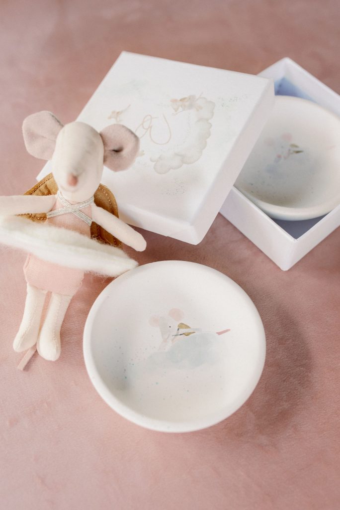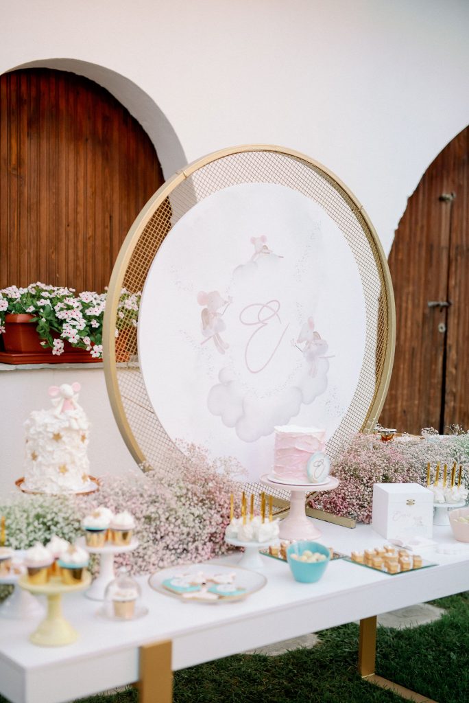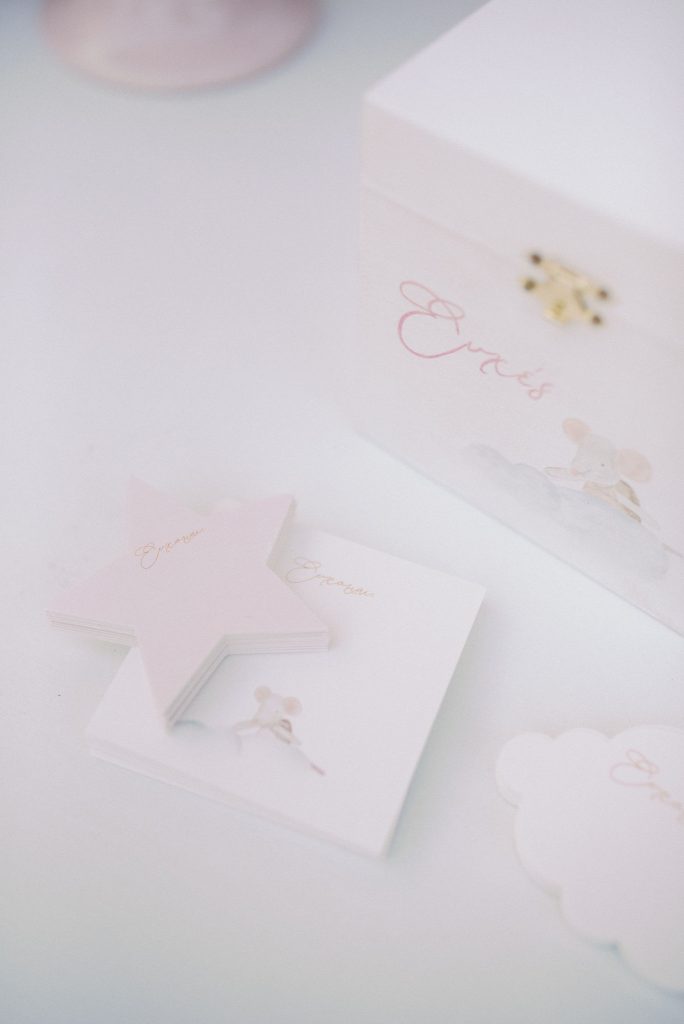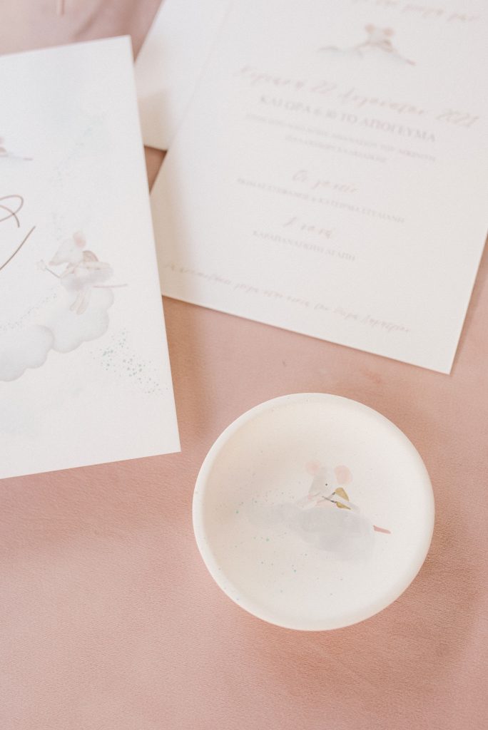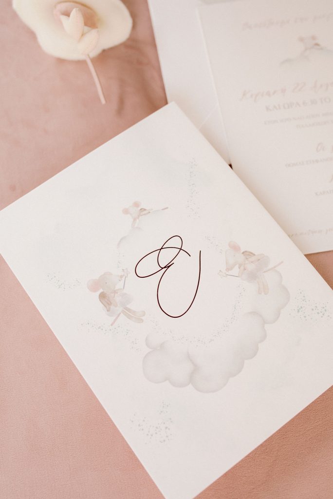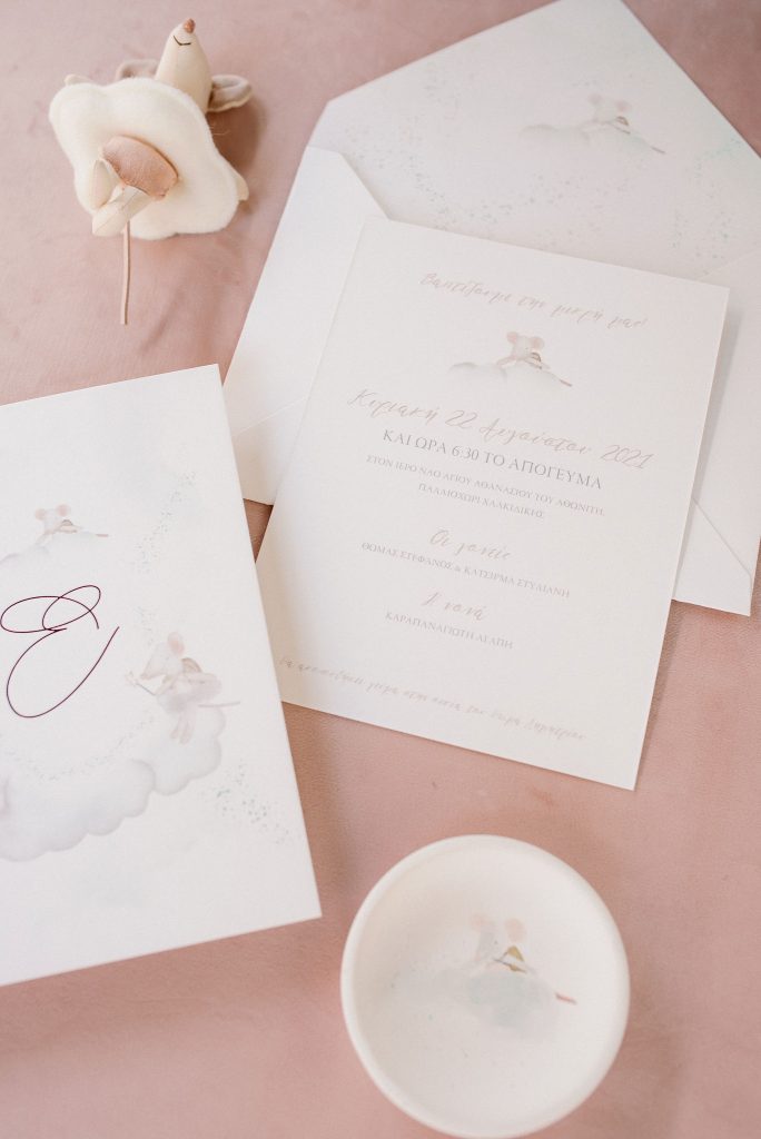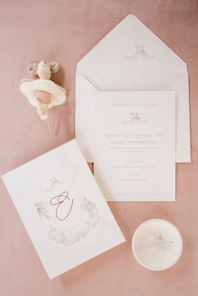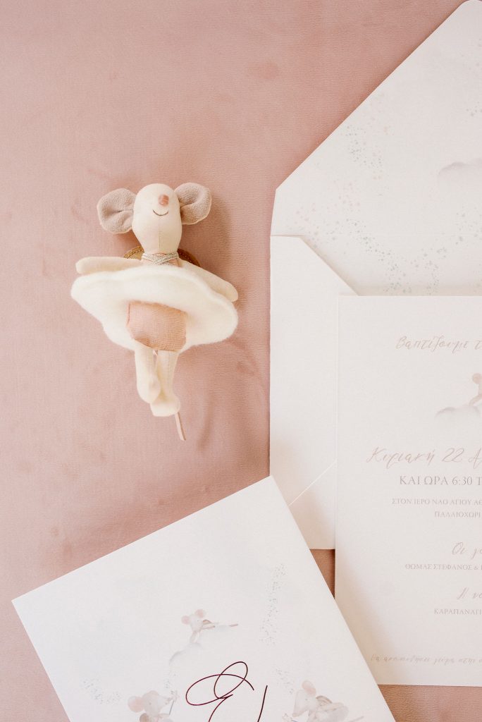 The inspiration for this christening was baby’s favorite toy, a miniature ballerina mouse by Maileg Company. Our talented graphic designer Manousenia, draw a magical stationery suite.