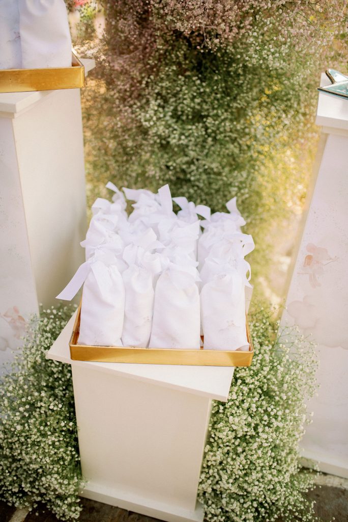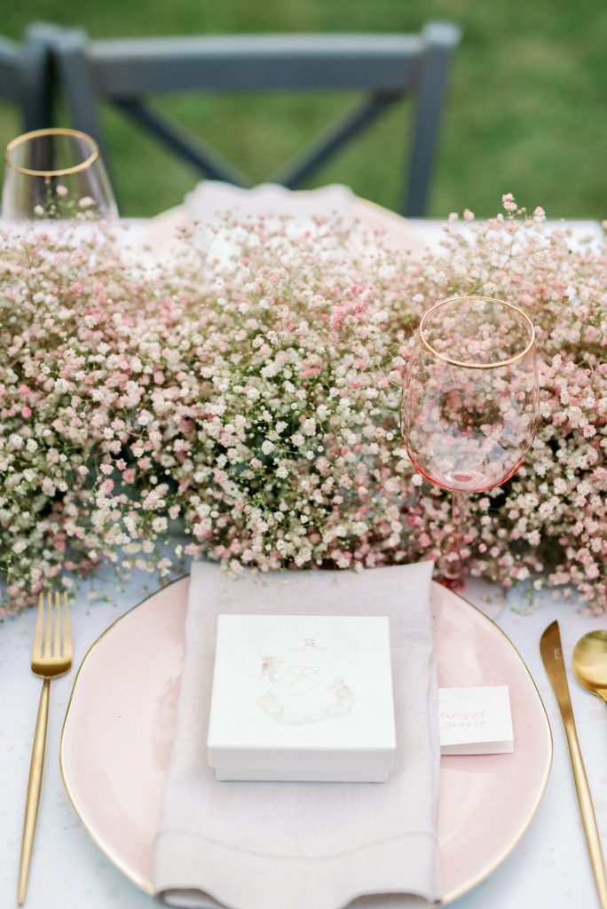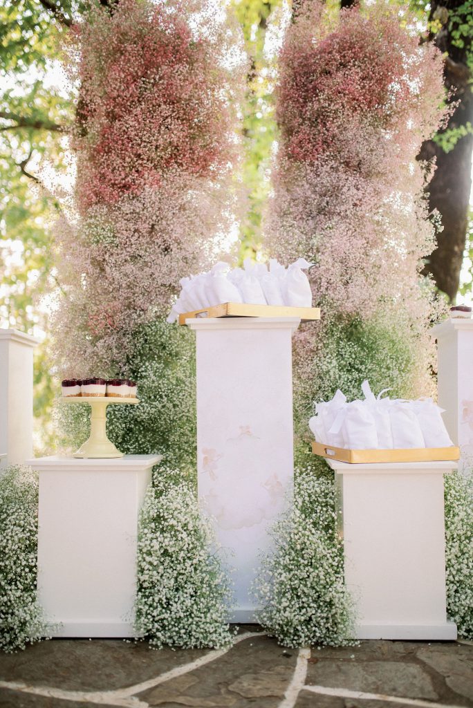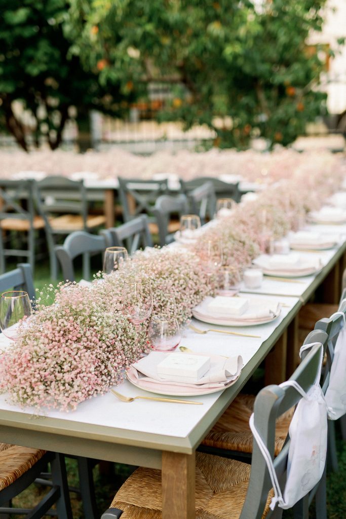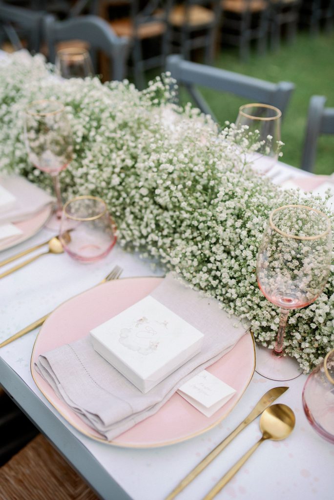 The church is located in a small village in Chalkidiki and the location is magnificent! We set up the dinner in the family’s backyard and it was so intimate with family and close friends. A large U-Shaped Dining Table was set up with a continuous floral garland with all shades of pink baby breaths. The result was so elegant and playfull. We used fine porcelain dinning , pink crystal drinkwares, gold cutleries that made the setting looks fabulous.