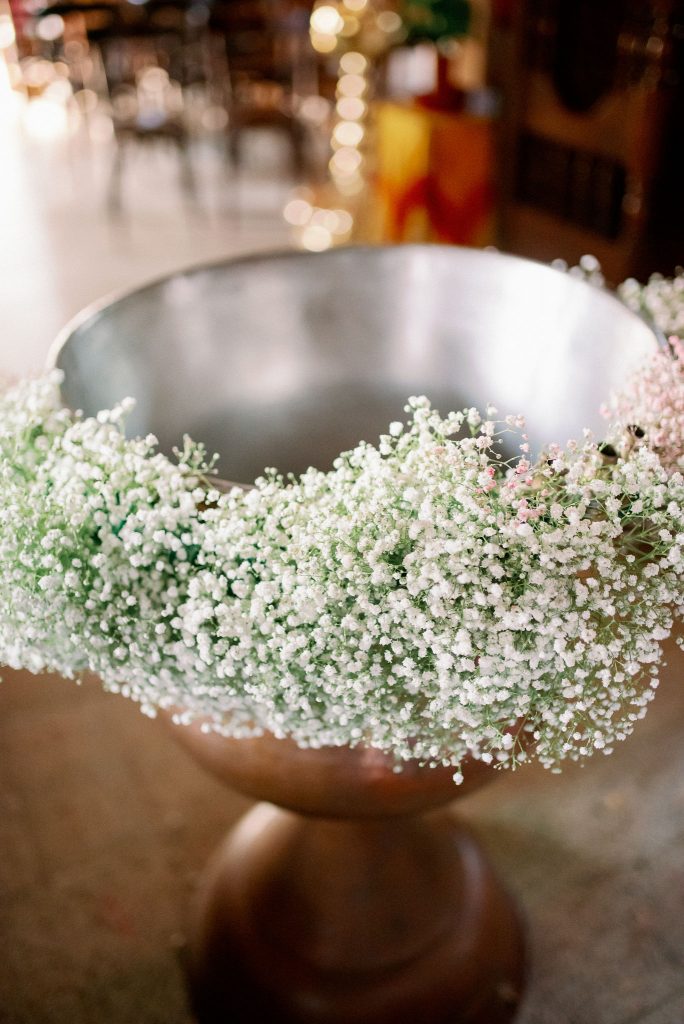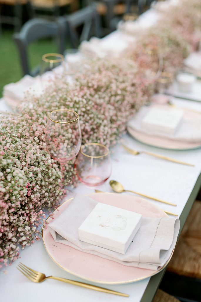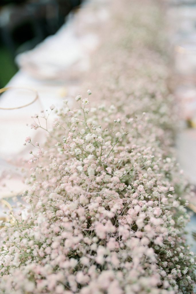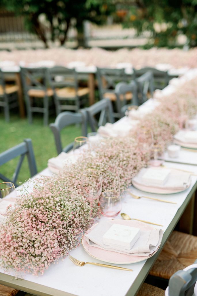 The large U-Shaped Dining Table, the hand-painted ceramic favors, the degrade flower garland of pink baby breaths, the live band.