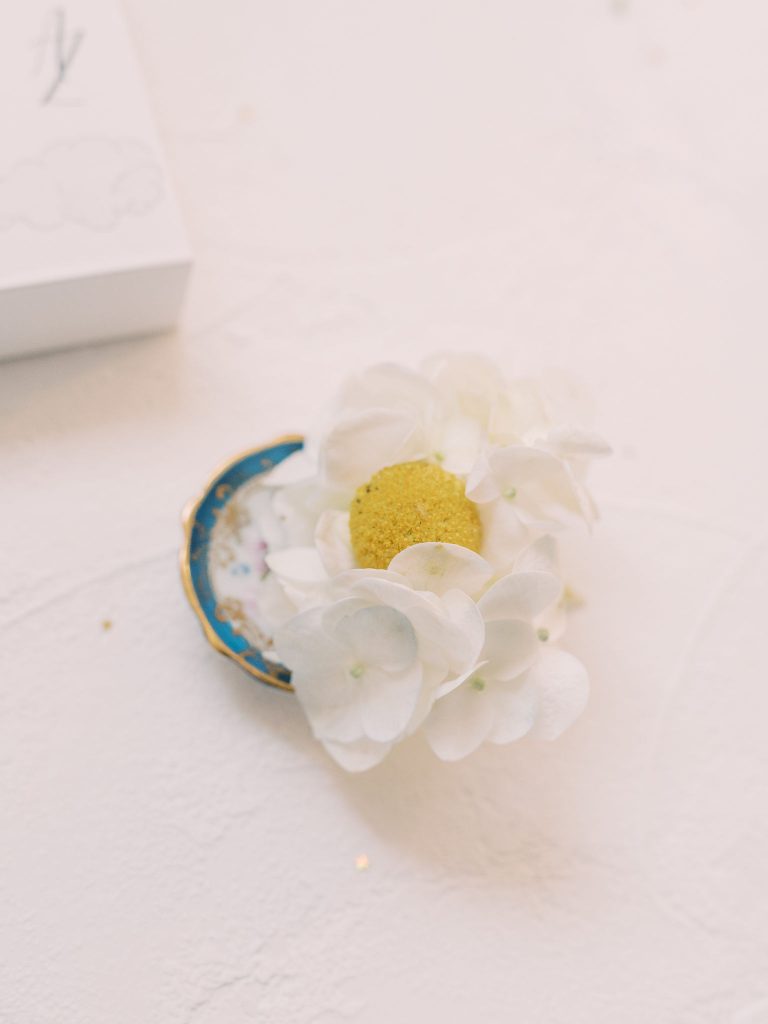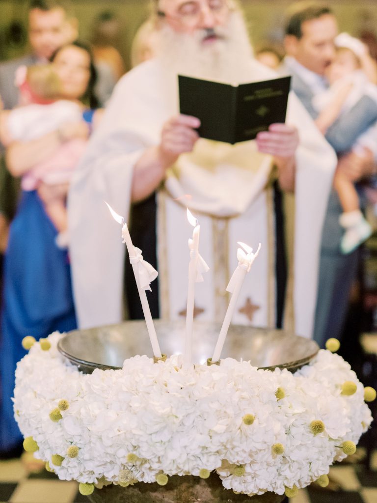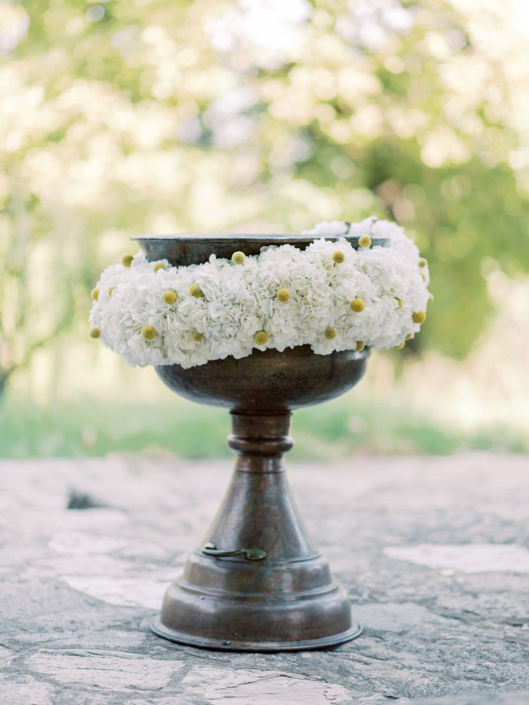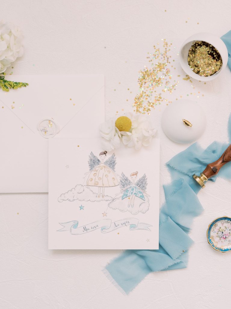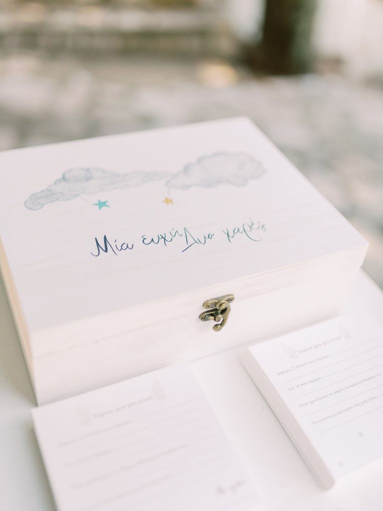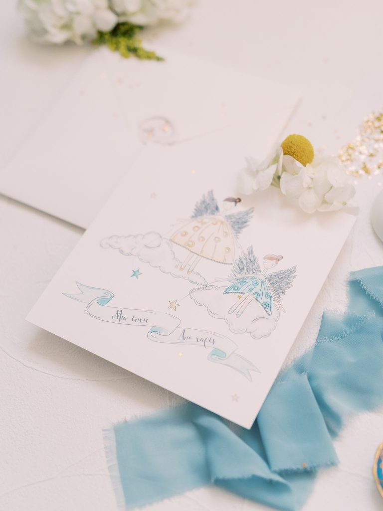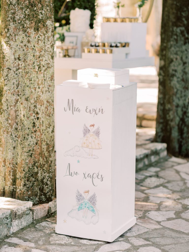 My sister asked for a concept that we could incorporate angels, as they have a special symbolism for us. Manousenia, my beloved talented graphic designer, draw a unique stationery suite. White, yellow and blue - our color palette. Hydrangeas and craspedia - the main flowers we used for the decoration.