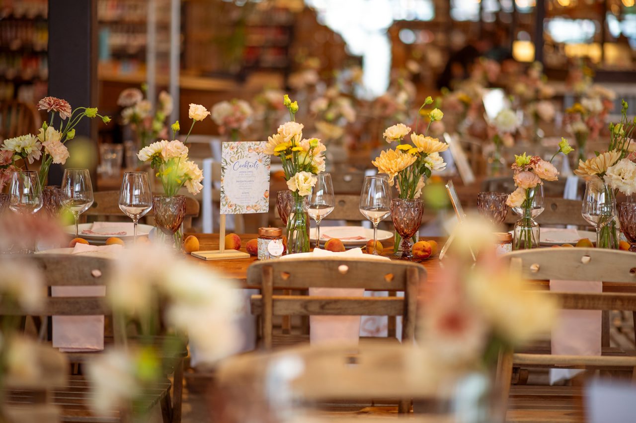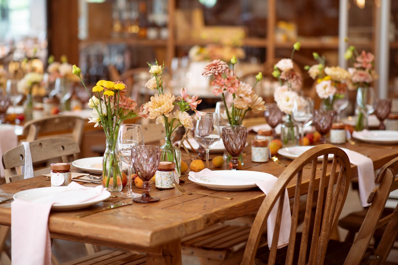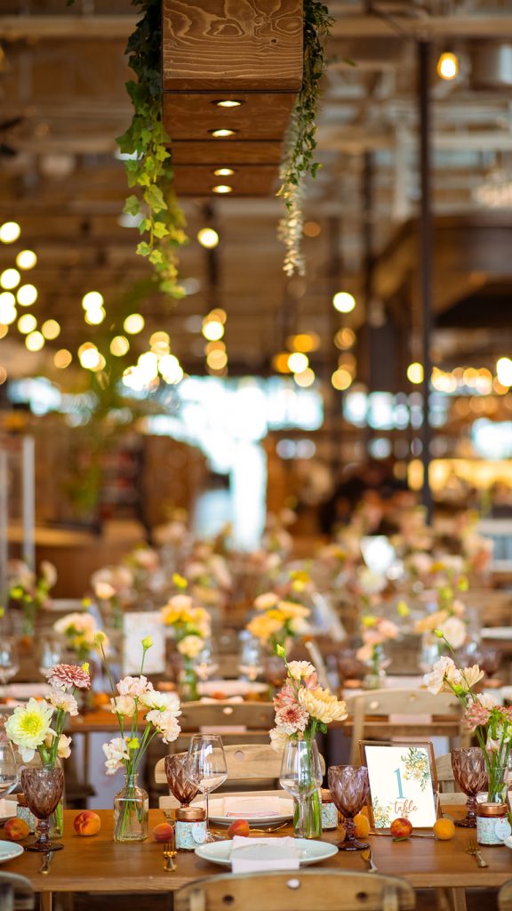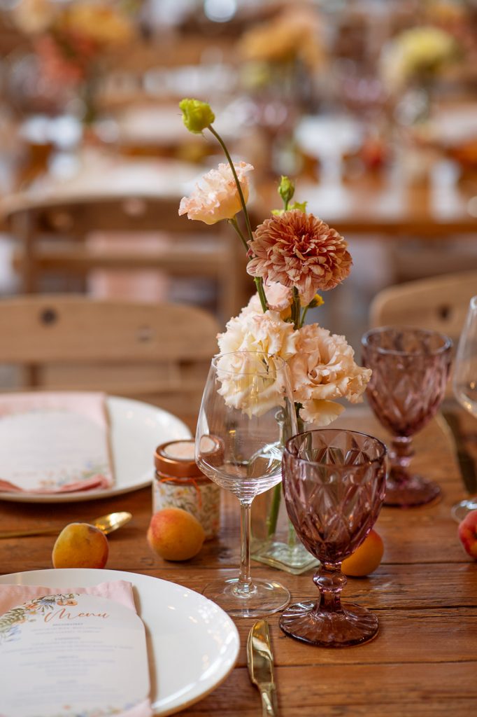 And beautiful Wood Guest Tables set with Elegant Apricot-inspired Table Settings!