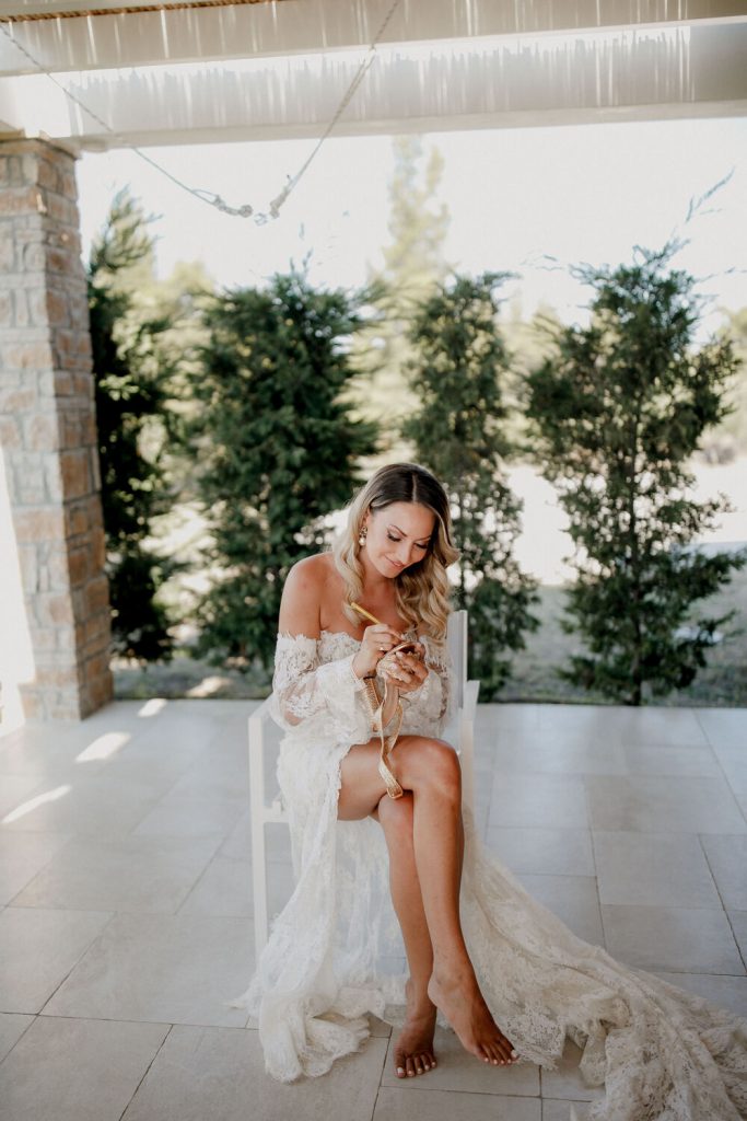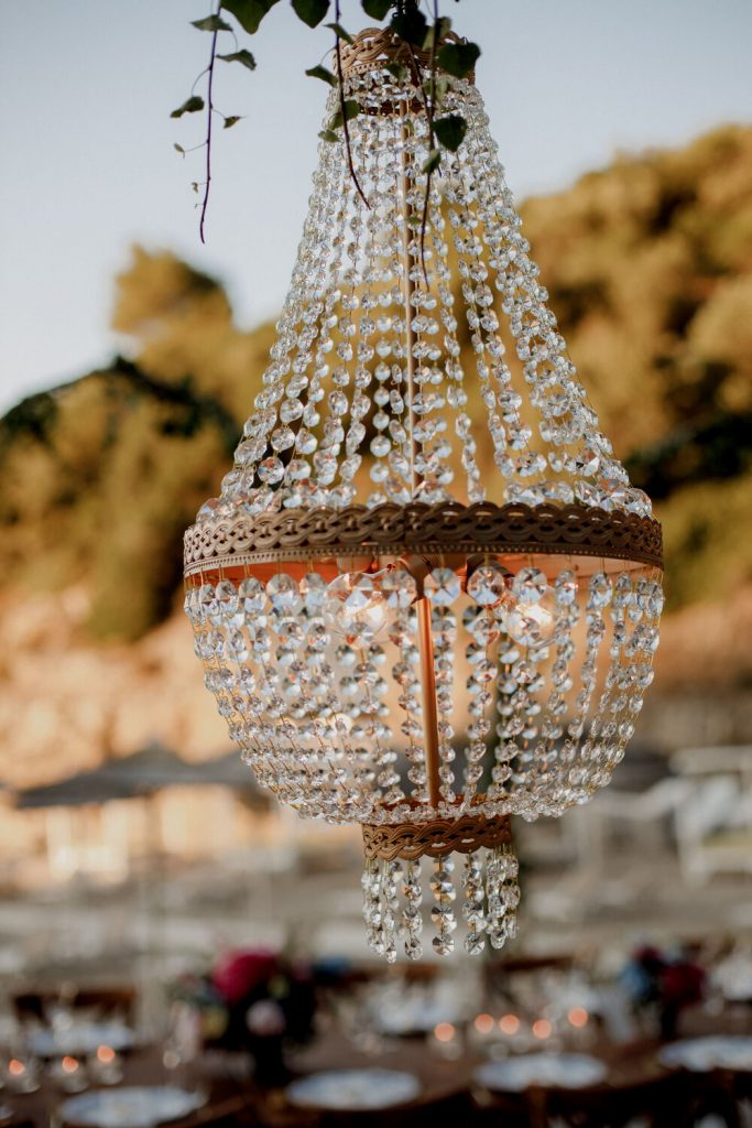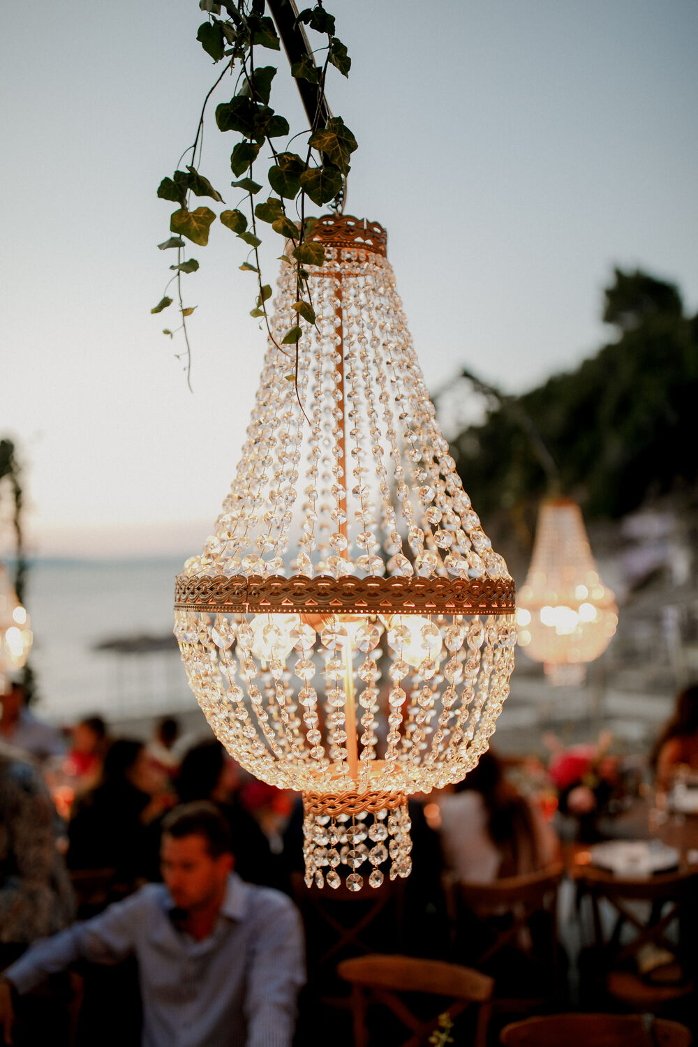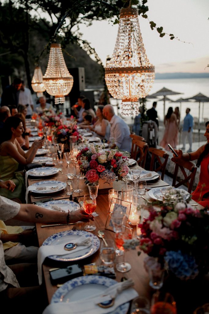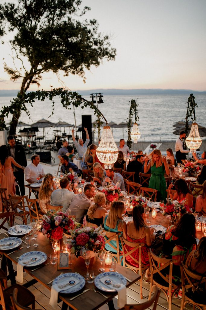 Sithonia was the region that first came into mind. Far from an umbrella-peppered resort, its sandy shores are an escapist's haven. Bahia advertises itself as a modern and fresh restaurant by the sea, but they are pretty modest about their excellent services and unique location. Ensconced at Meia Praia and overlooking the sand dunes, it had the perfect ambiance for what Maro and Vasilis envisioned. We set the scene on Bahia's wooden decks with long, rustic, family-style dinner tables and brought on the romance with colorful arrangements and stand-hook chandeliers trimmed with greenery.