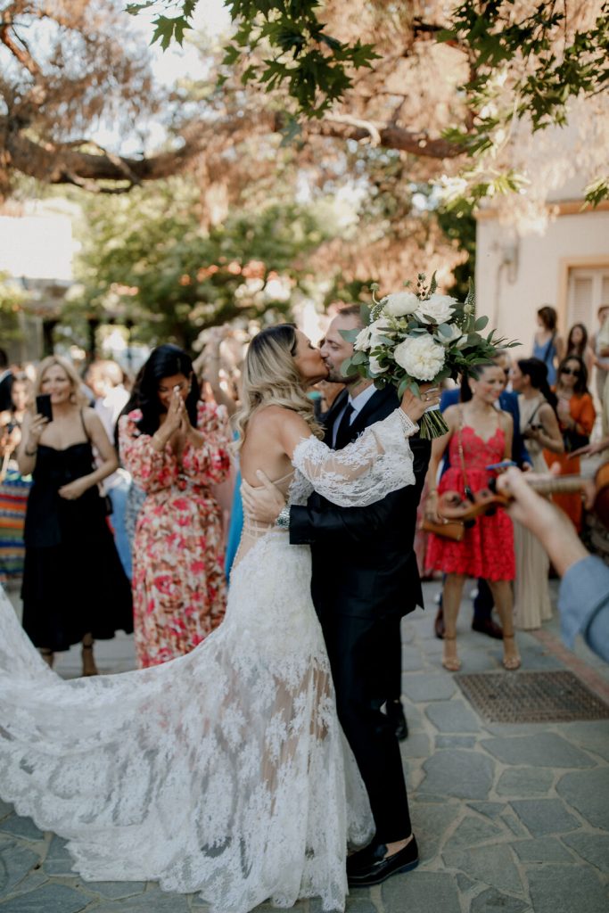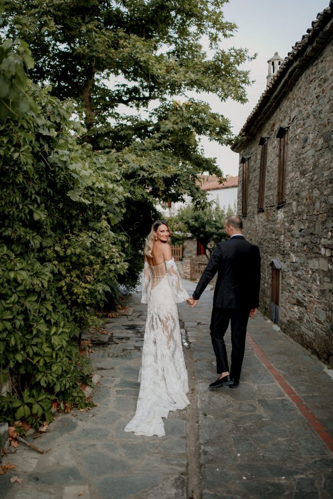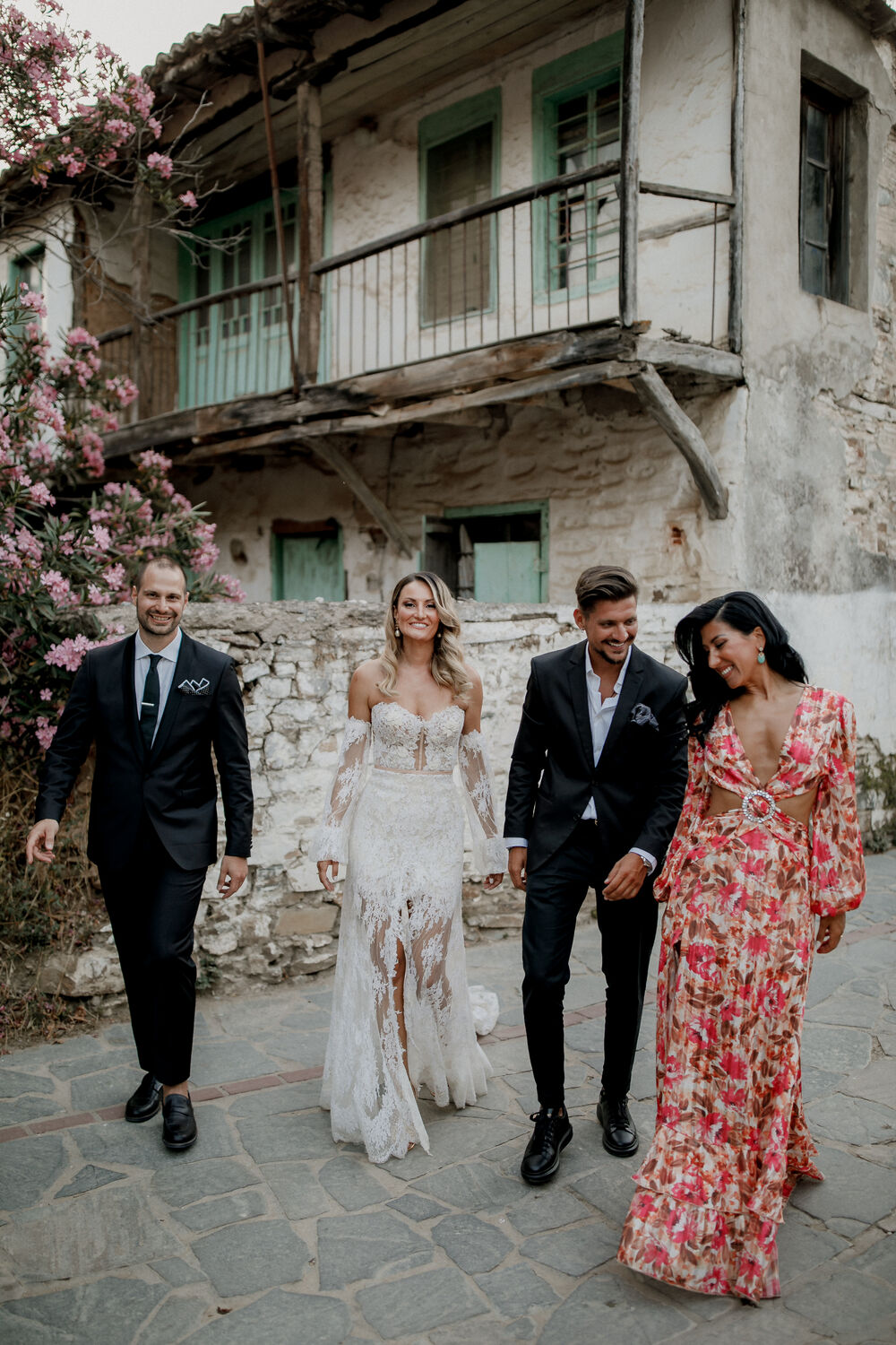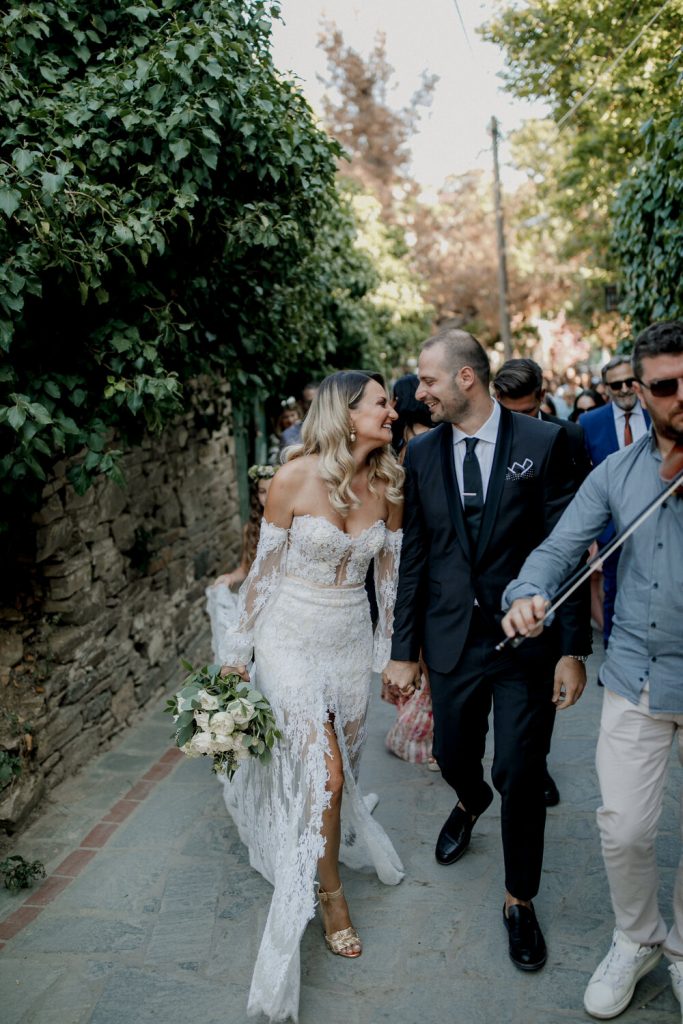 The beautiful couple had a church ceremony at the Old Nikiti village and walked down the aisle hand in hand, accompanied by folk musicians and a crowd of friends and relatives following their stride. Maro's one-of-a-kind Konidi dress - the bride co-designed it with the illustrious Greek wedding couturier- skirted the paved streets, and her long silhouette looked simply stunning. After the ceremony, the couple enjoyed some time alone, snapping portraits while everyone rode to the beach for some cocktails.