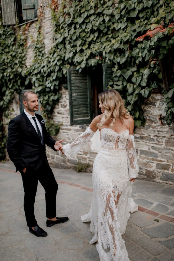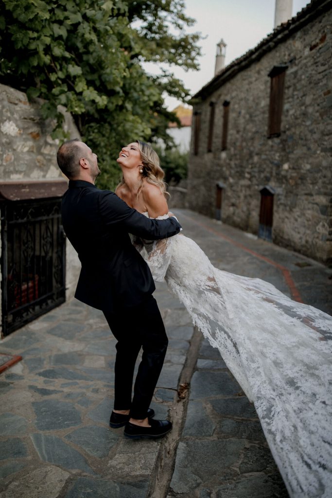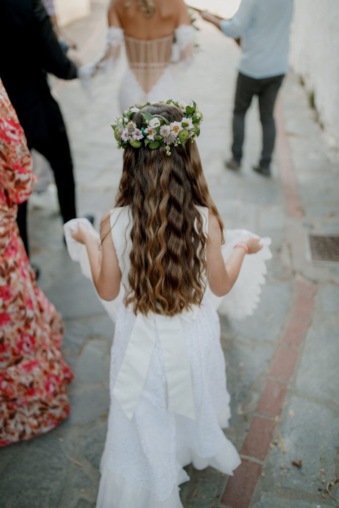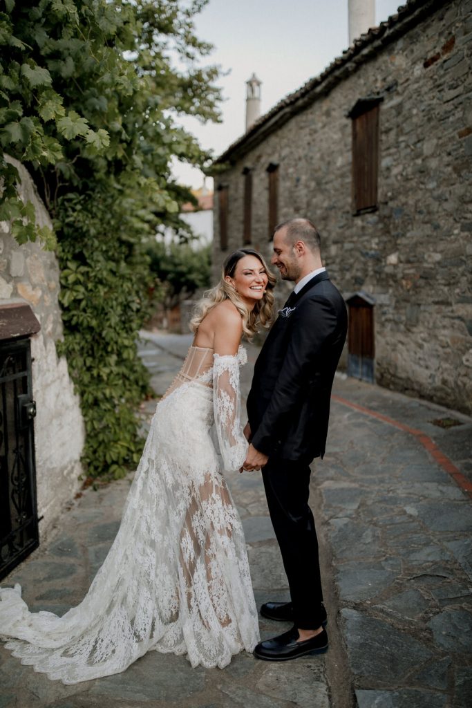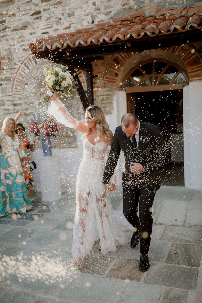 The beautiful couple had a church ceremony at the Old Nikiti village and walked down the aisle hand in hand, accompanied by folk musicians and a crowd of friends and relatives following their stride. Maro's one-of-a-kind Konidi dress - the bride co-designed it with the illustrious Greek wedding couturier- skirted the paved streets, and her long silhouette looked simply stunning. After the ceremony, the couple enjoyed some time alone, snapping portraits while everyone rode to the beach for some cocktails.