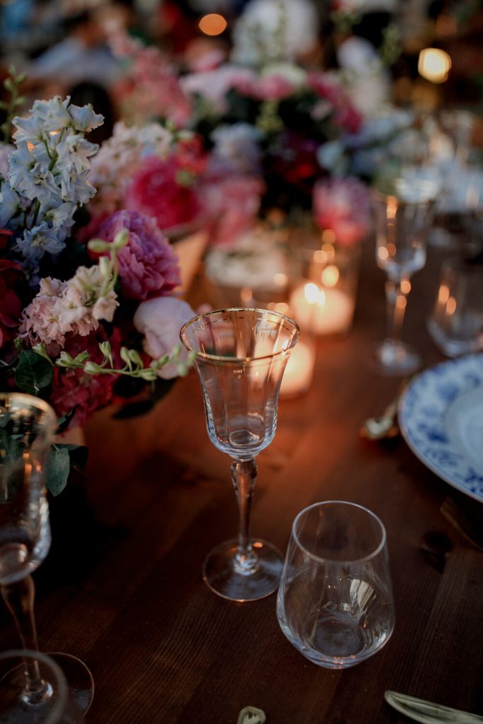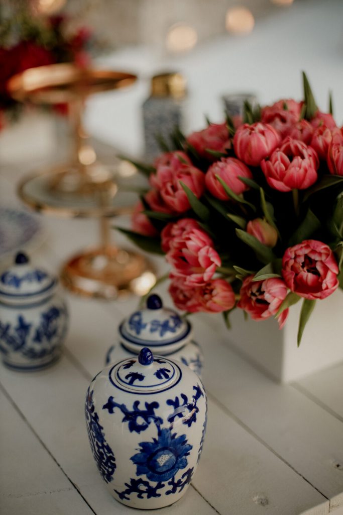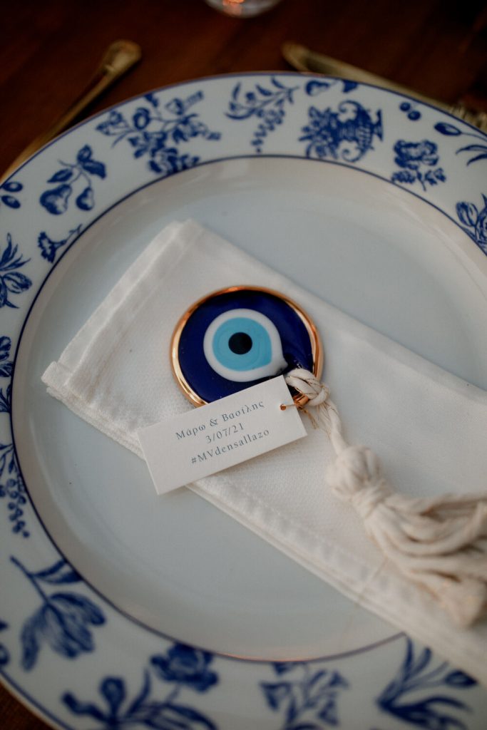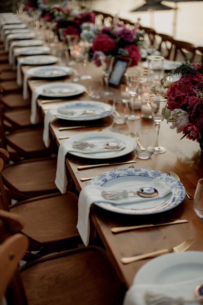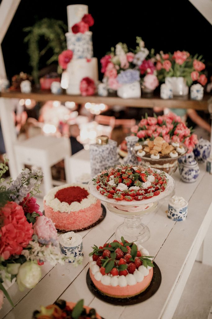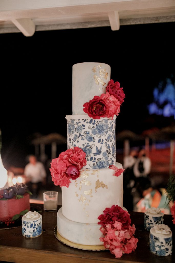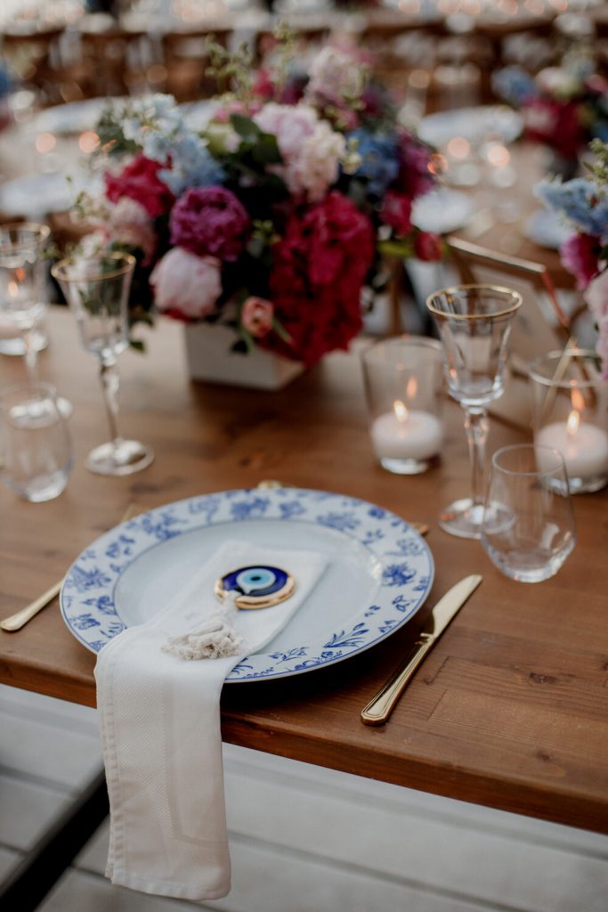 With the use of peonies, hydrangeas, tulips, larkspur, snapdragons, lisianthus garden roses, and delphiniums, the aesthetic Maro was looking for complimented the location. The centerpieces were placed in chinoiserie vases and paired beautifully to Vista Alegre Chintz Azul dinnerware, bell-shaped glassware, and white linen napkins. The couple's dessert bar was a spectacular array of strawberry-infused cakes and confections, while the four-tier wedding cake borrowed from the toile and the floral scheme. For their guests, the couple chose an evil-eye decorative piece.