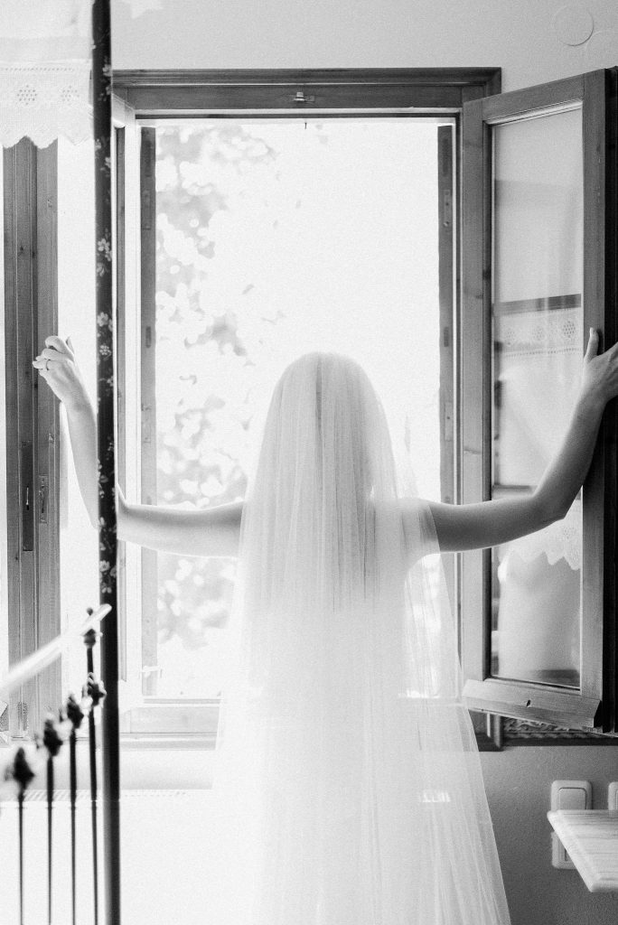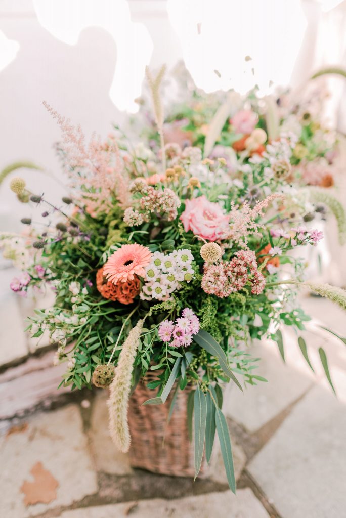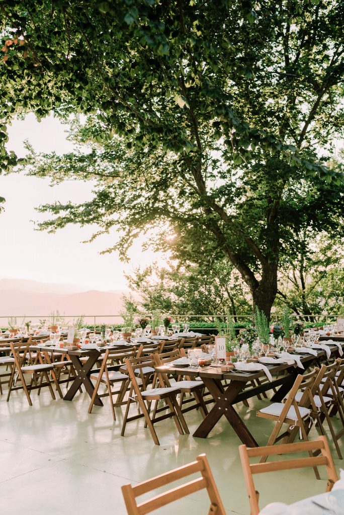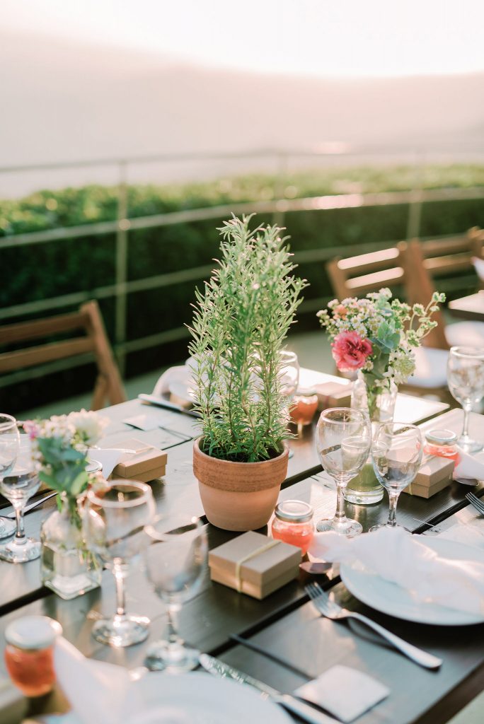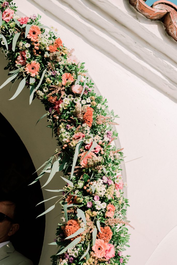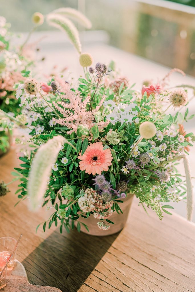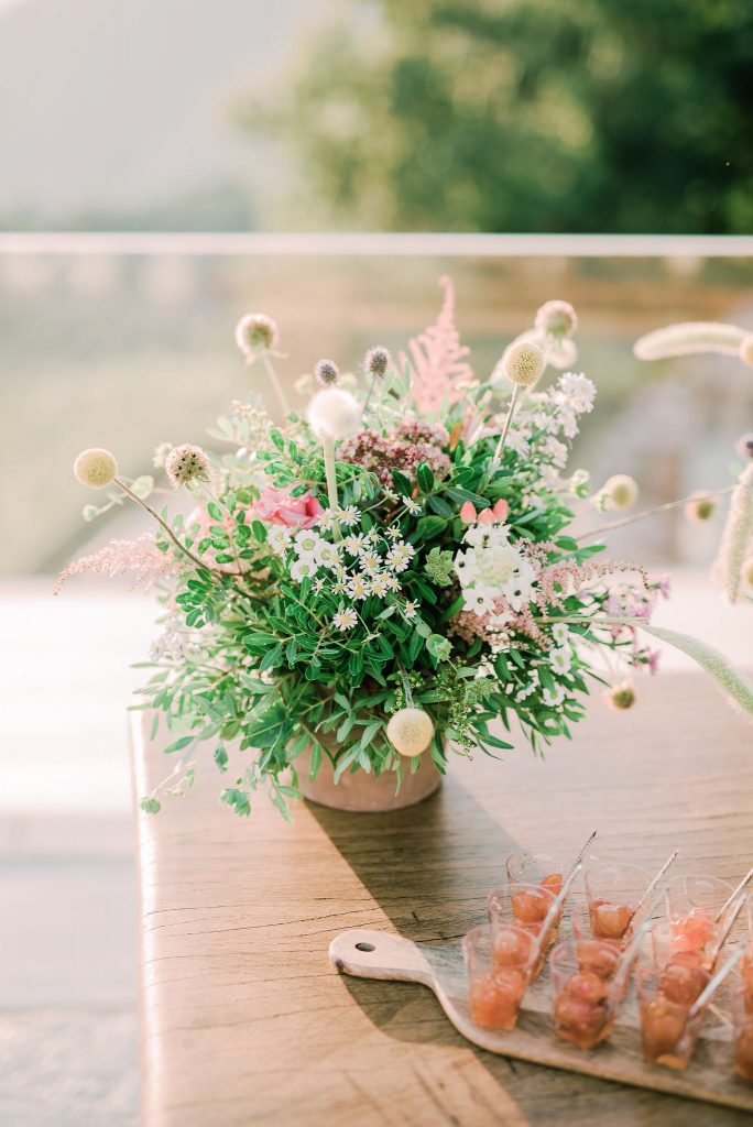 The big day for Kalliope began over an ornate 19th-century style villa where the bride and bridesmaids enjoyed some toasts before getting ready for the big walk down the aisle. For the wedding decor, Kalliope opted for exuberant blooms, wildflowers, and miniature buds paired to Gerbera daisies, Versilia Roses, Billy balls, Cockscomb Celosias, and purple scabiosa along with locally foraged foliage and waxflowers.