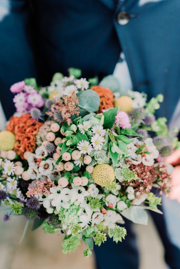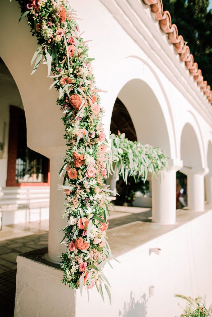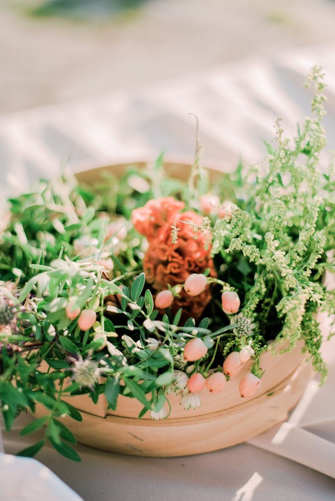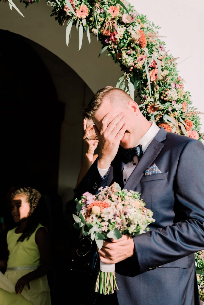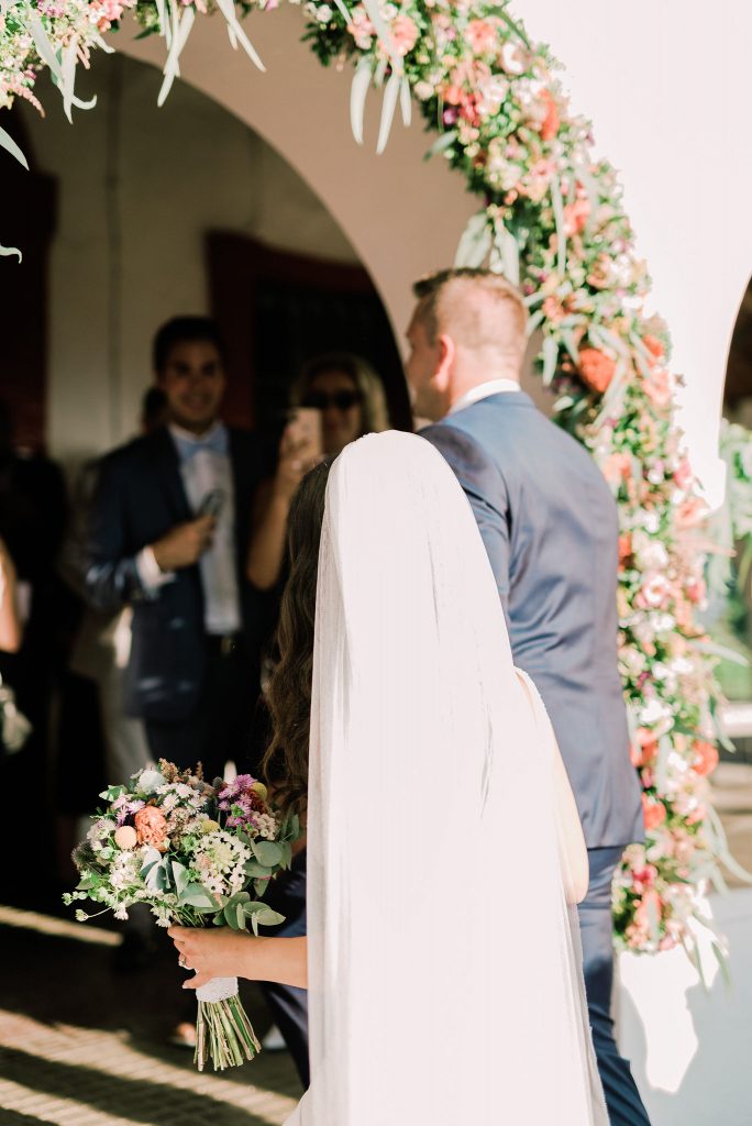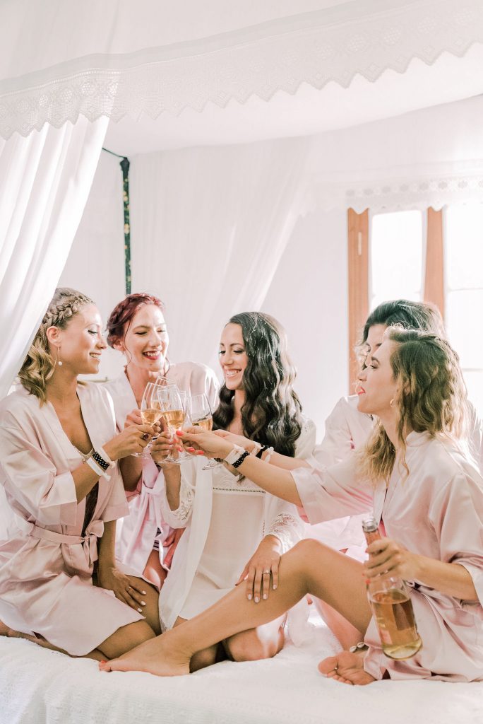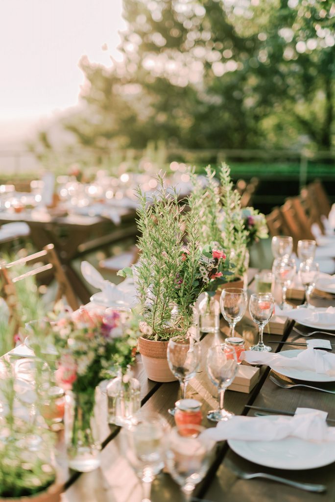 The big day for Kalliope began over an ornate 19th-century style villa where the bride and bridesmaids enjoyed some toasts before getting ready for the big walk down the aisle. For the wedding decor, Kalliope opted for exuberant blooms, wildflowers, and miniature buds paired to Gerbera daisies, Versilia Roses, Billy balls, Cockscomb Celosias, and purple scabiosa along with locally foraged foliage and waxflowers.