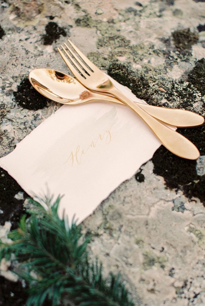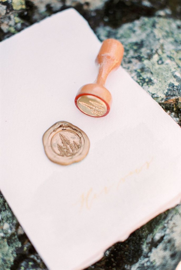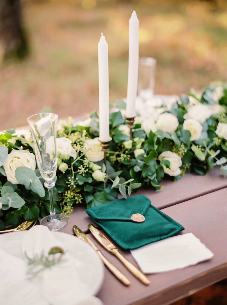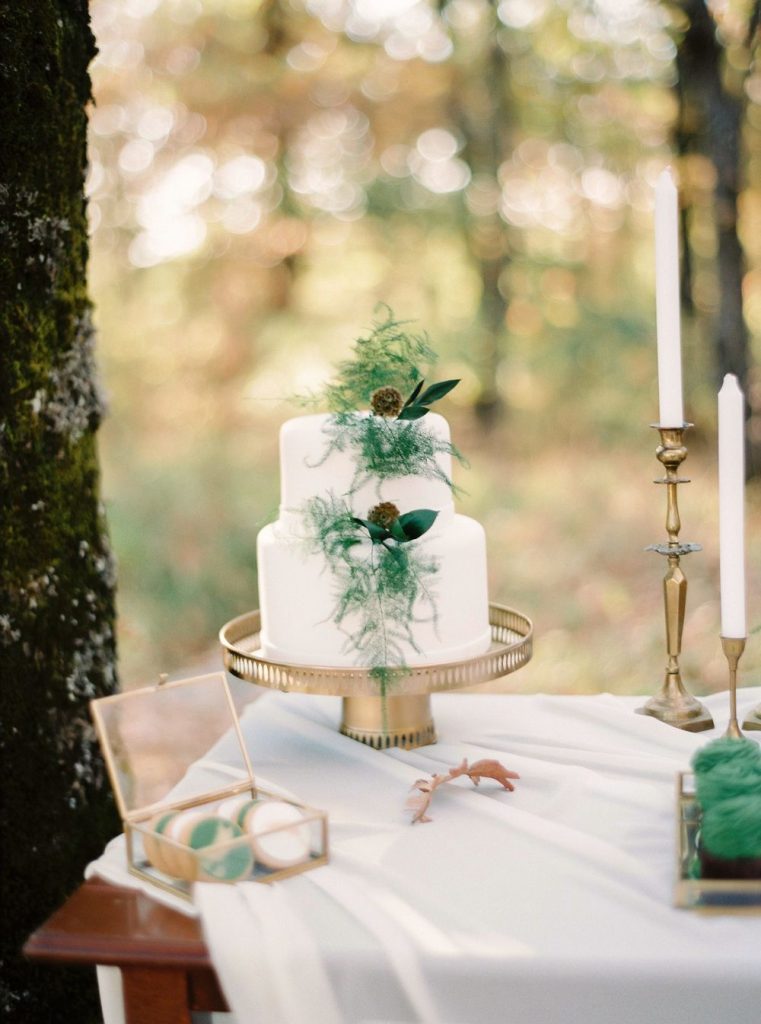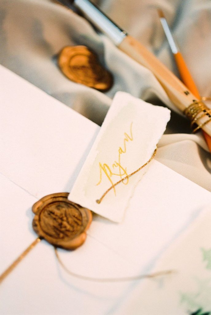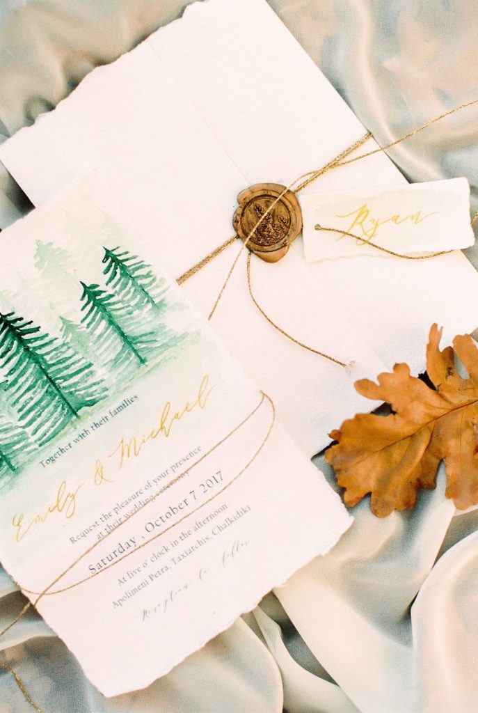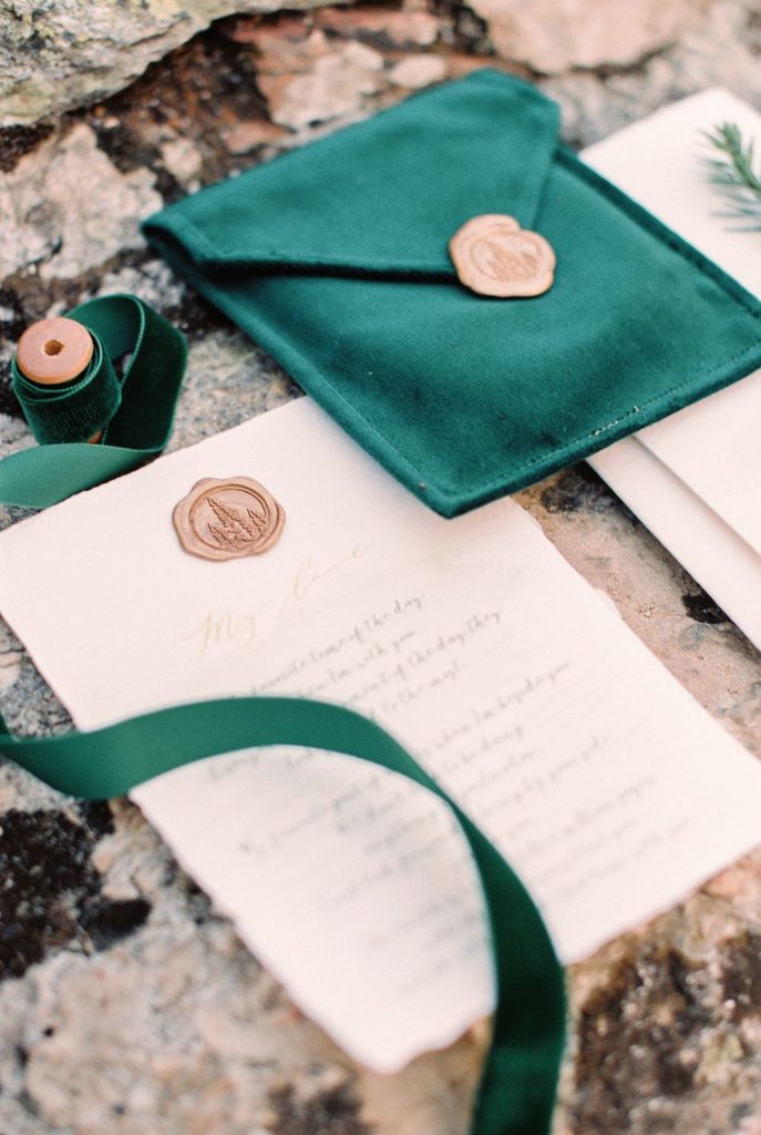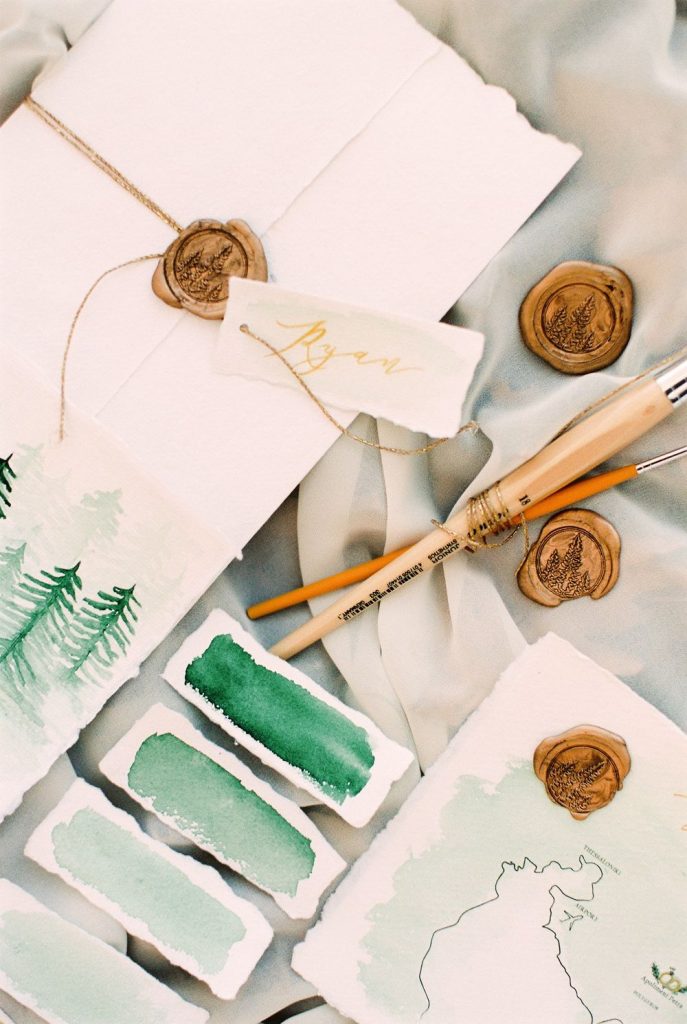 Our wedding reception table was set in the heart of the forest amidst thick pines and oak trees. We wished to create an intimate celebration, where timberland cedars and fallen leaves interplay with deep greens, amber and gold hues, clean lines and the warmth of Persian nappery. We opted for two wedding cakes, one styled with a velvet amber ribbon and golden wax seal and the second in tiny pinecones and greenery. Our stationery including invitations, place cards, and menus involved fine art calligraphy and all shades of green watercolor design to match the evergreen landscape, while our tableware was kept minimal and delicate infused with bottle green velvet favor envelopes secured with golden wax seals.