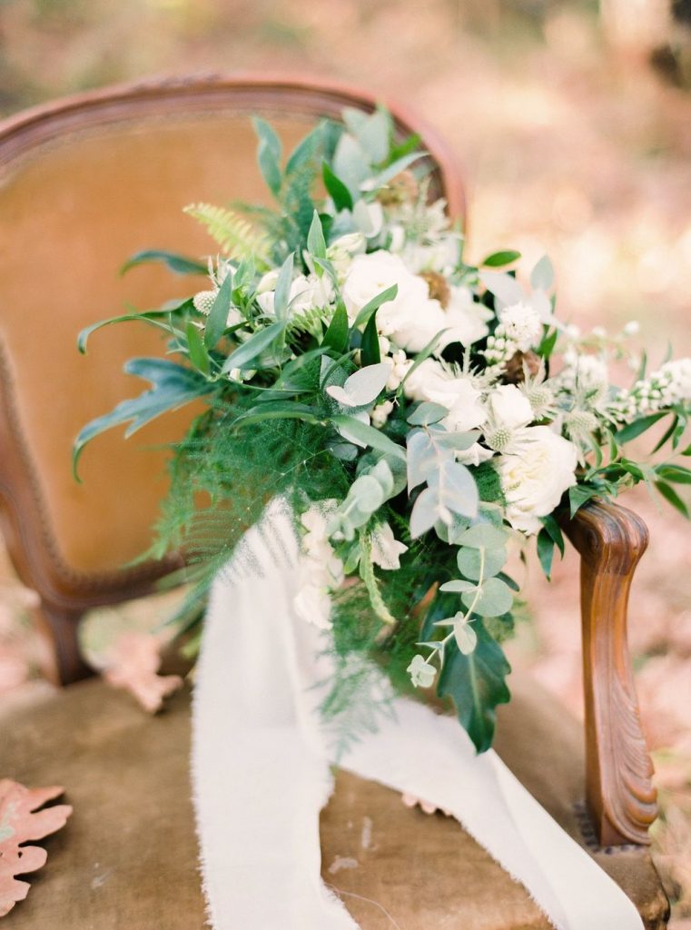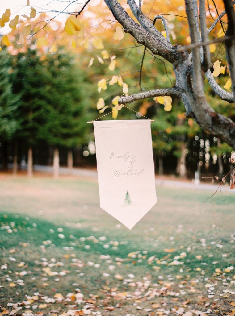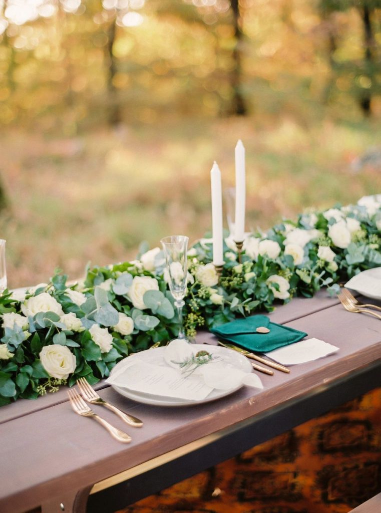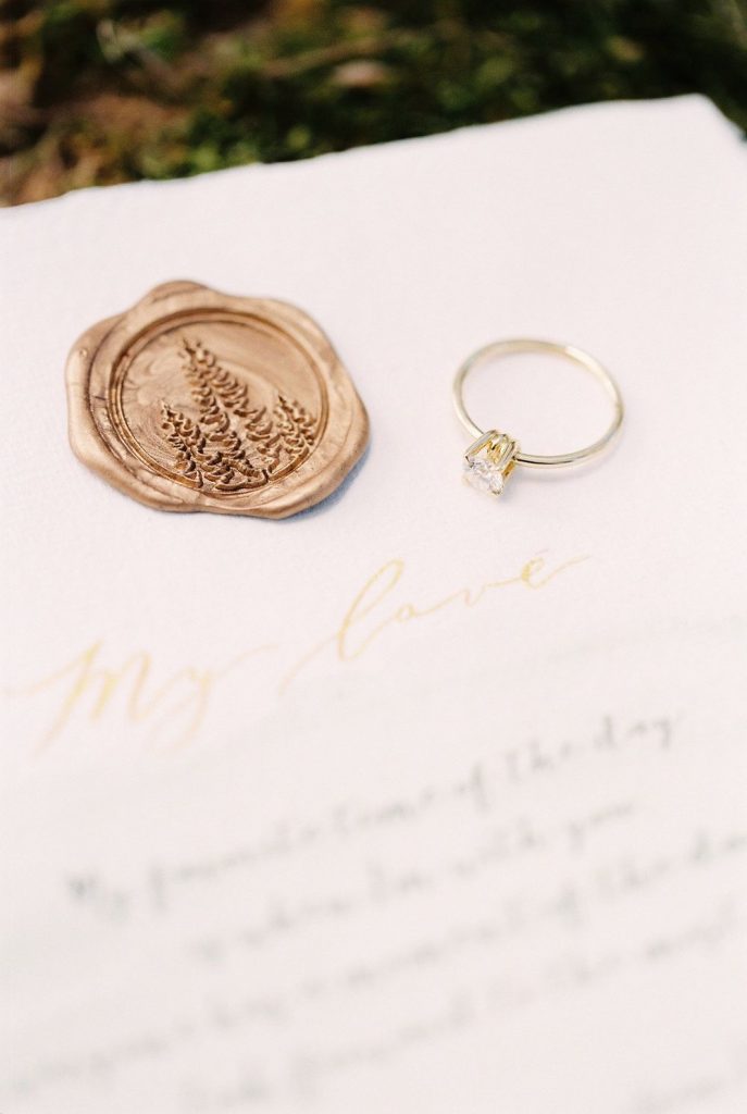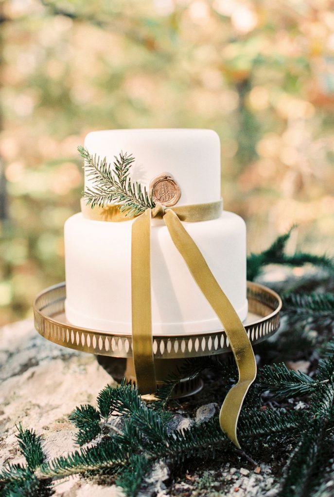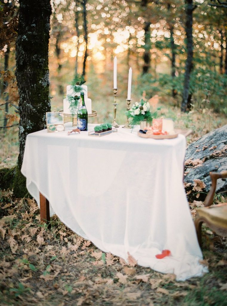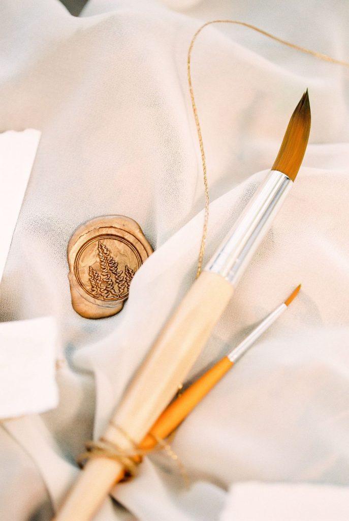 Our wedding reception table was set in the heart of the forest amidst thick pines and oak trees. We wished to create an intimate celebration, where timberland cedars and fallen leaves interplay with deep greens, amber and gold hues, clean lines and the warmth of Persian nappery. We opted for two wedding cakes, one styled with a velvet amber ribbon and golden wax seal and the second in tiny pinecones and greenery. Our stationery including invitations, place cards, and menus involved fine art calligraphy and all shades of green watercolor design to match the evergreen landscape, while our tableware was kept minimal and delicate infused with bottle green velvet favor envelopes secured with golden wax seals.