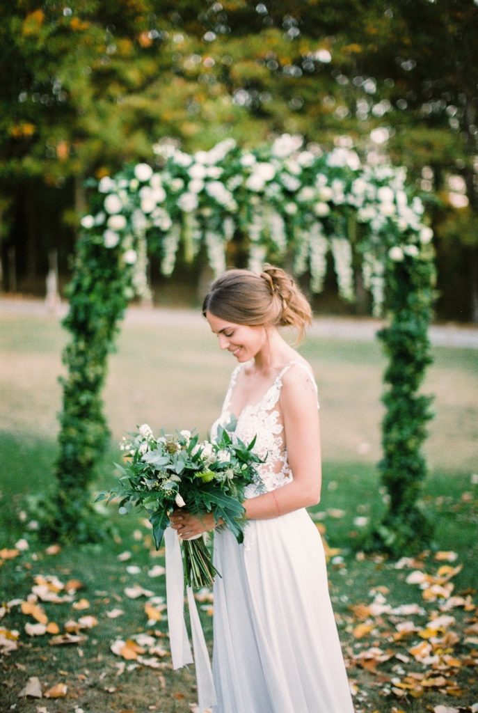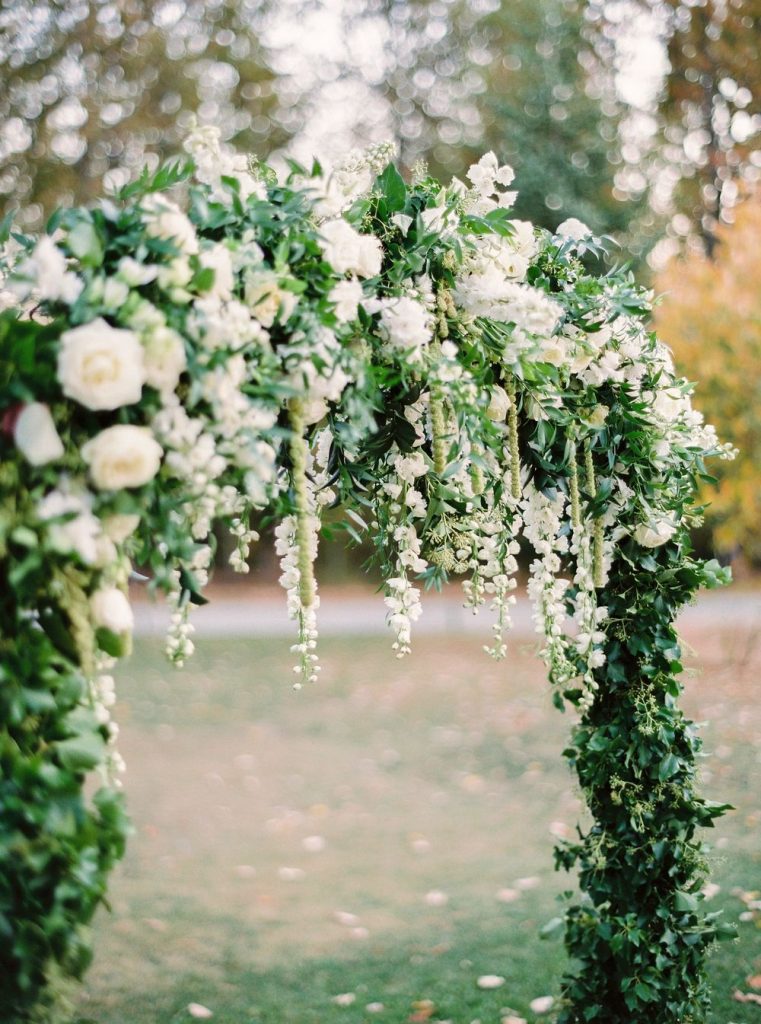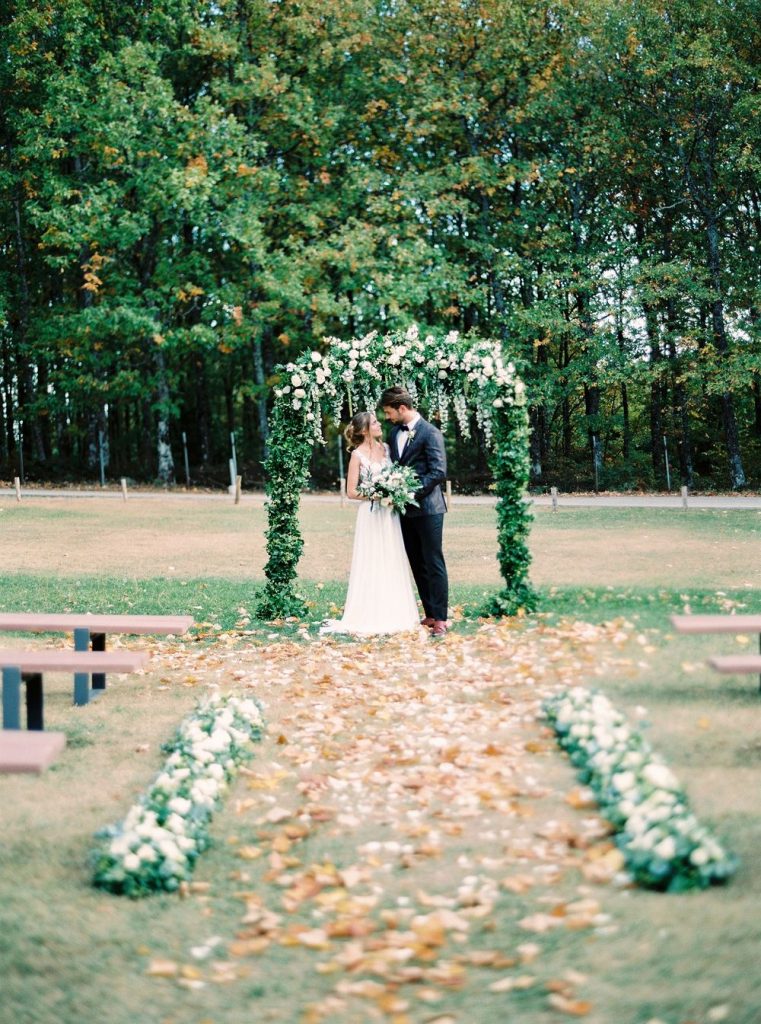 For the ceremony, my team envisioned a woodlot rite drenched in soft autumnal and alpine touches, where we staged a lush canopy, wooden pews, and an aisle made of lush floral installations.