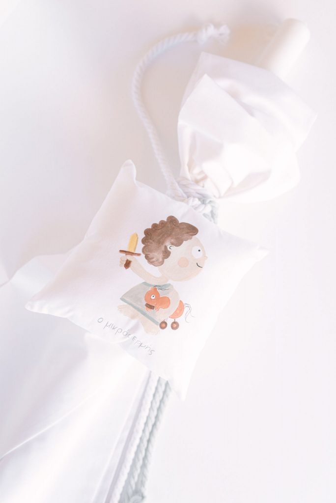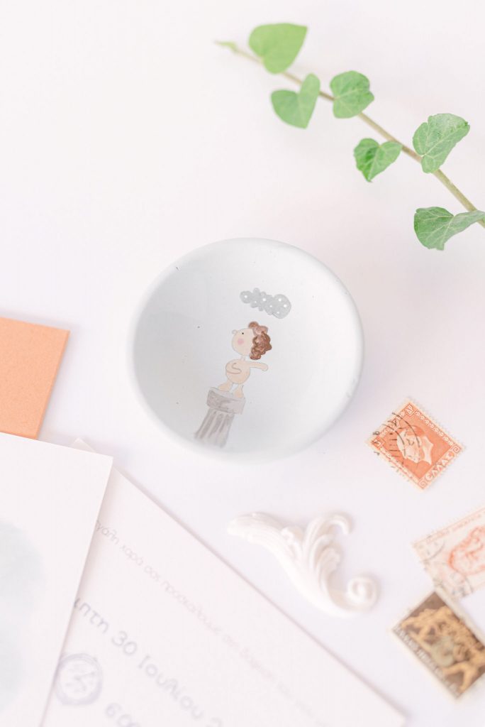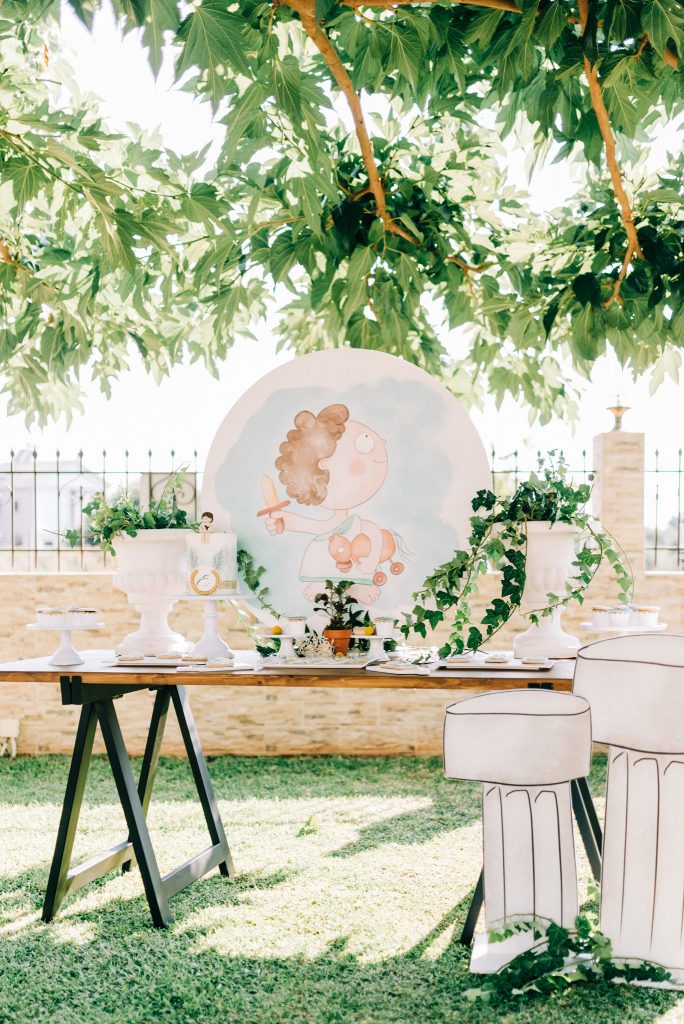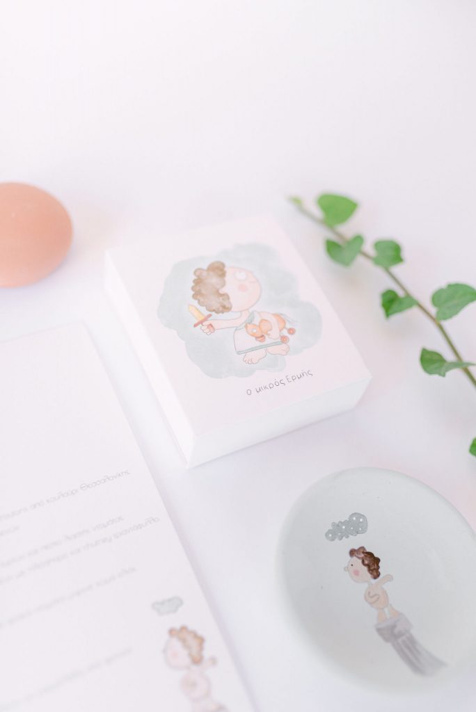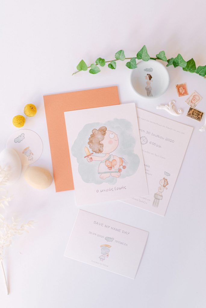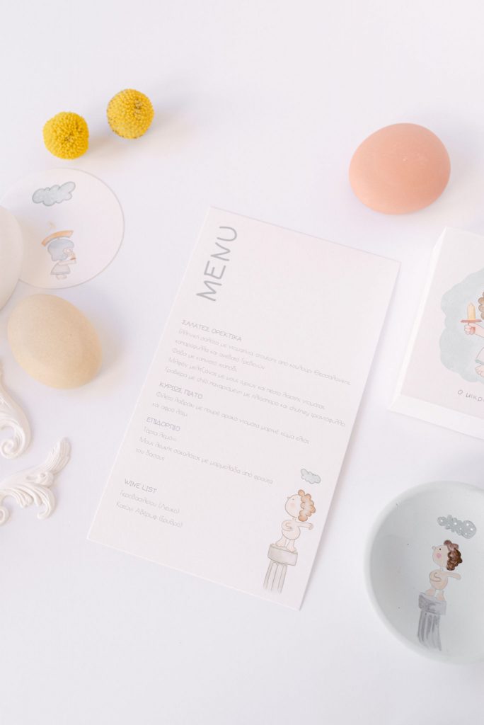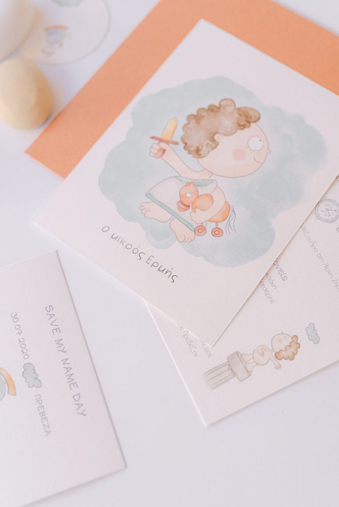 Manousenia created a custom sketch design with watercolor elements inspired by Triviza’s kids book "Little Hermes" which also inspired us to design and style the whole event.