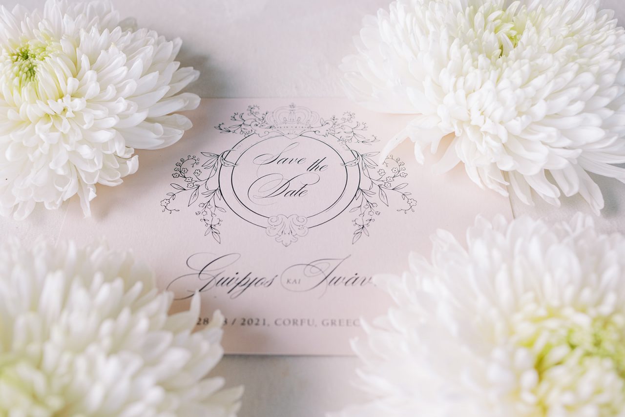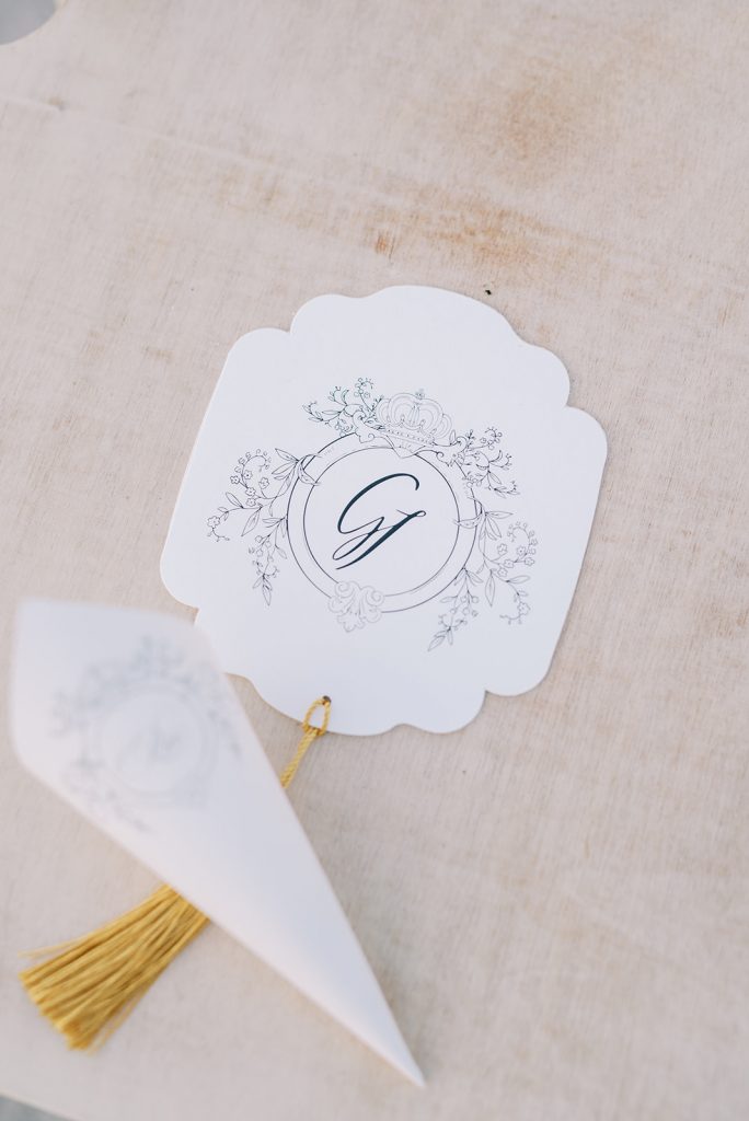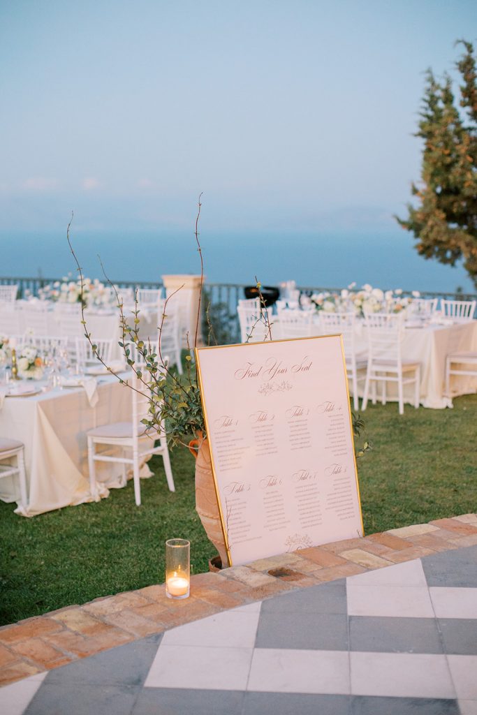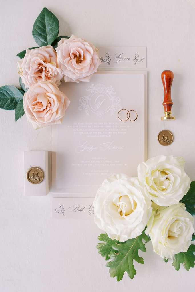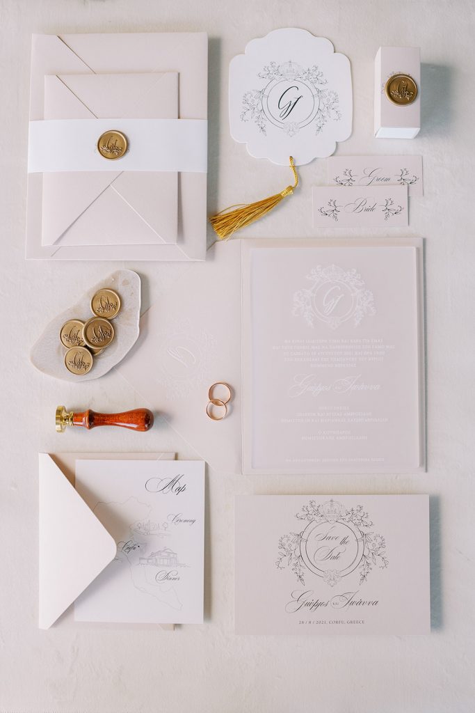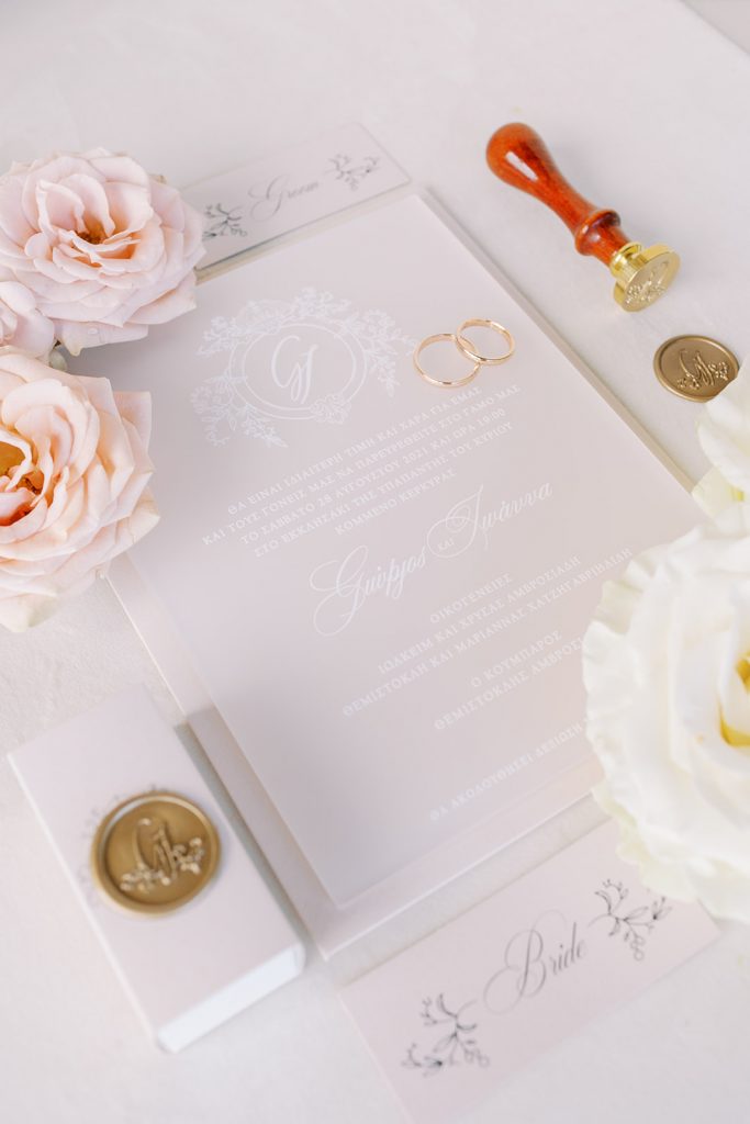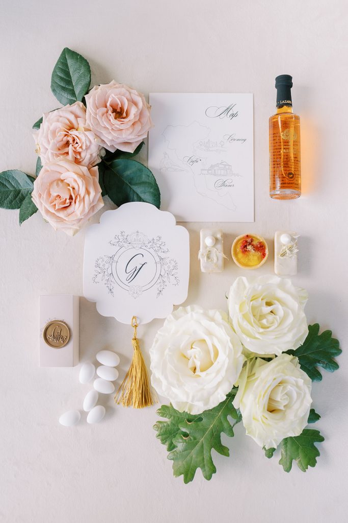 Manousenia designed a chic stationery suite with an acrylic invitation and a handdrawned map with historical places of Corfu to be mentioned. The couple offered to their guests a bottle of a traditional kumquat Corfu liqueur. Its name means “golden orange” and it is produced by extracting the rare citrus fruit kumquat into alcohol.