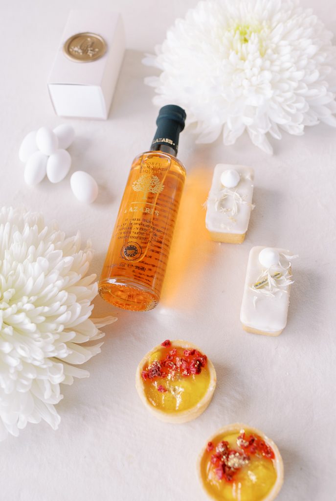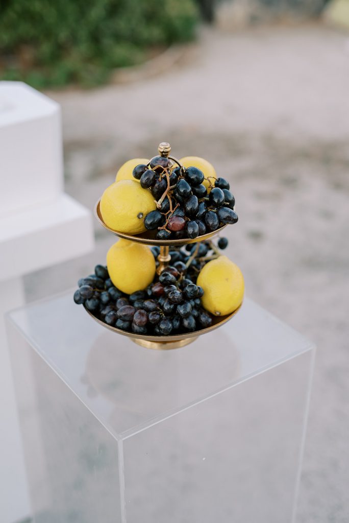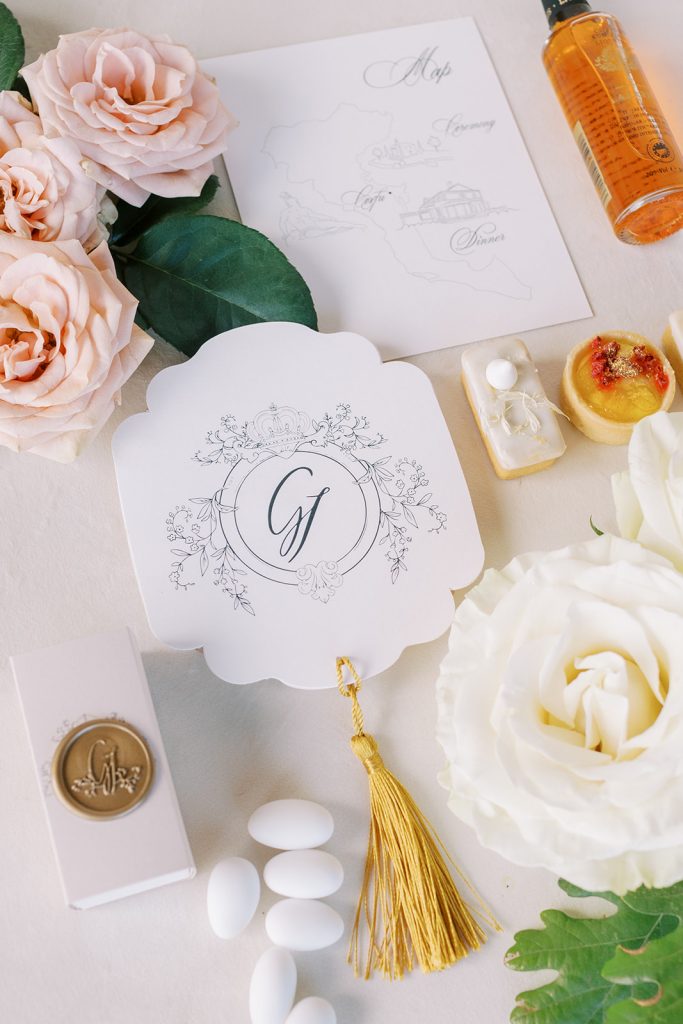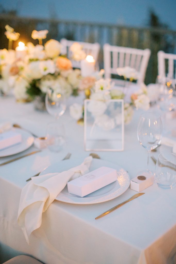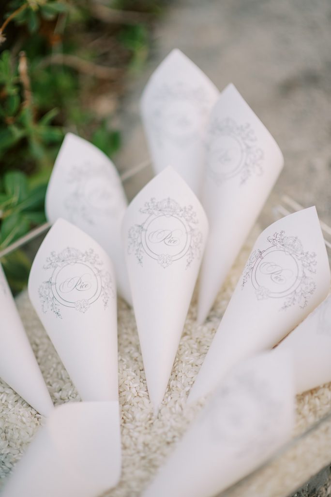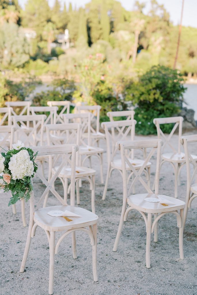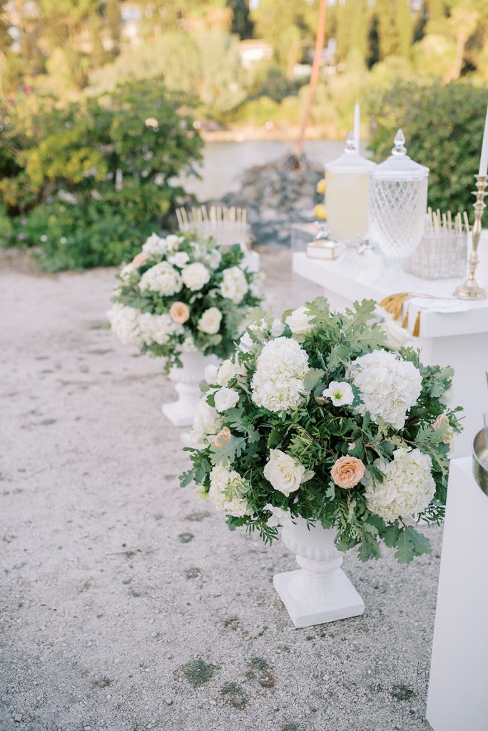 Manousenia designed a chic stationery suite with an acrylic invitation and a handdrawned map with historical places of Corfu to be mentioned. The couple offered to their guests a bottle of a traditional kumquat Corfu liqueur. Its name means “golden orange” and it is produced by extracting the rare citrus fruit kumquat into alcohol.