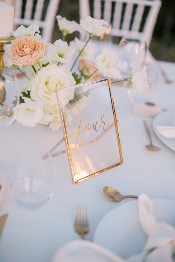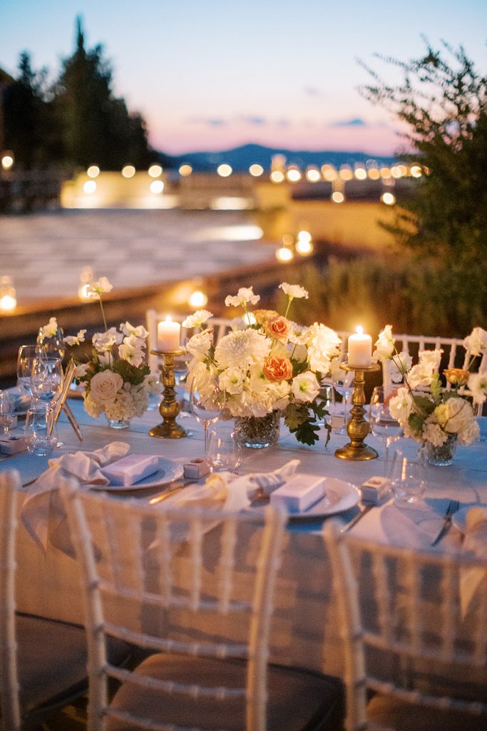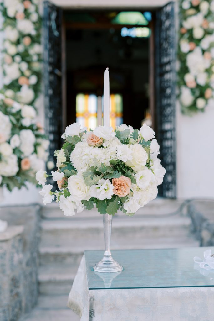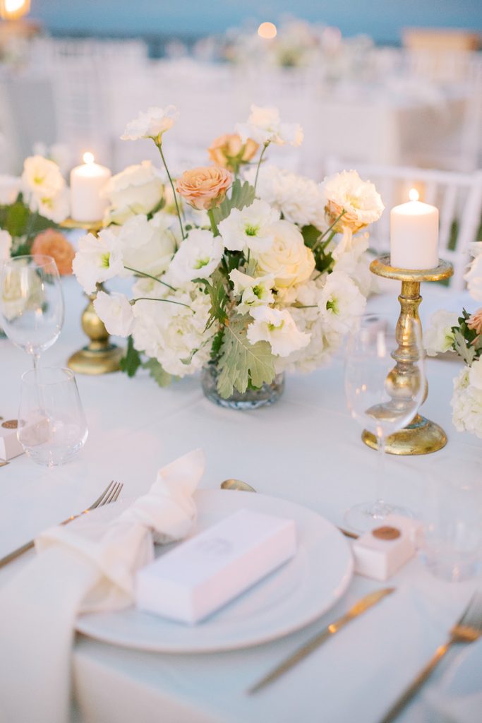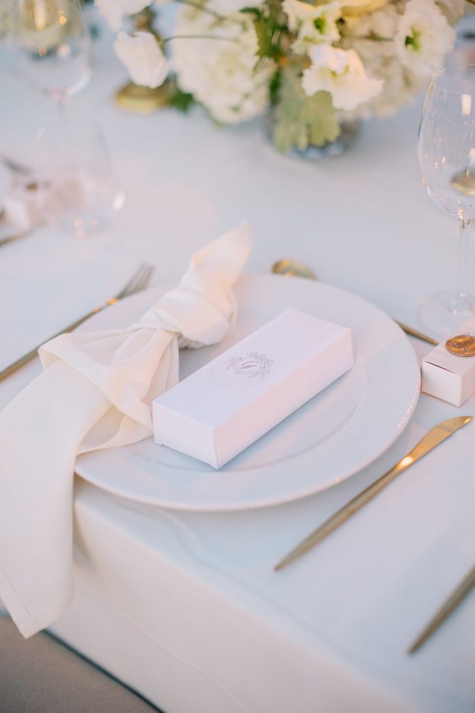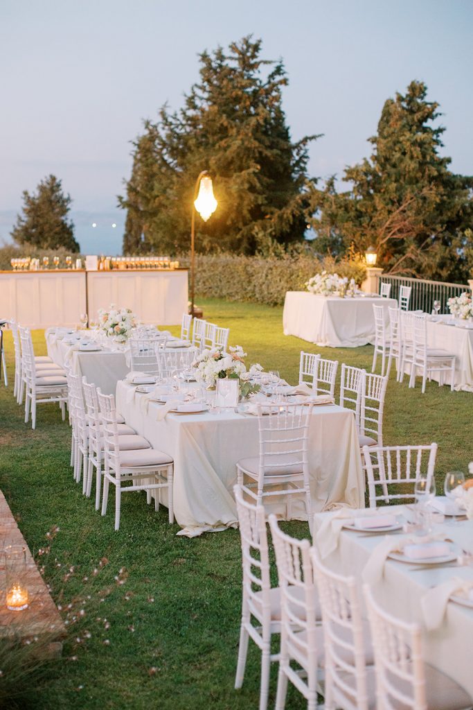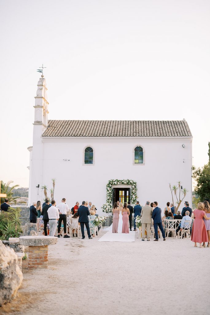 Manousenia designed a chic stationery suite with an acrylic invitation and a handdrawned map with historical places of Corfu to be mentioned. The couple offered to their guests a bottle of a traditional kumquat Corfu liqueur. Its name means “golden orange” and it is produced by extracting the rare citrus fruit kumquat into alcohol.