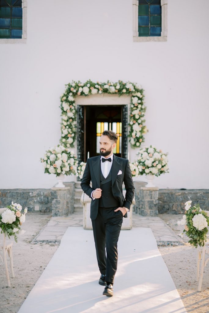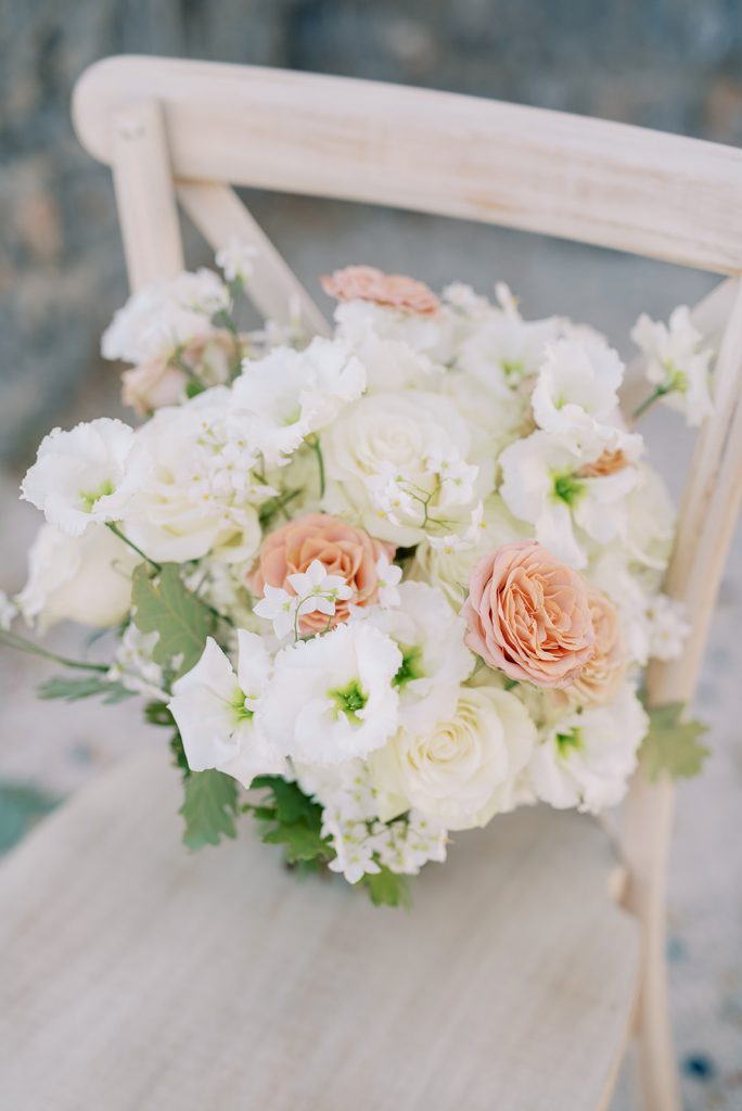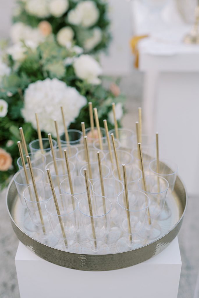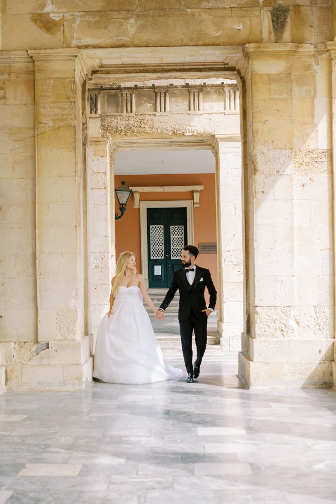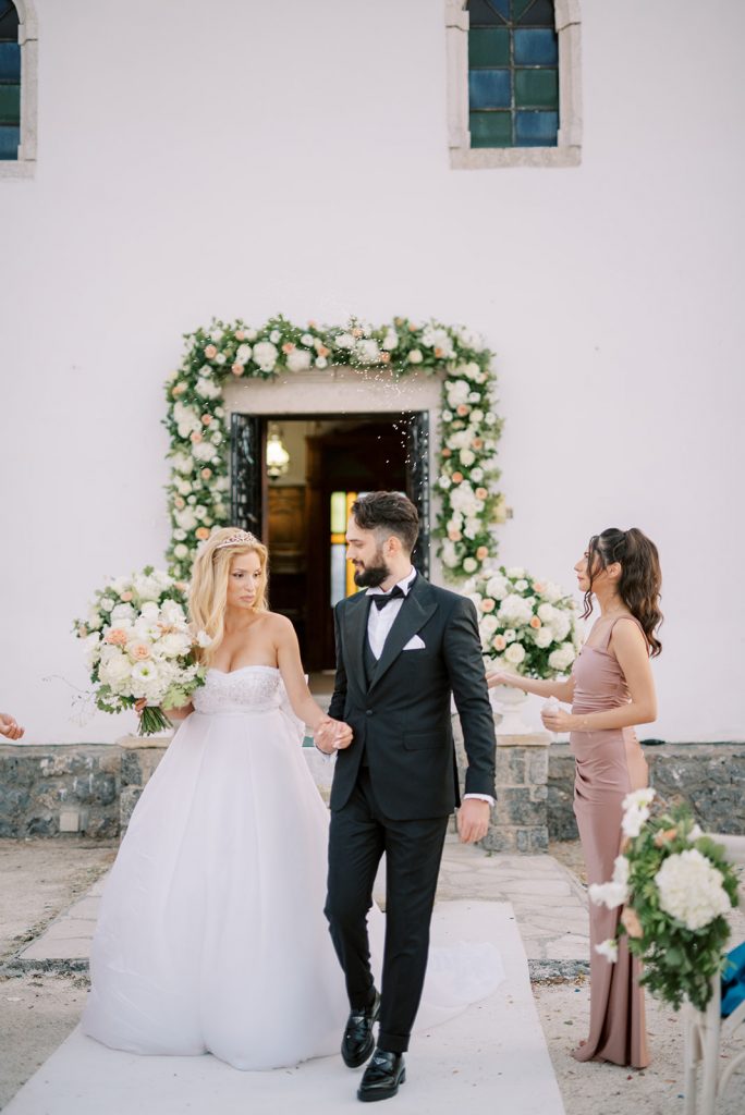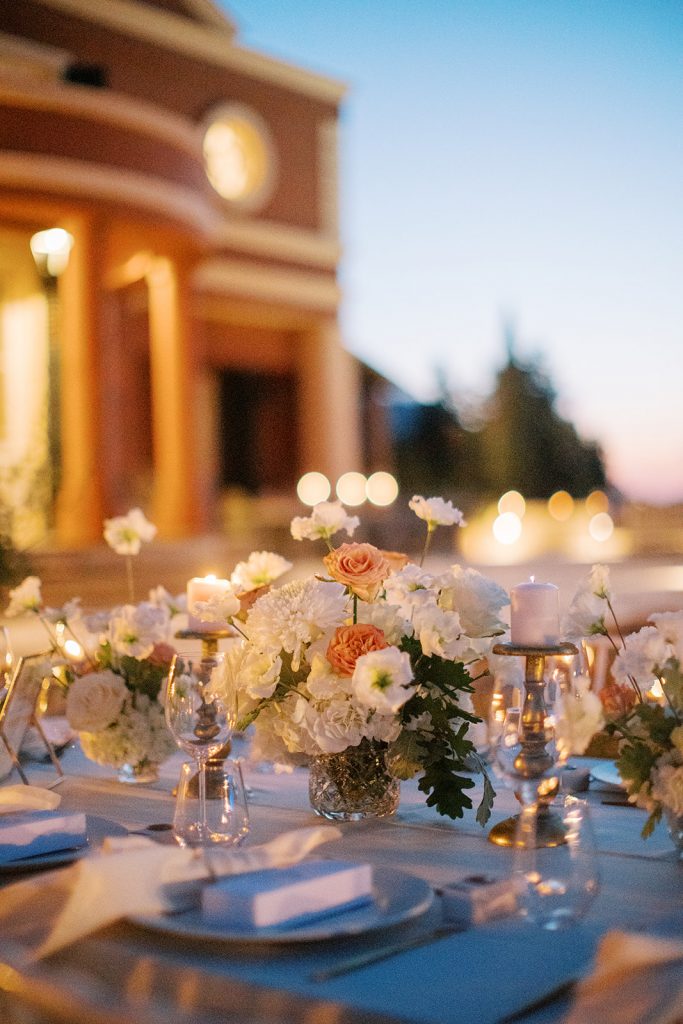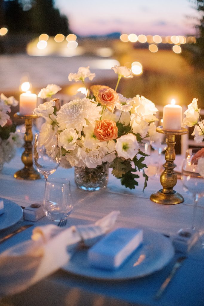 Manousenia designed a chic stationery suite with an acrylic invitation and a handdrawned map with historical places of Corfu to be mentioned. The couple offered to their guests a bottle of a traditional kumquat Corfu liqueur. Its name means “golden orange” and it is produced by extracting the rare citrus fruit kumquat into alcohol.