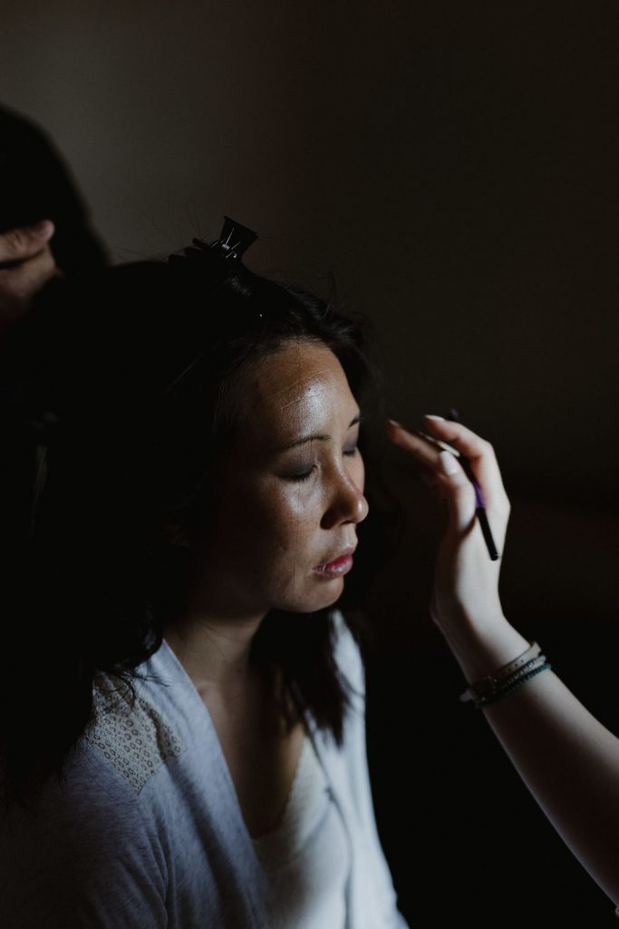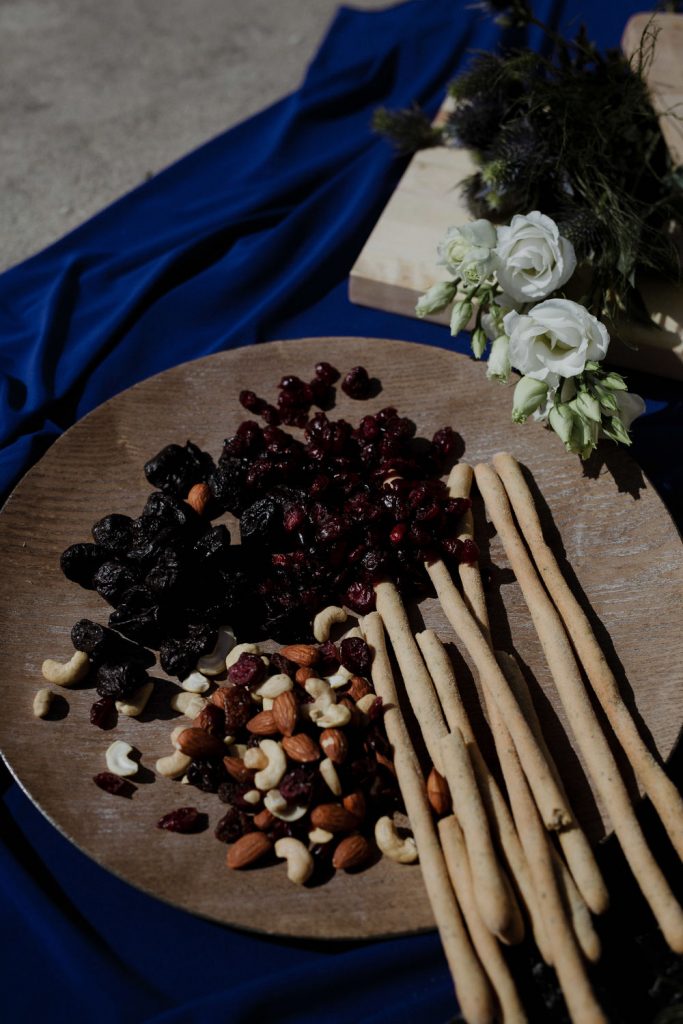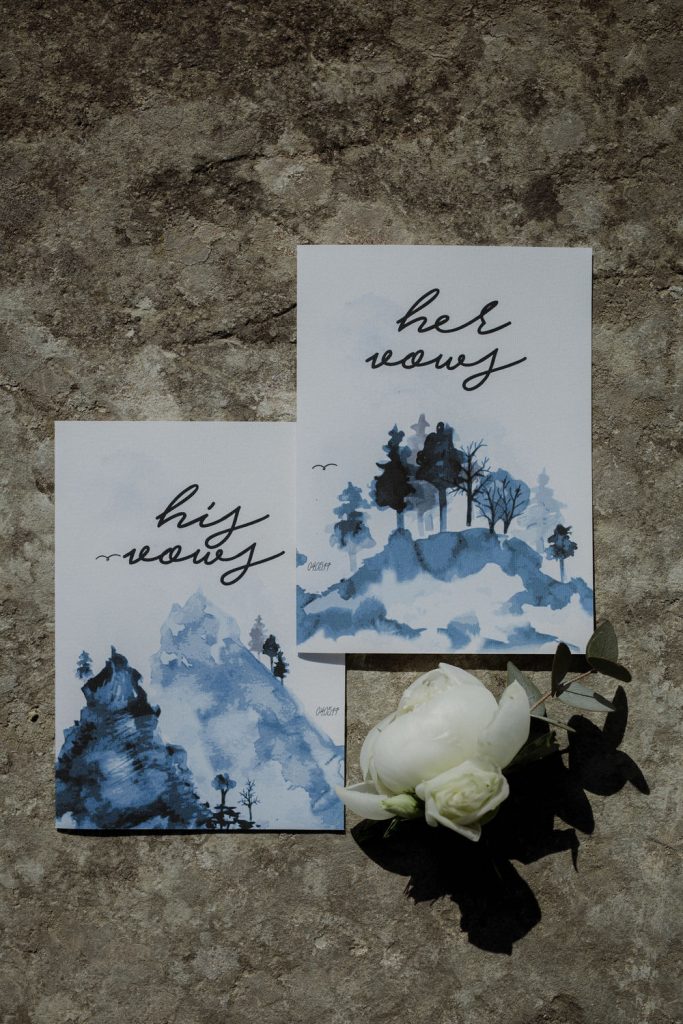Passionate hikers themselves, the breathtaking landscape of Meteora felt right for them. We spent the evening before their big day all together, along with the whole team of wedding vendors. We chatted, laughed a lot and tasted traditional Greek food. The next day, we woke up at the sunrise to meet them. Although the elopement took place on the mountains we wanted to include something blue to our color palette. We decided to keep it simple, just white and blue. Peonies, lisianthus, wax flowers, Ornithogalum, tree ferns and Eryngium, for something blue, were the flowers for our wedding bouquet. Love me do inspired from the Asian painting method and they designed a really unique stationery. Deanna asked me to help them with their styling, as I knew better what could fit with my concept design.
