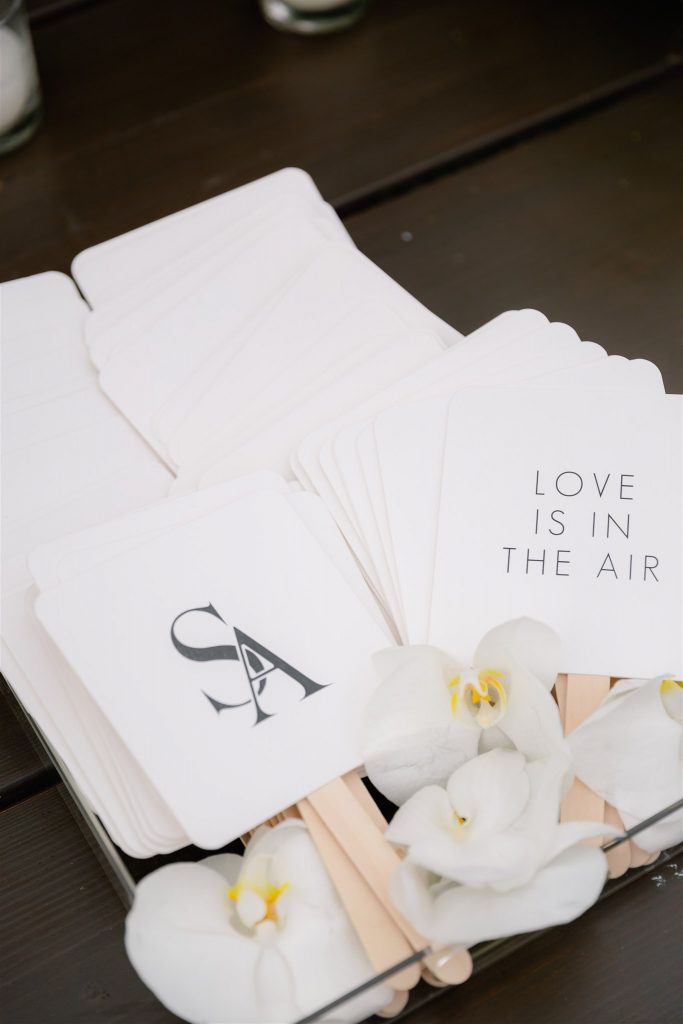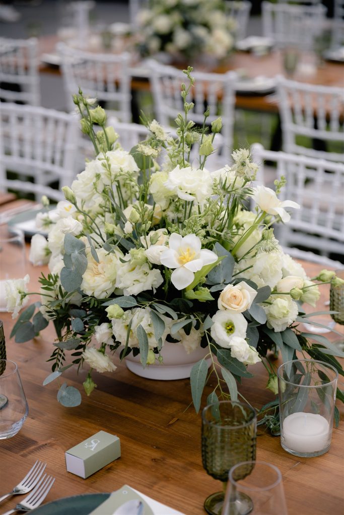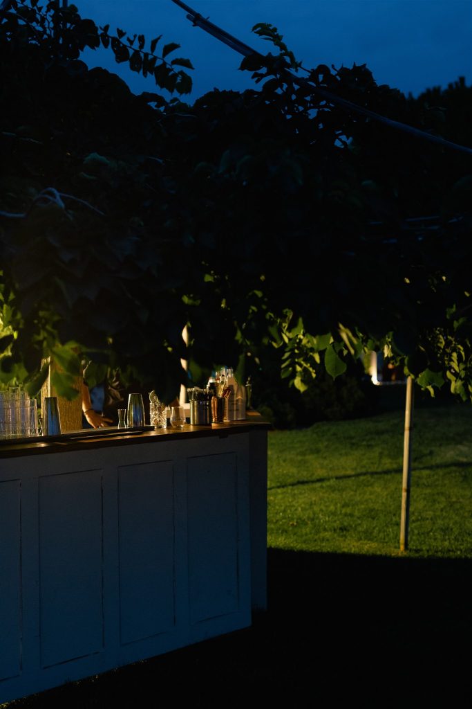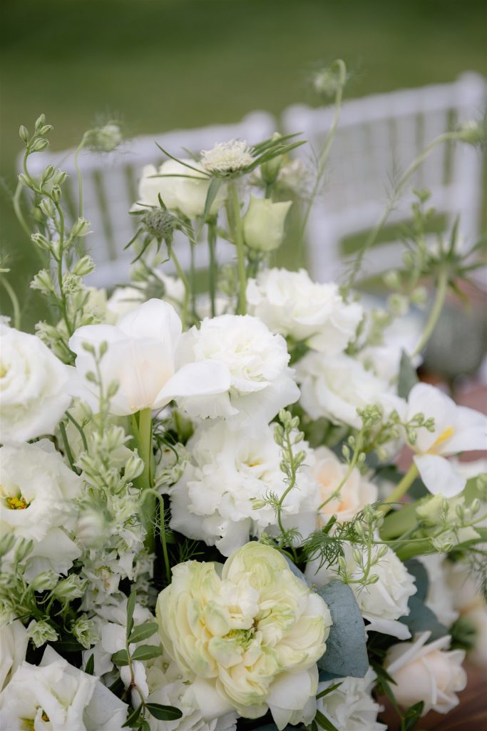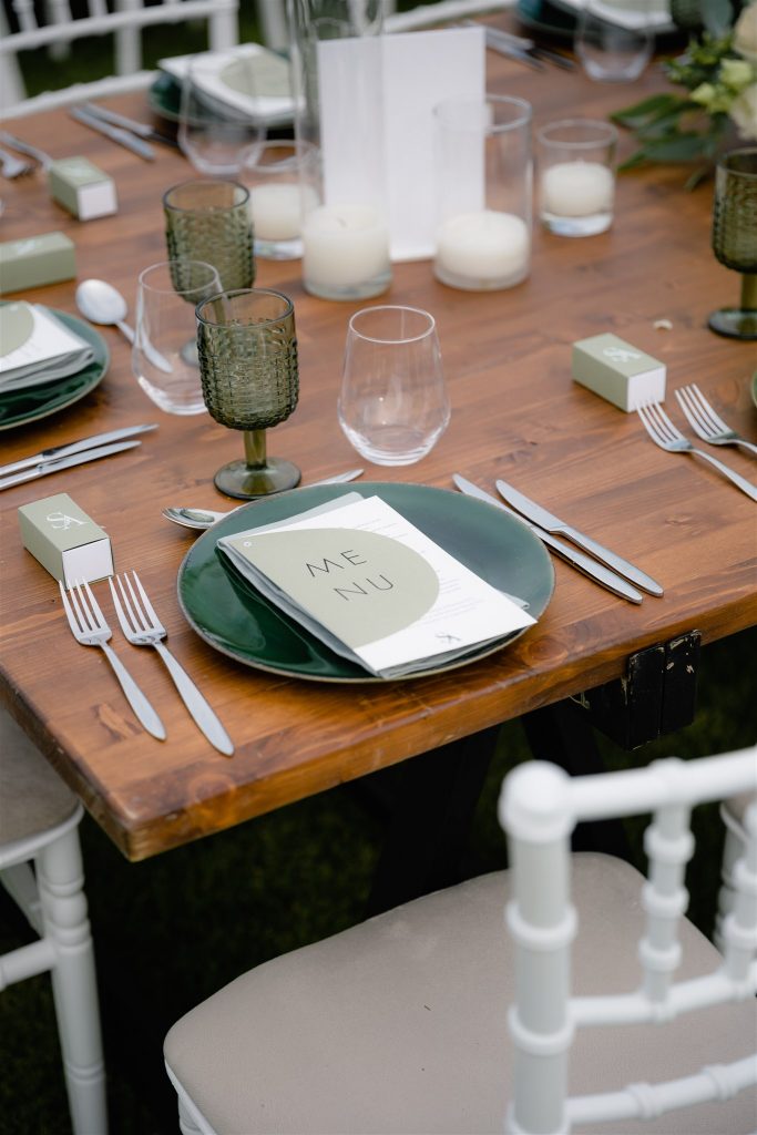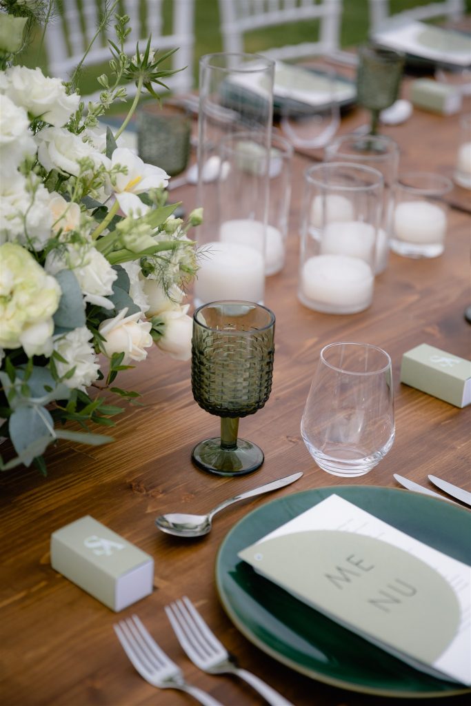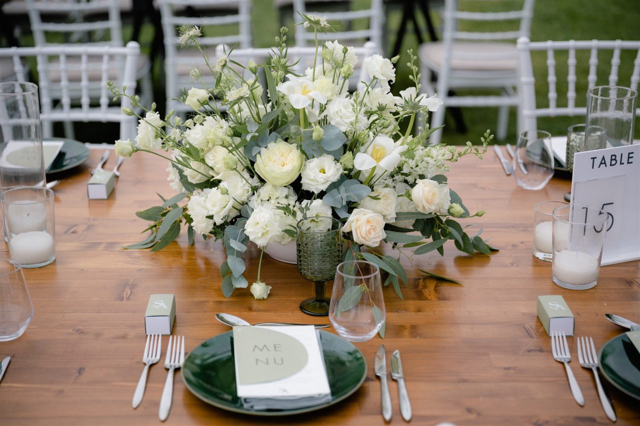We wanted to create a beautiful but relaxed garden party. We used lots of white and soft neutrals in the ceremony, table settings, and florals to contrast the green of the garden, but we incorporated green details as well to fit with the surrounding.