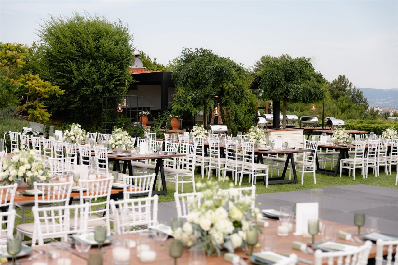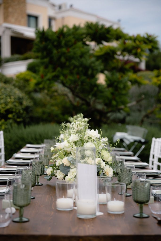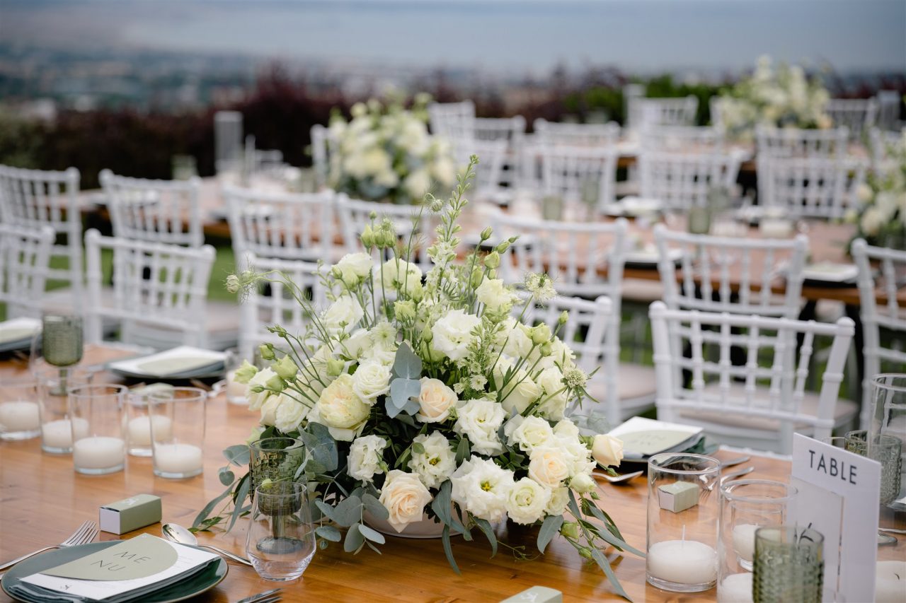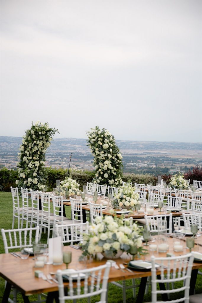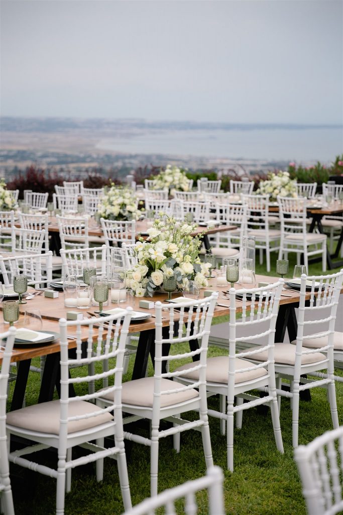 The couple exchanged vows with the magnificent view of the city of THESSALONIKI. The party ensued just few steps beside where wooden banquet tables were romantically styled with Tiffany chairs, candles, and blooms curated in a palette of white and soft pink.