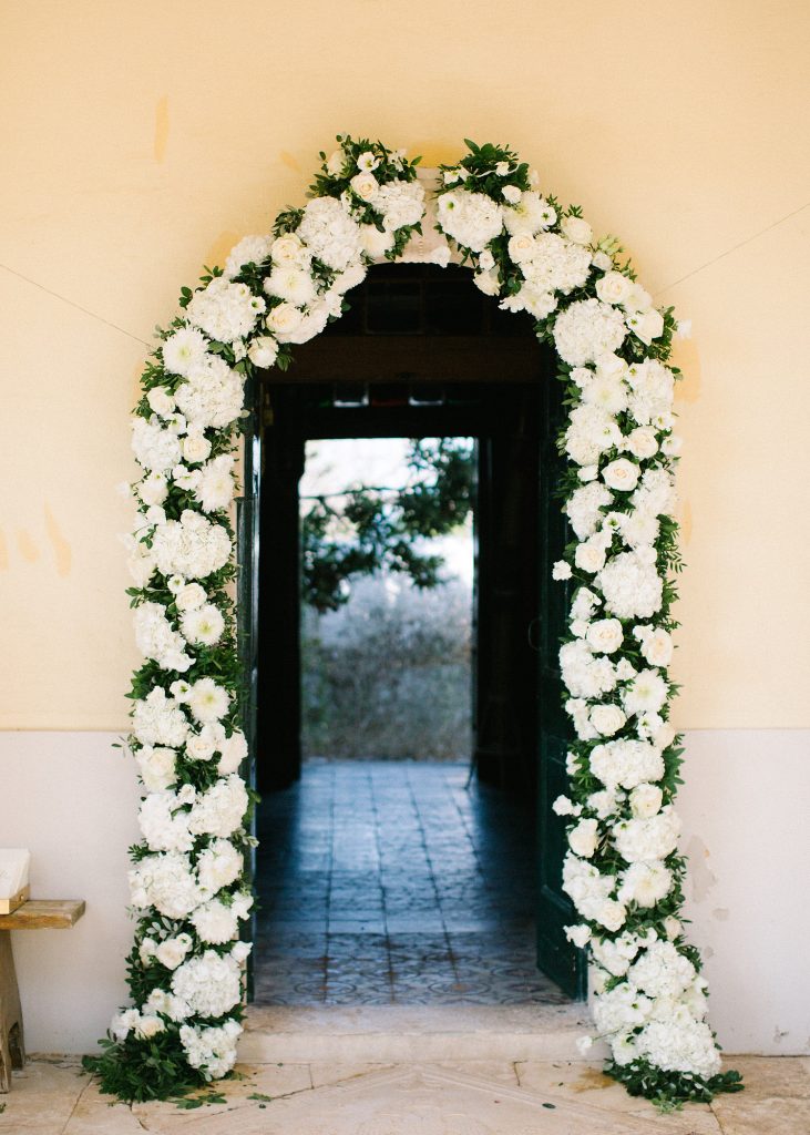 The ceremony was held in the small monastery of Panagia Bellianiton. For those that have been on the island, the monastery and its surroundings hold the undeniable charm of the Mediterranean, the one you see in movies like Mediterraneo or The Big Blue. We decorated the door of the church with a flower garland with greenery and flowers abundant in Greece, like bay leaves, hydrangeas (indigenous to so many islands), lisianthus, roses, and chrysanthemums.