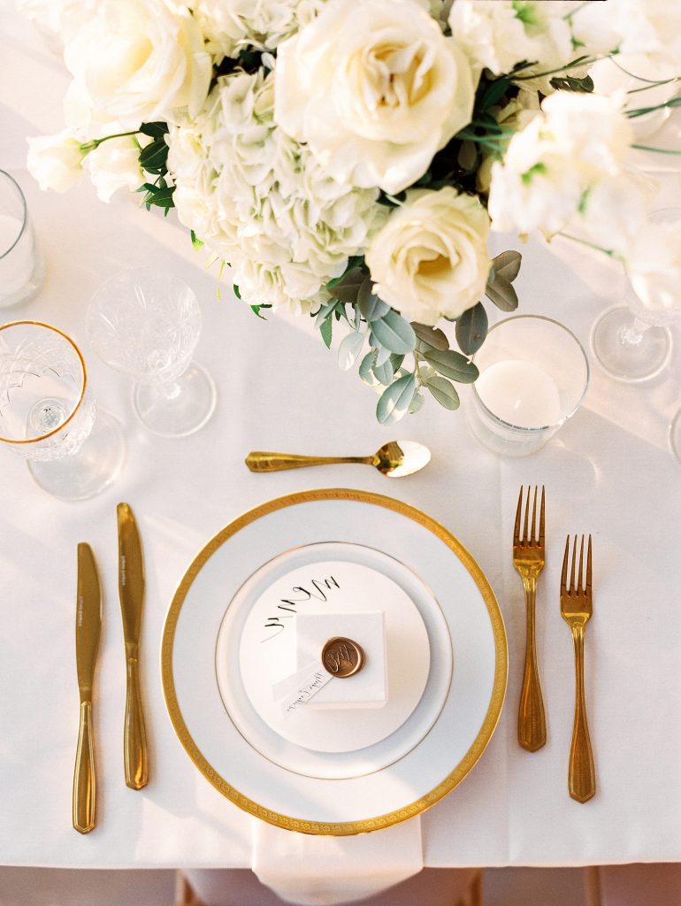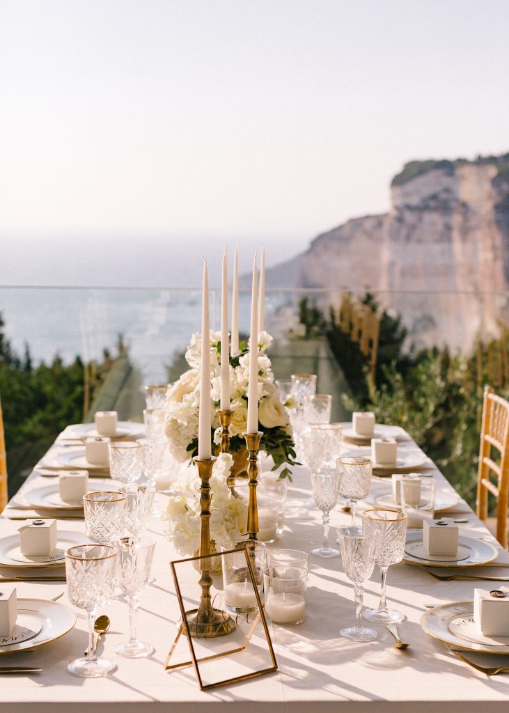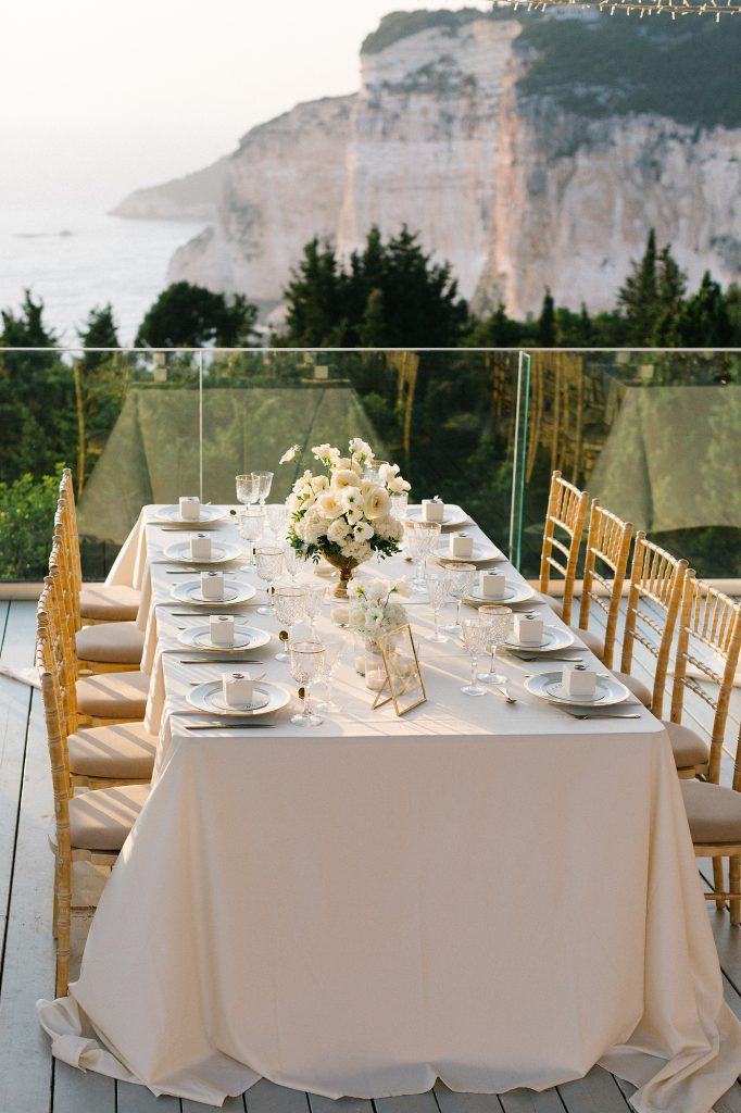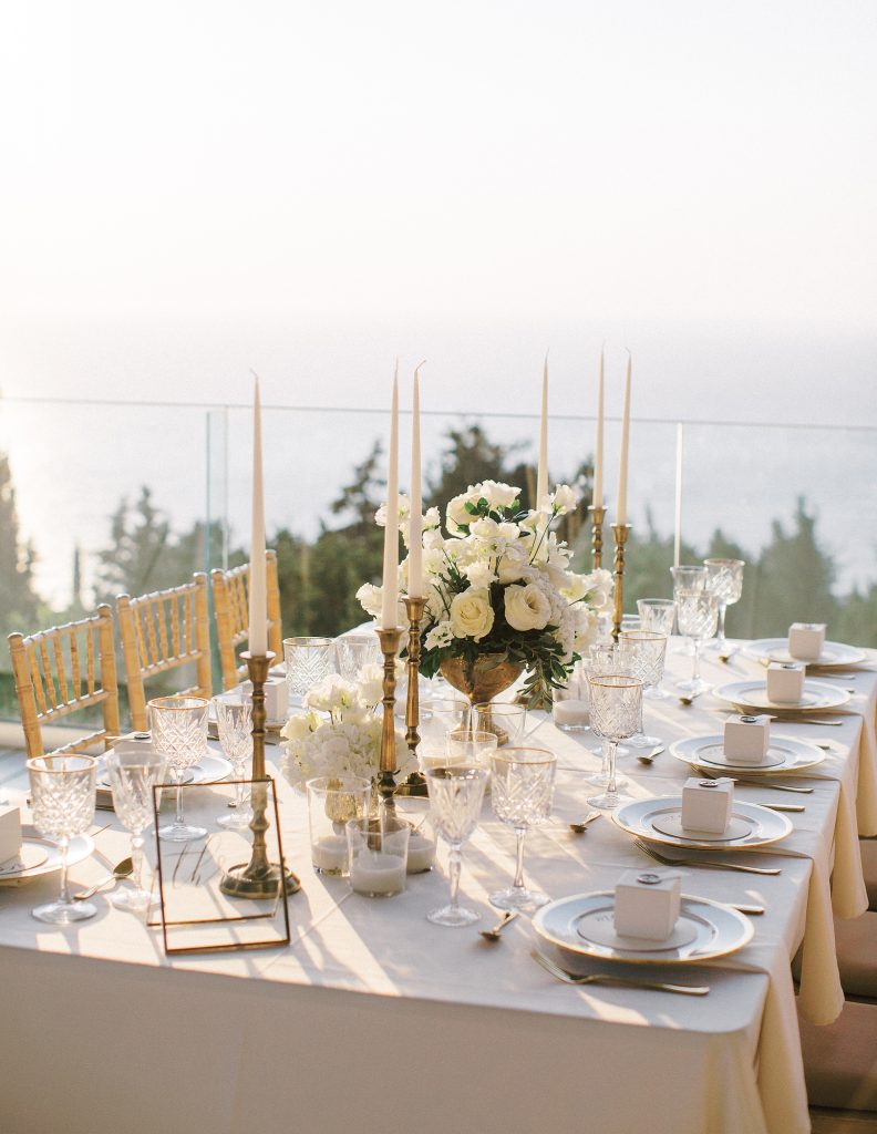 Couples choose the islands of the Ionian sea because their beauty is undeniable. After the intimate wedding ceremony, we curated a lovely reception on the beautiful restaurant of Erimitis that overlooks an amazing vista overflowing with refreshing greens. We curated everything according to the wedding style, bringing in specially selected furniture and dinnerware. White and touches of gold, as well as modernly constructed centerpieces and details, made the dinner setting so elegant and set the tone for the rest of the night. The part we adored? The wedding favors, decoratively sealed with wax and personalized with the names of the bride and groom!