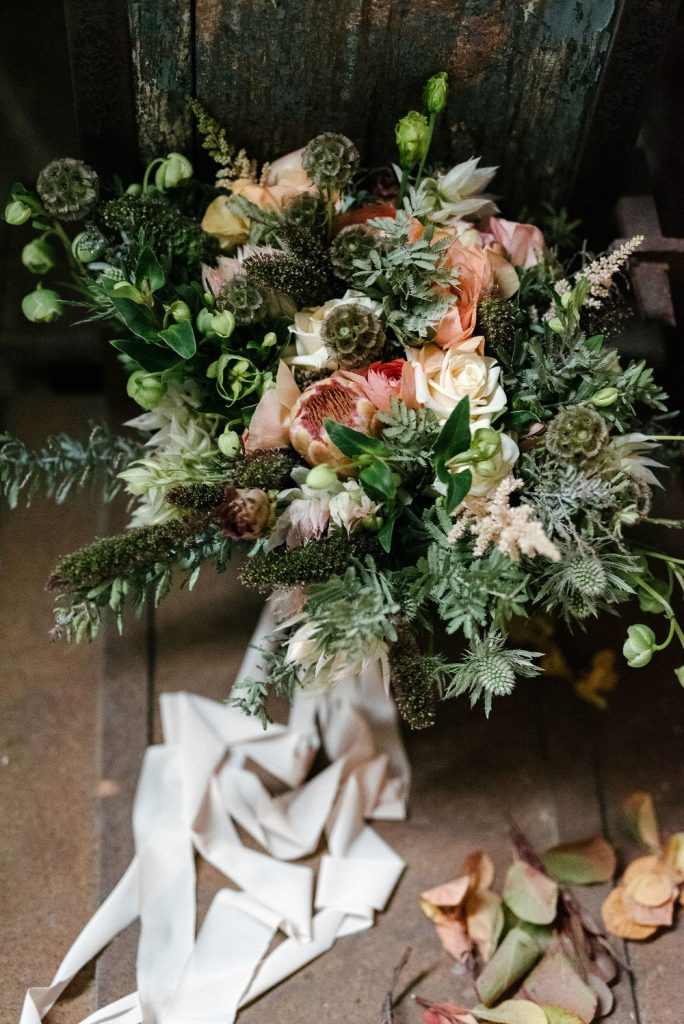 The Bloom Update: Consider wild ways to play up your wedding flowers. You've probably heard of a bed of roses, but what about a cloud of Autumn leaves, Scabiosas, Protea, Lysianthus, Hydrangeas and Chrysanthemums? And of course, David Austins. For a clutch that’s sure to energize your walk down the aisle an according resplendent display of buds is a definite must!