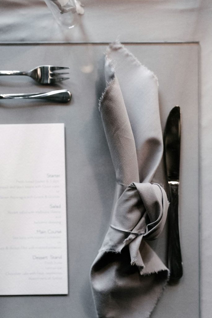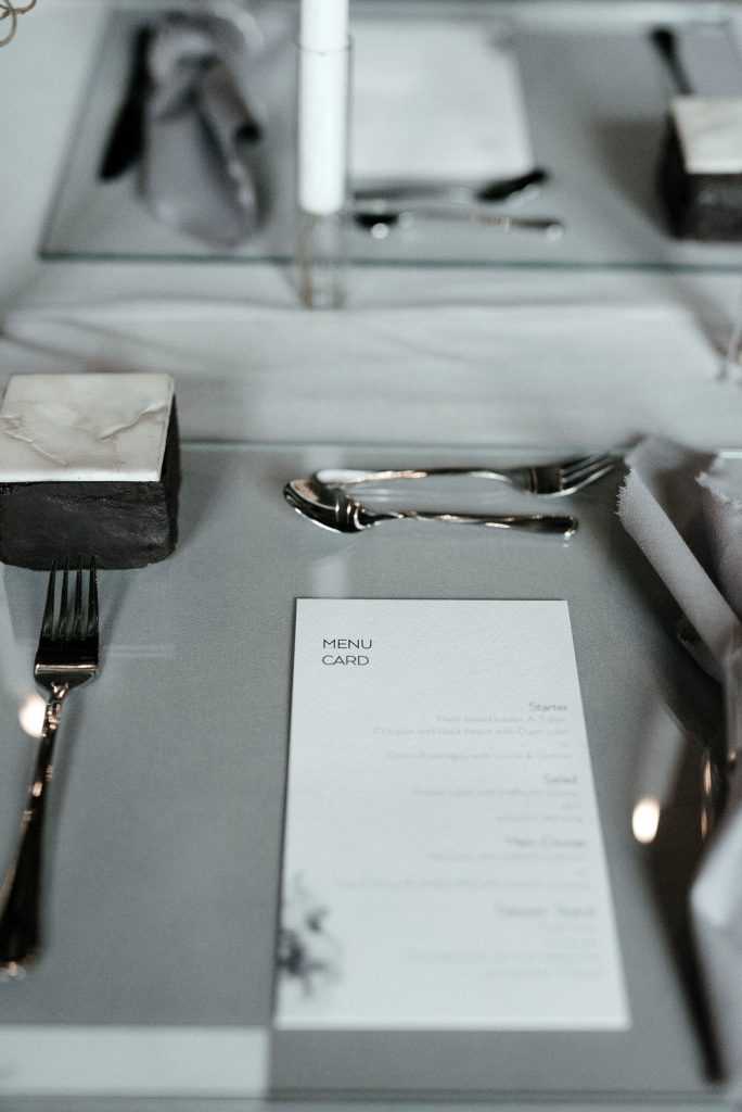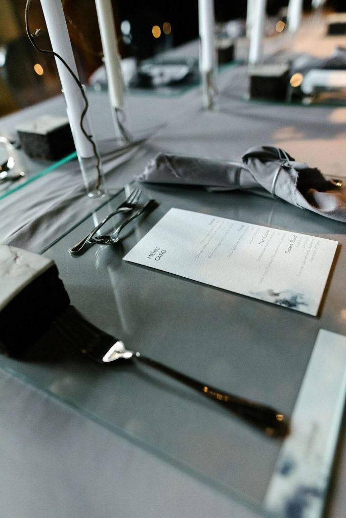 A moveable feast: A centerpiece doesn’t have to be the only thing on the table getting in on the fun. Transparent, light-reflecting, and delicate, Lucite can go beyond your ghost chairs into sculptor-paste trimmed dinnerware, menus and escort cards that steal the show.