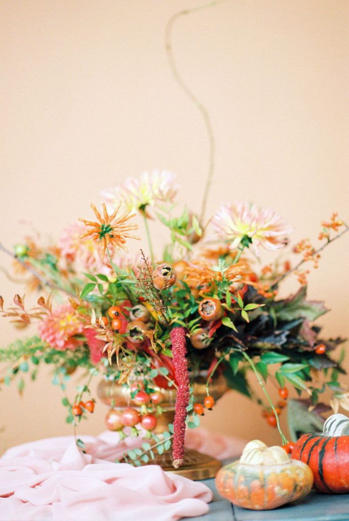 Finally, our cottage-style arrangement emerging from a dried-pumpkin-vase called for David Austin roses, Pompon Dahlias, Asparagus setaceus, Rosehips, and Amaranthus.