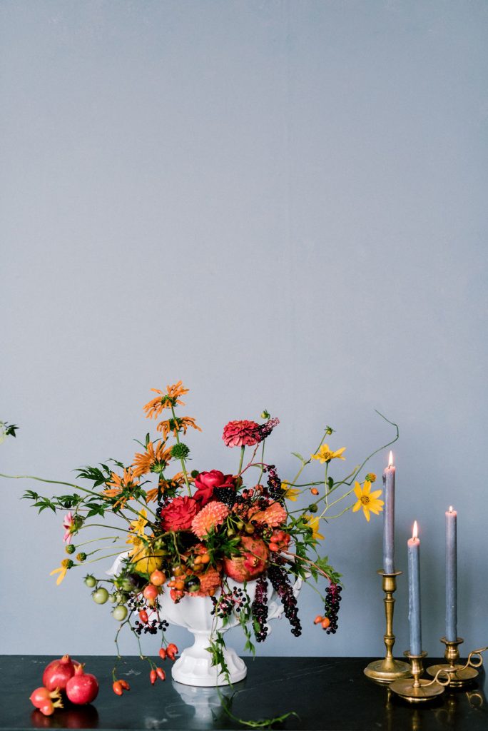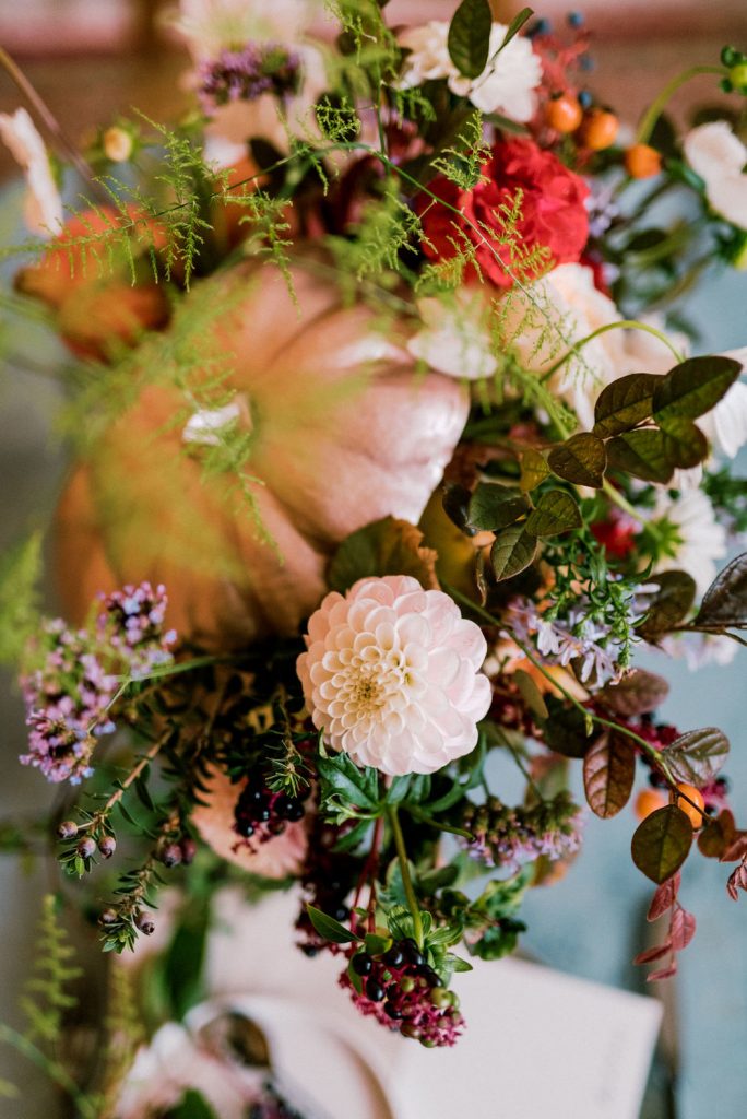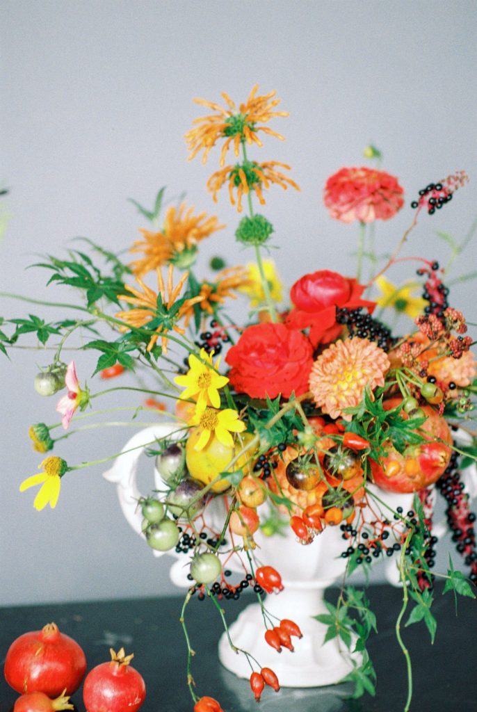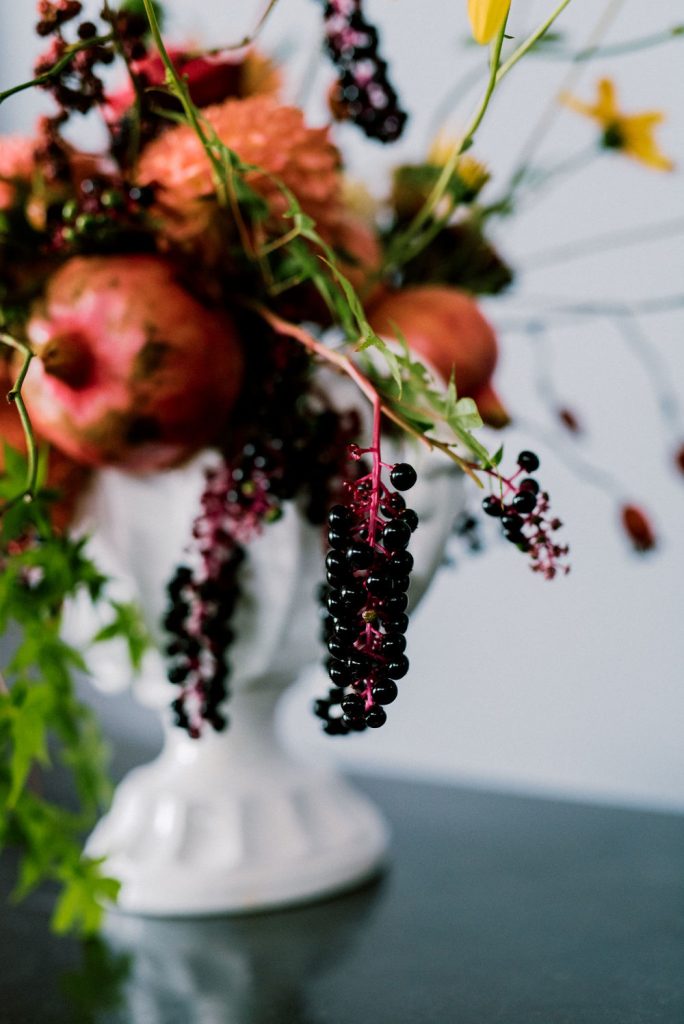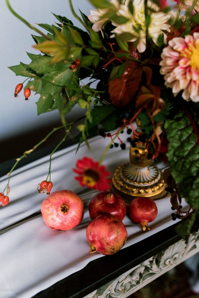 Pompon Dahlia, Cactus Dahlia, Amaranthus, Pomegranates, Acer crimson king and Rosehips were placed inside a copper-hued urn topped with pumpkins to celebrate the plethora autumnal vegetation brings about, while Pompon Dahlia, David Austin roses, Nandina Domestica, Aster Tataricus and Acer palmatum alluded to the sober classics of a refined indoor fete.