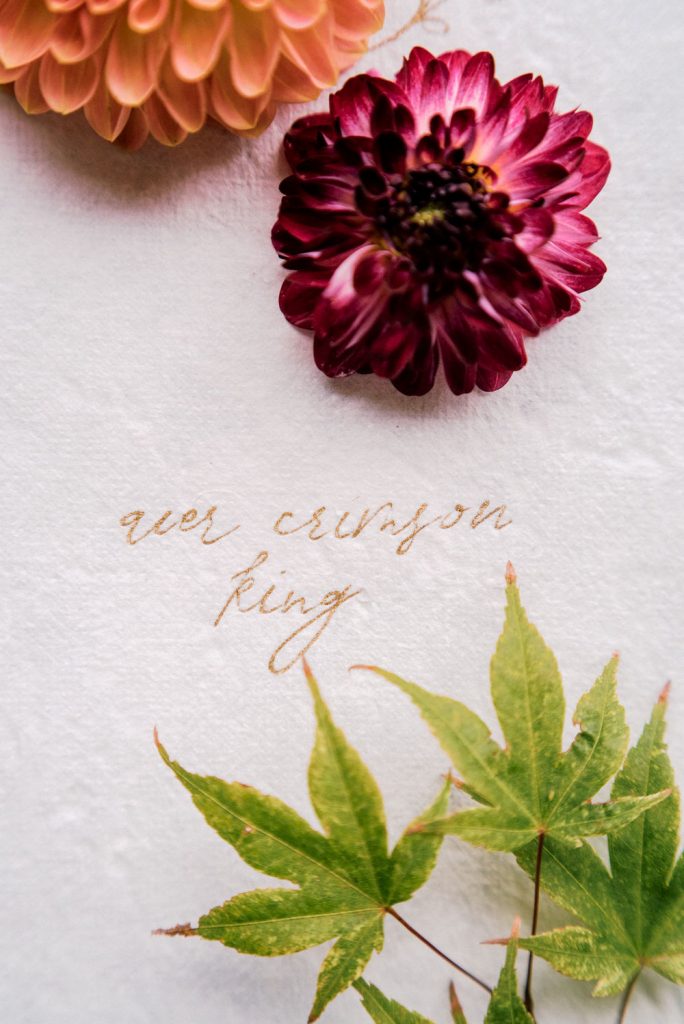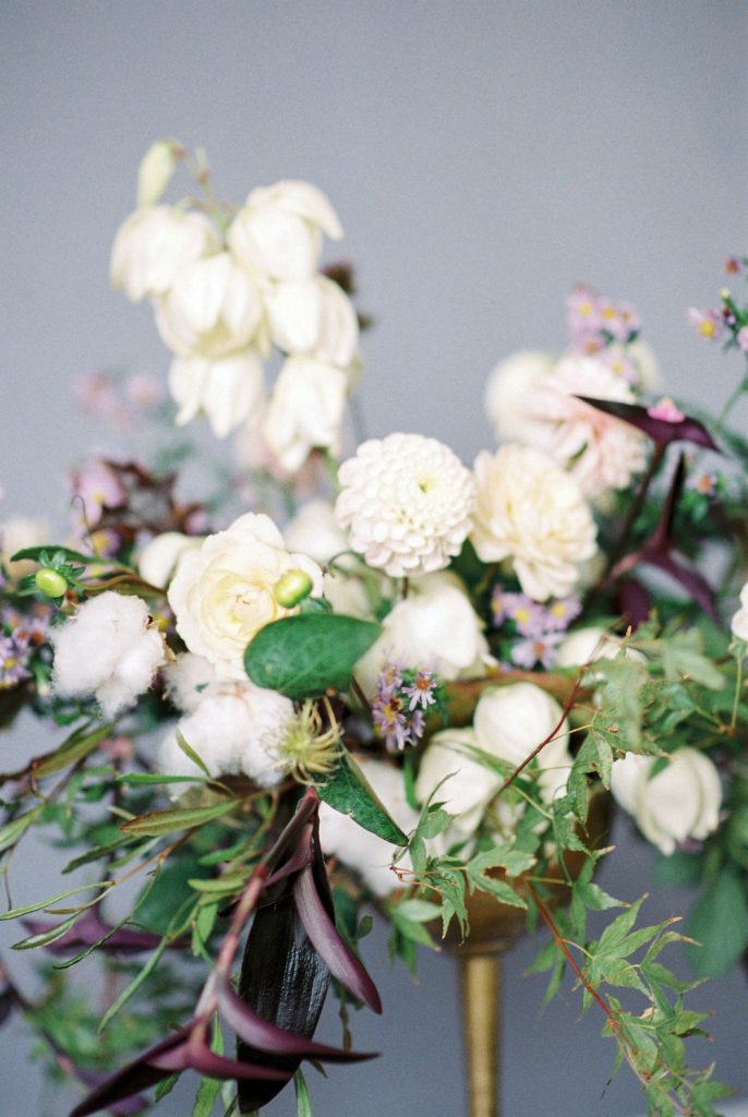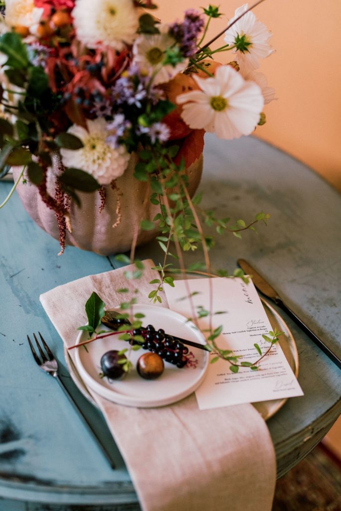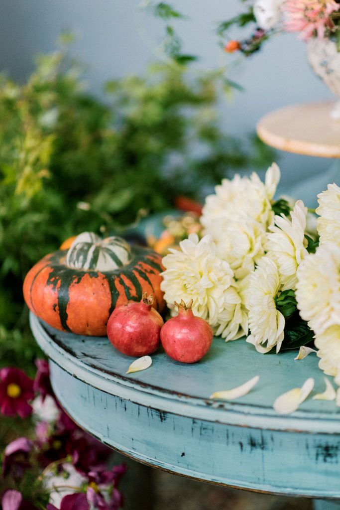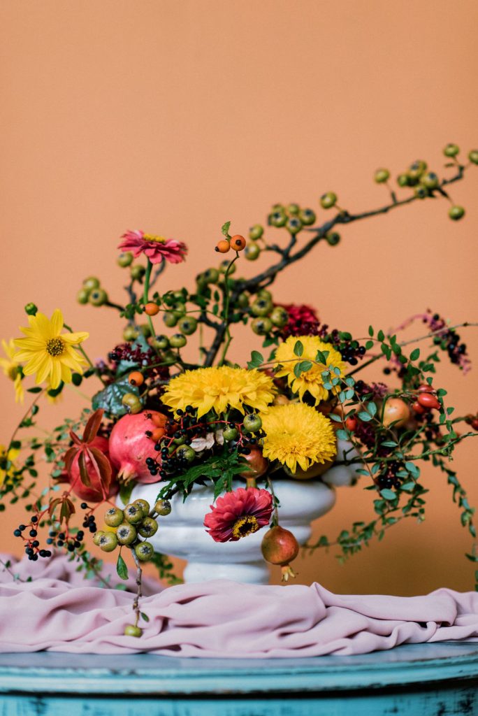 Pompon Dahlia, Cactus Dahlia, Amaranthus, Pomegranates, Acer crimson king and Rosehips were placed inside a copper-hued urn topped with pumpkins to celebrate the plethora autumnal vegetation brings about, while Pompon Dahlia, David Austin roses, Nandina Domestica, Aster Tataricus and Acer palmatum alluded to the sober classics of a refined indoor fete.