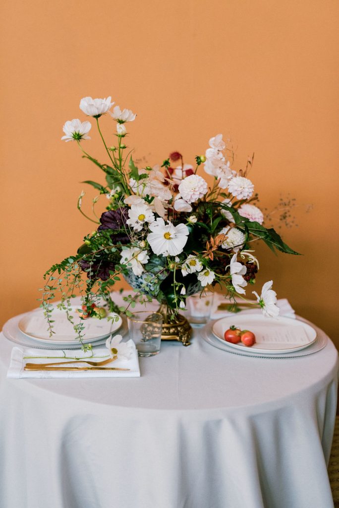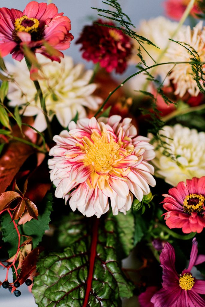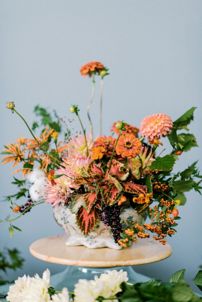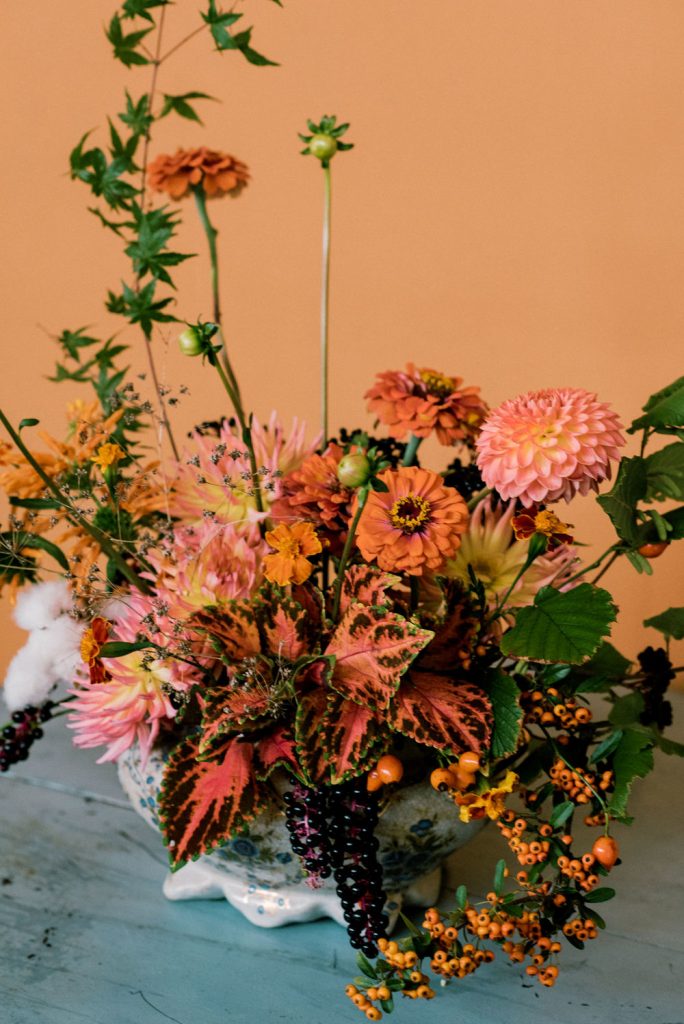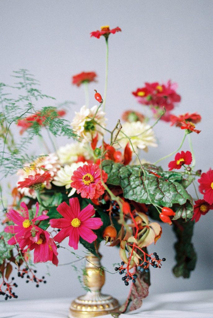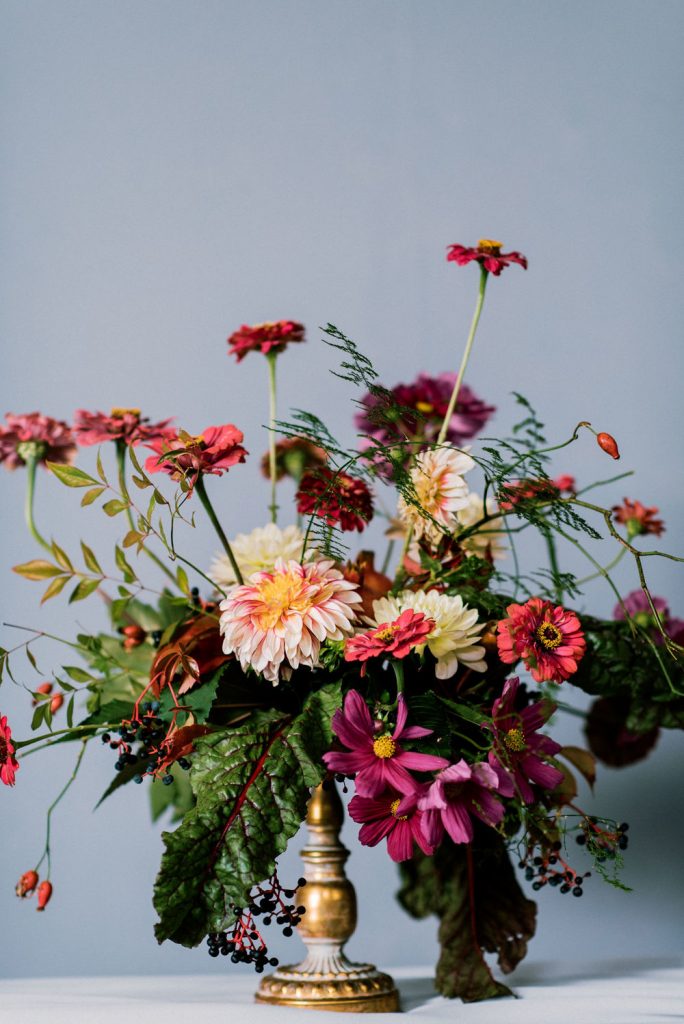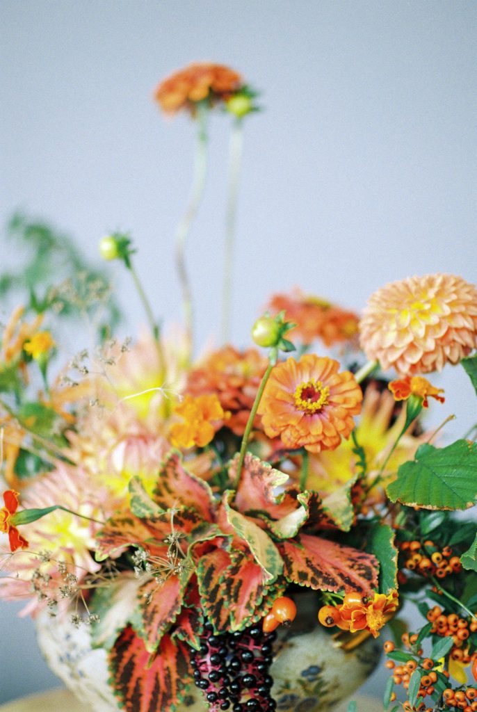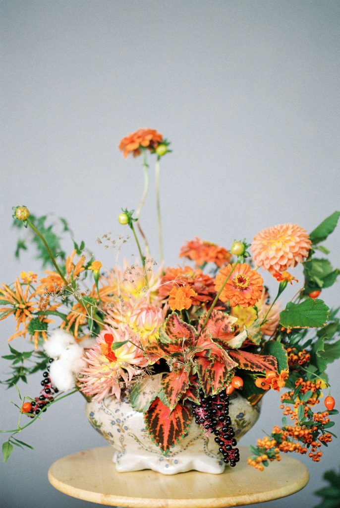 If Dutch Masters were to paint a centerpiece that would be a Delft vase topped with Zinnia, Cactus Dahlias, Tagetes erecta, Acer palmatu, and Gossypium hirsutism (cotton buds) or a stately city dinner iron pot complete with Cosmos, Pompon Dahlias, Lunaria, Nandina Domestica, and Rubus idaeus.