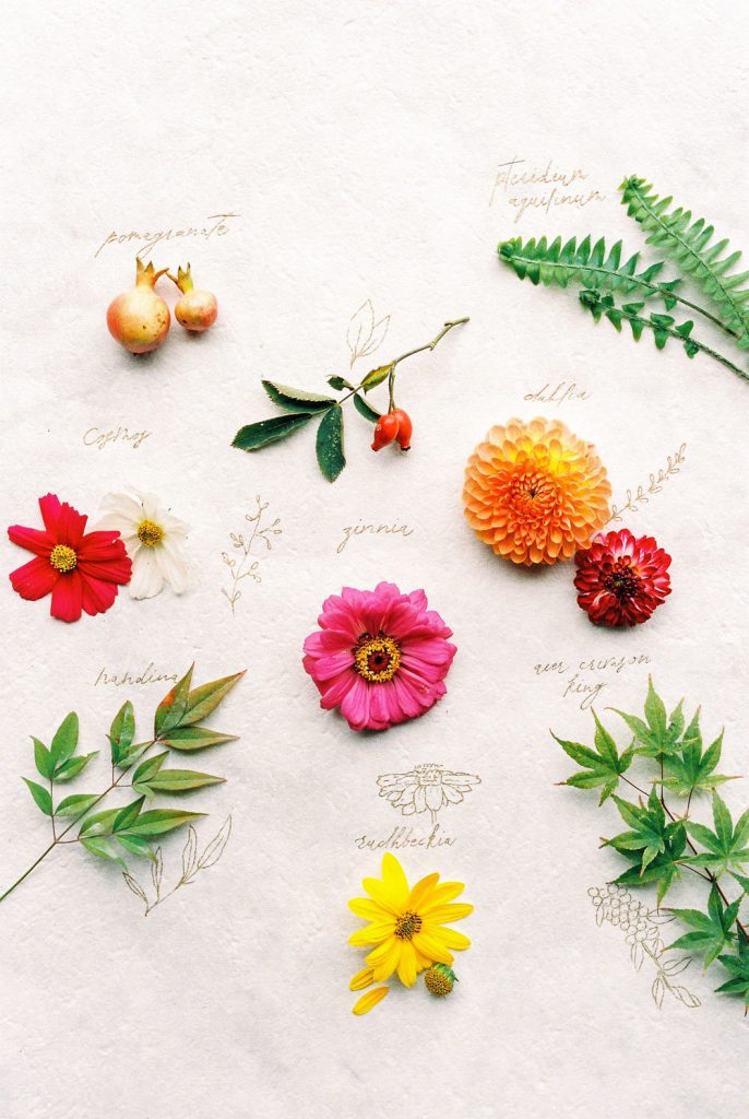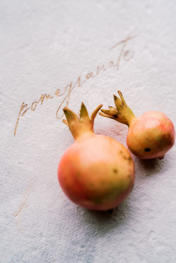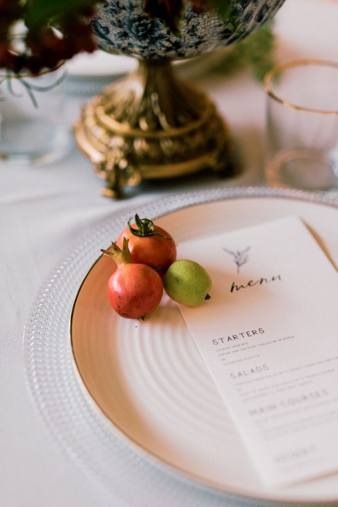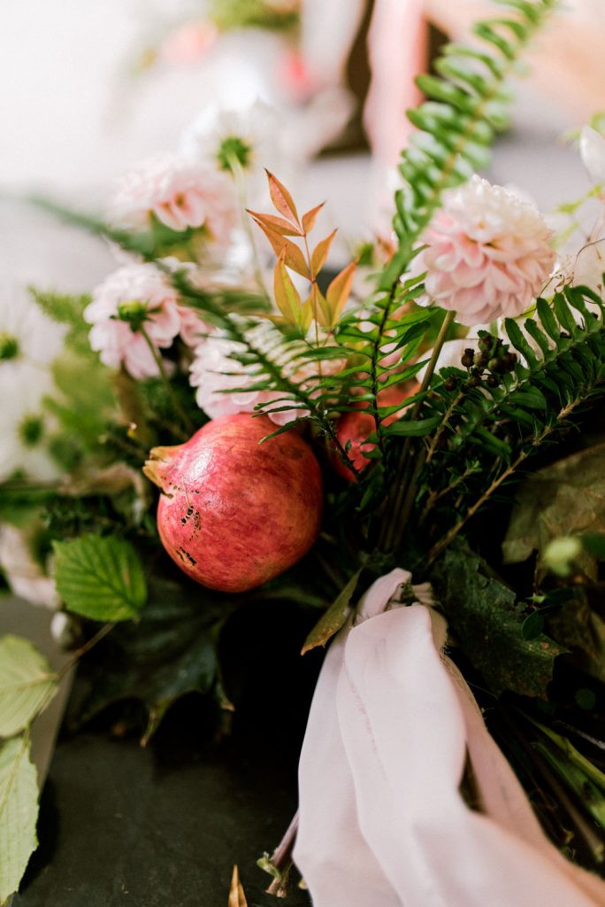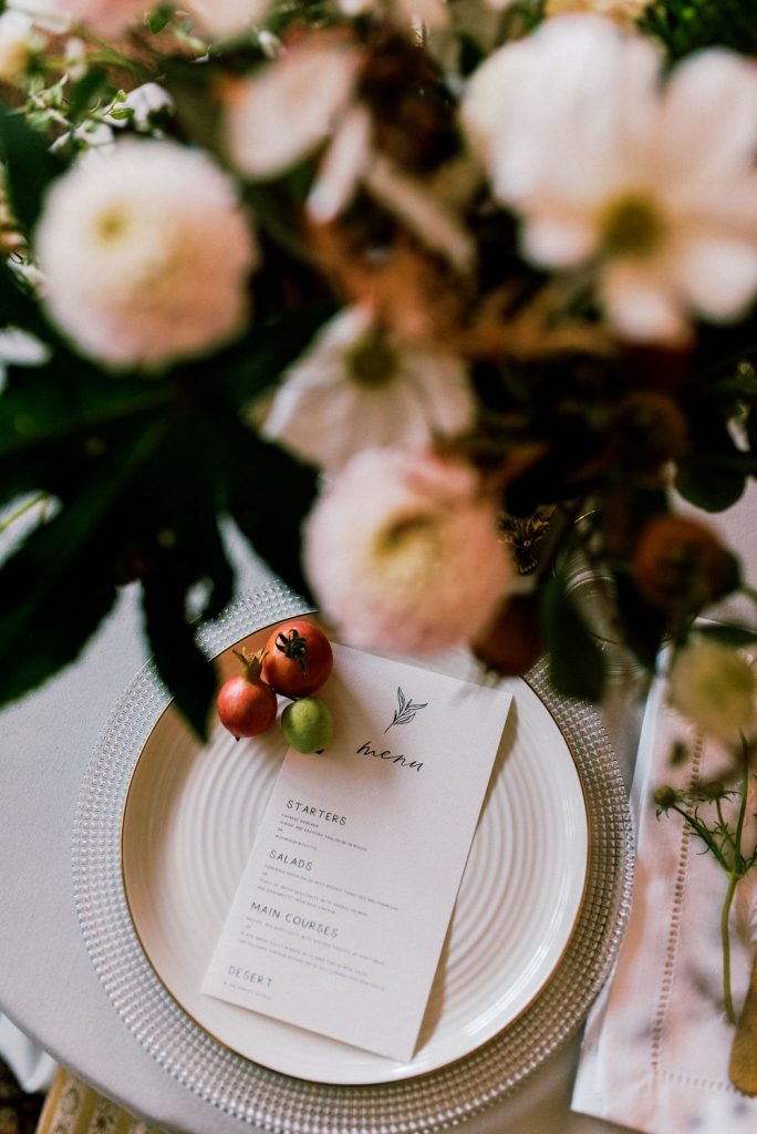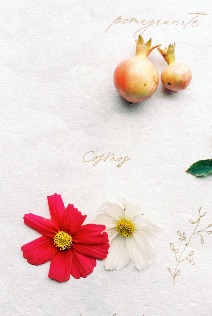 Αs centerpieces are not the only florals to crown a celebration, Maria combined blooms and spores from these arrangements to craft two different bouquets, one where classical whites turned bright with pops of color and a playful one combining shades of orange and pink. Manousenia apart from the elegant paper letterpressed menus also helped us create a floral compendium with selected seeds, fruit, and buds to add a stylish and creative nod to artificial wallpaper serving as a unique séparé that can be employed to divide a living room space while hosting.