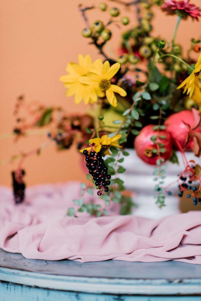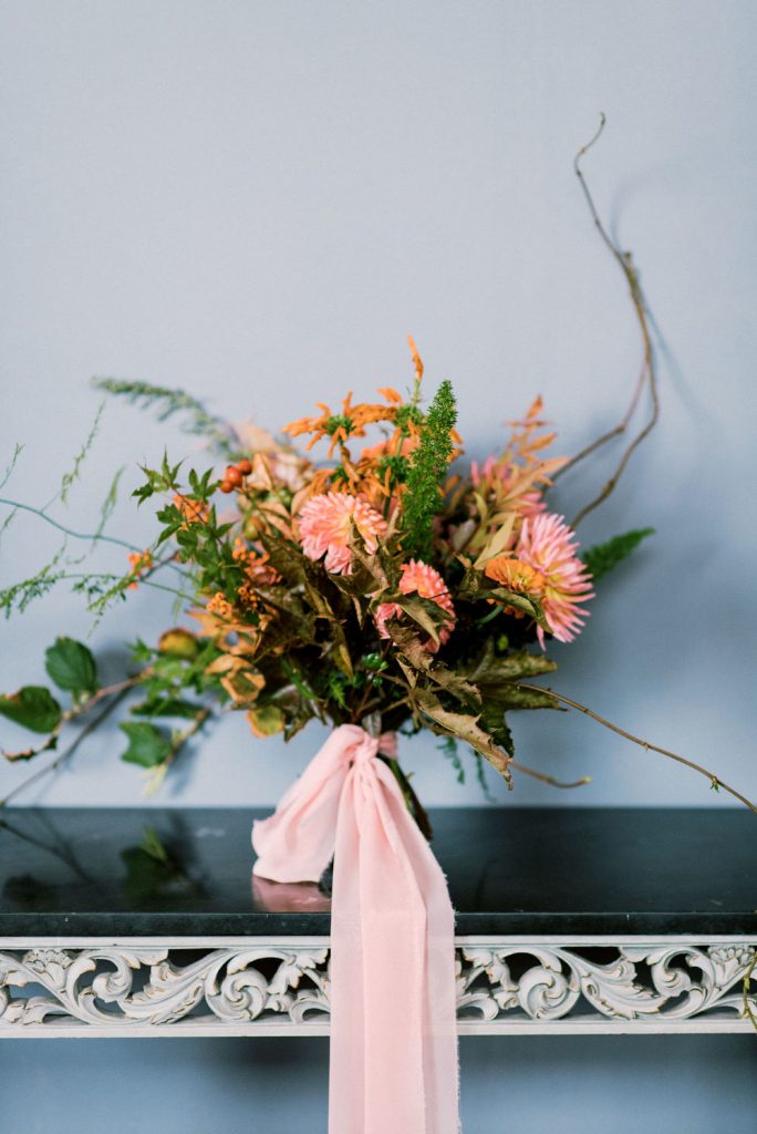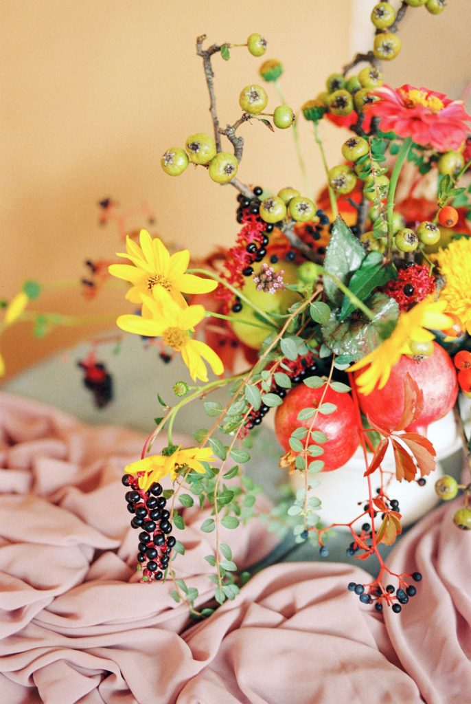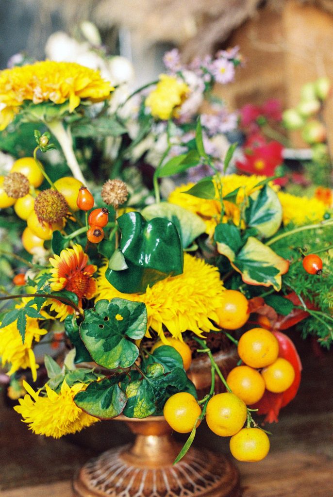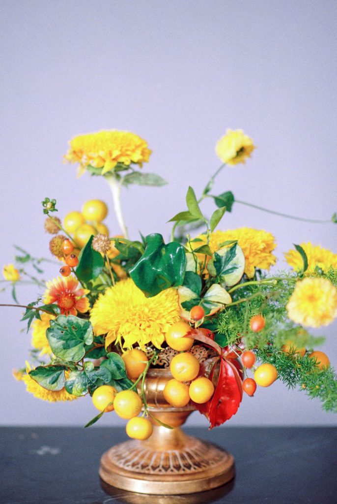 Painterly Decorative Dahlias, Tagetes erecta, Cosmos, Malus Domestica, and Ammi majus melded with quinces to give freshness a sensual twist. Pompon Dahlias, Citrus calamondin, Asparagus Dens. “Meyers”, Helianthus annuus and Rudbeckia became a nod to the bright auburn autumnal sunsets and our cozy nights by the fire.