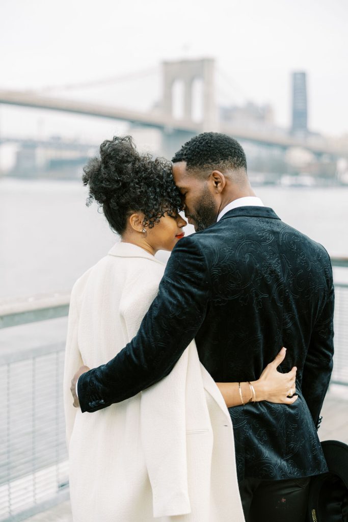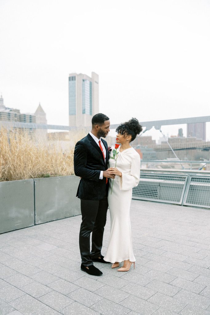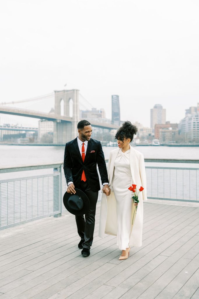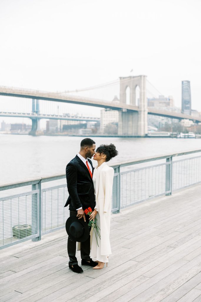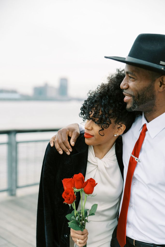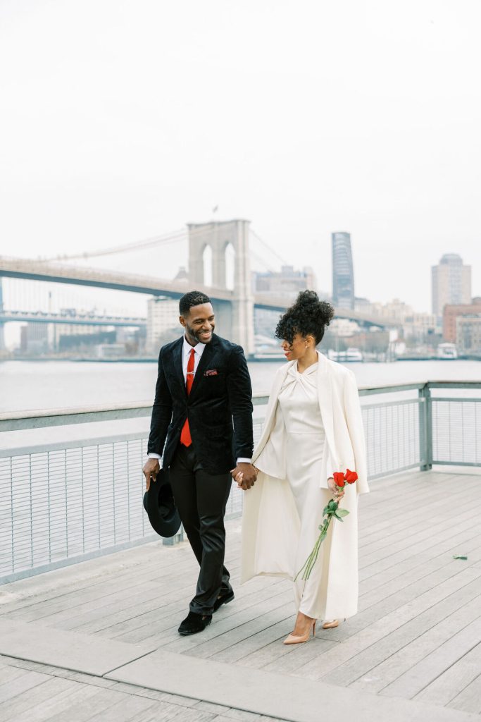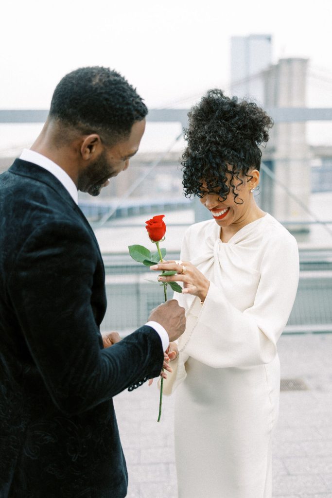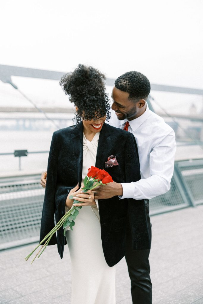 Against the backdrop of towering skyscrapers and the shimmering waters of the East River, they share a tender embrace, and Kevin offers red roses to his lady. Our talented photographer, George Liopetas, follows them quietly and against this picturesque backdrop, the couple pauses for their first photo, their smiles radiant with happiness.