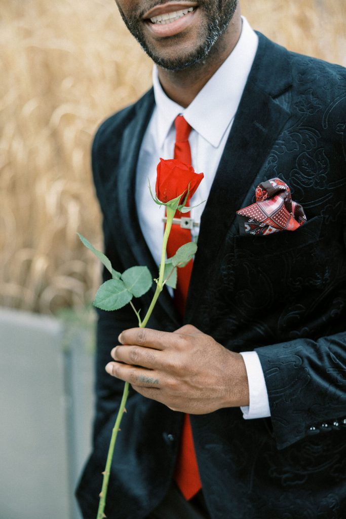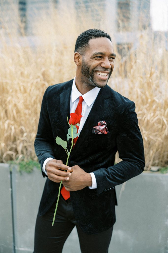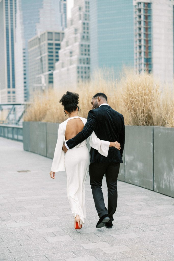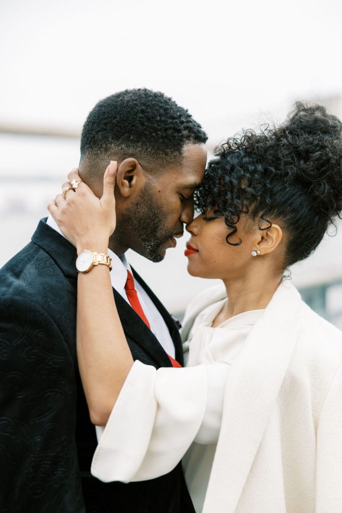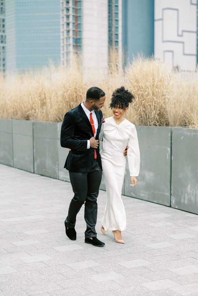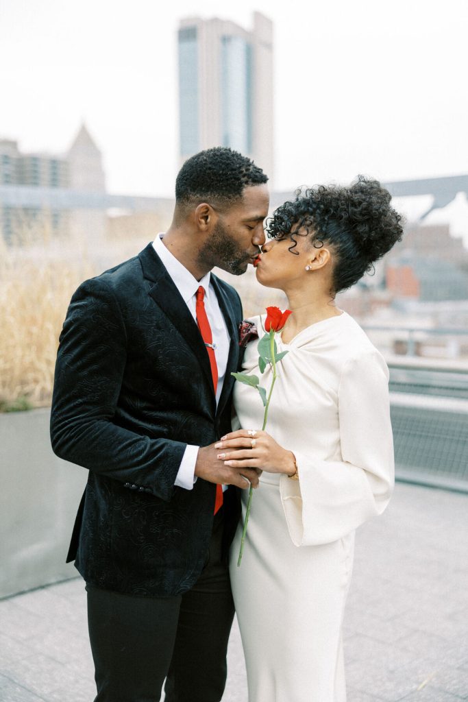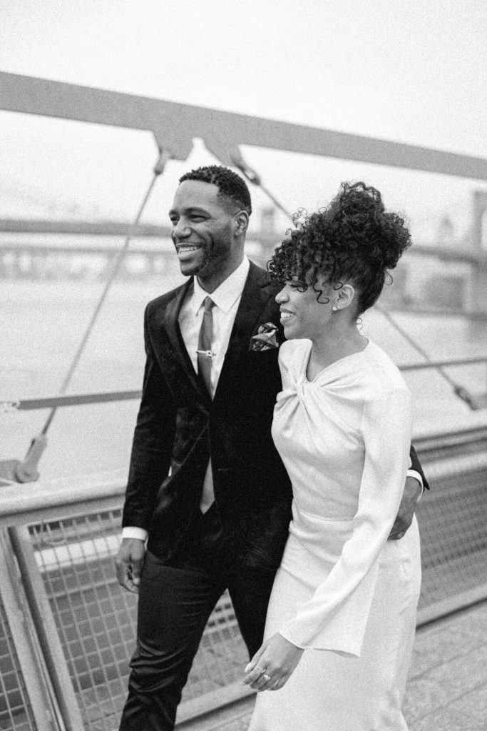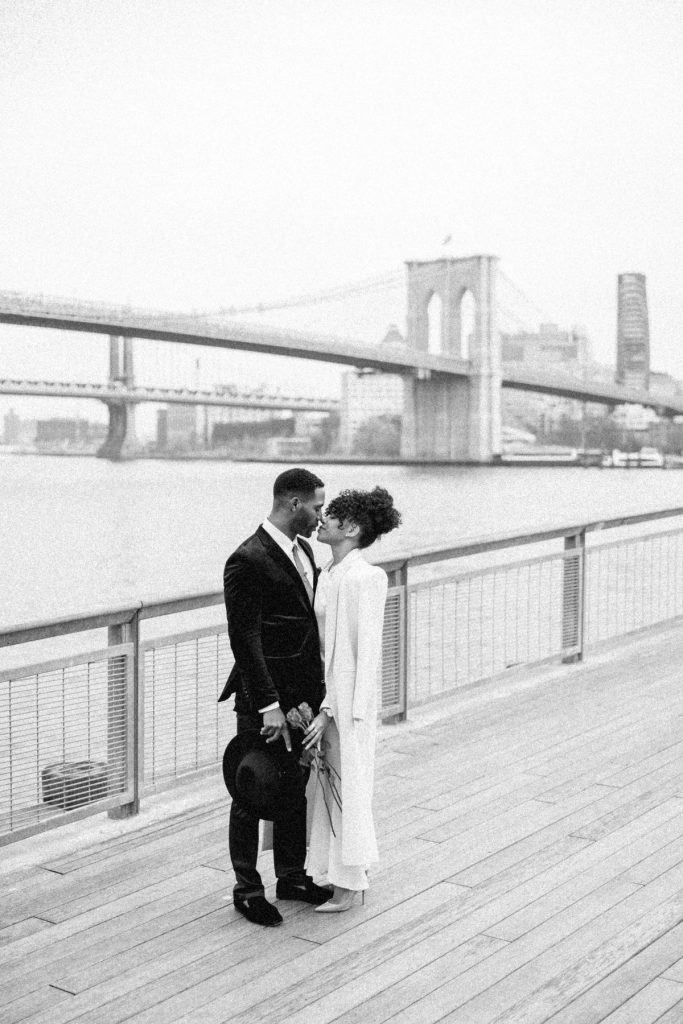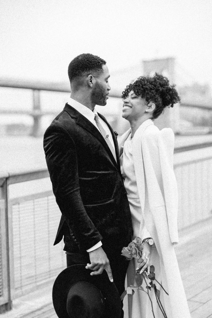 Against the backdrop of towering skyscrapers and the shimmering waters of the East River, they share a tender embrace, and Kevin offers red roses to his lady. Our talented photographer, George Liopetas, follows them quietly and against this picturesque backdrop, the couple pauses for their first photo, their smiles radiant with happiness.