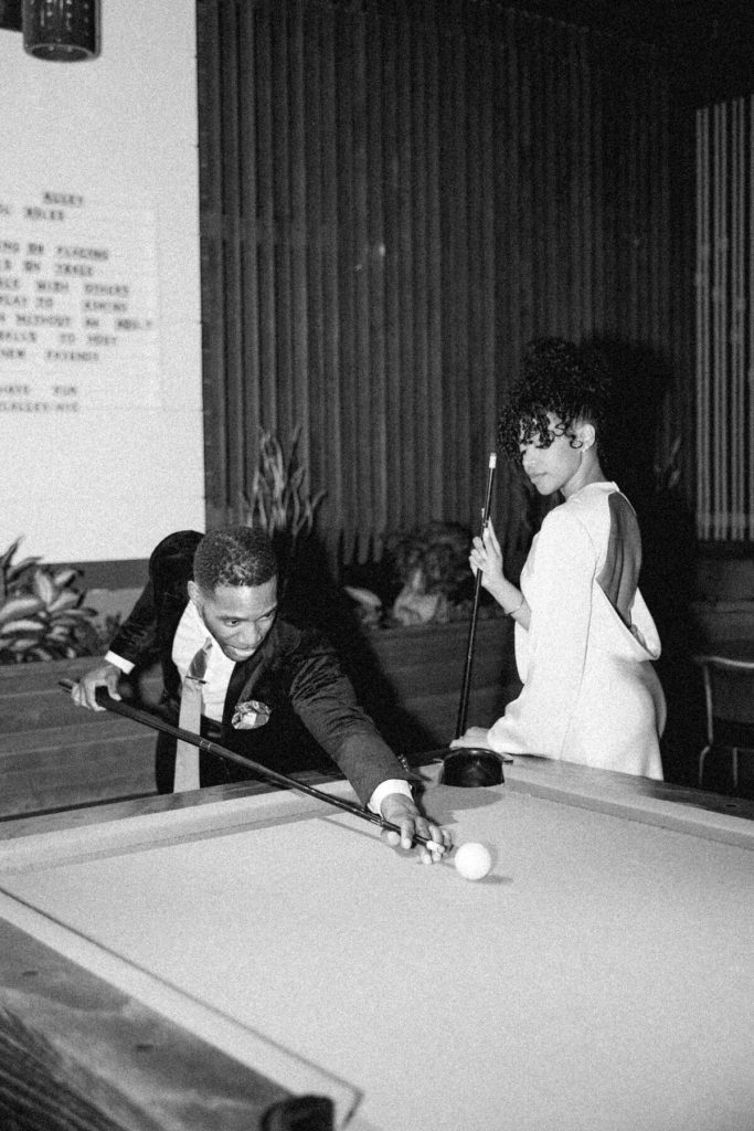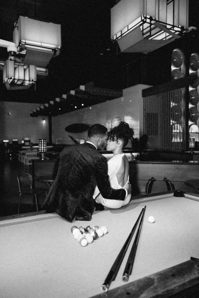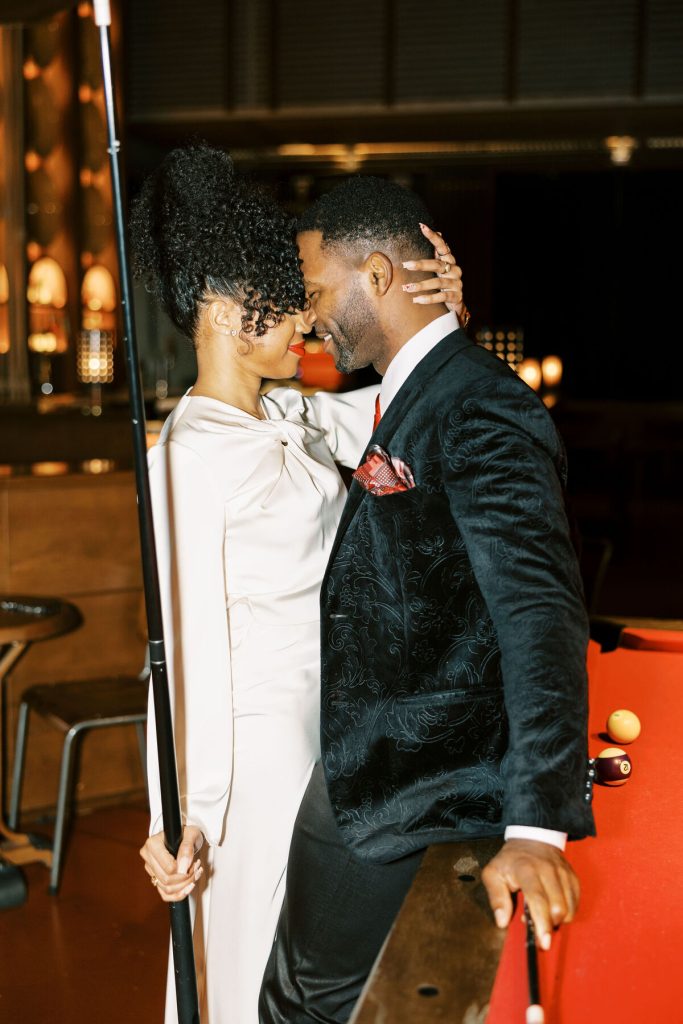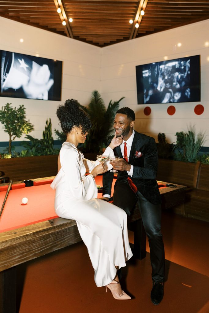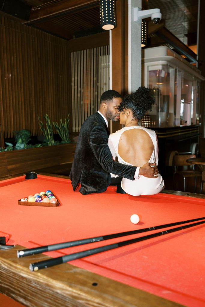 As the evening falls, they indulge in artisanal cocktails, each sip a toast to their love and the adventures they've shared together. The photographer captures the glint of mischief in their eyes as they playfully tease each other and candid moments as they try to start a pool table game!